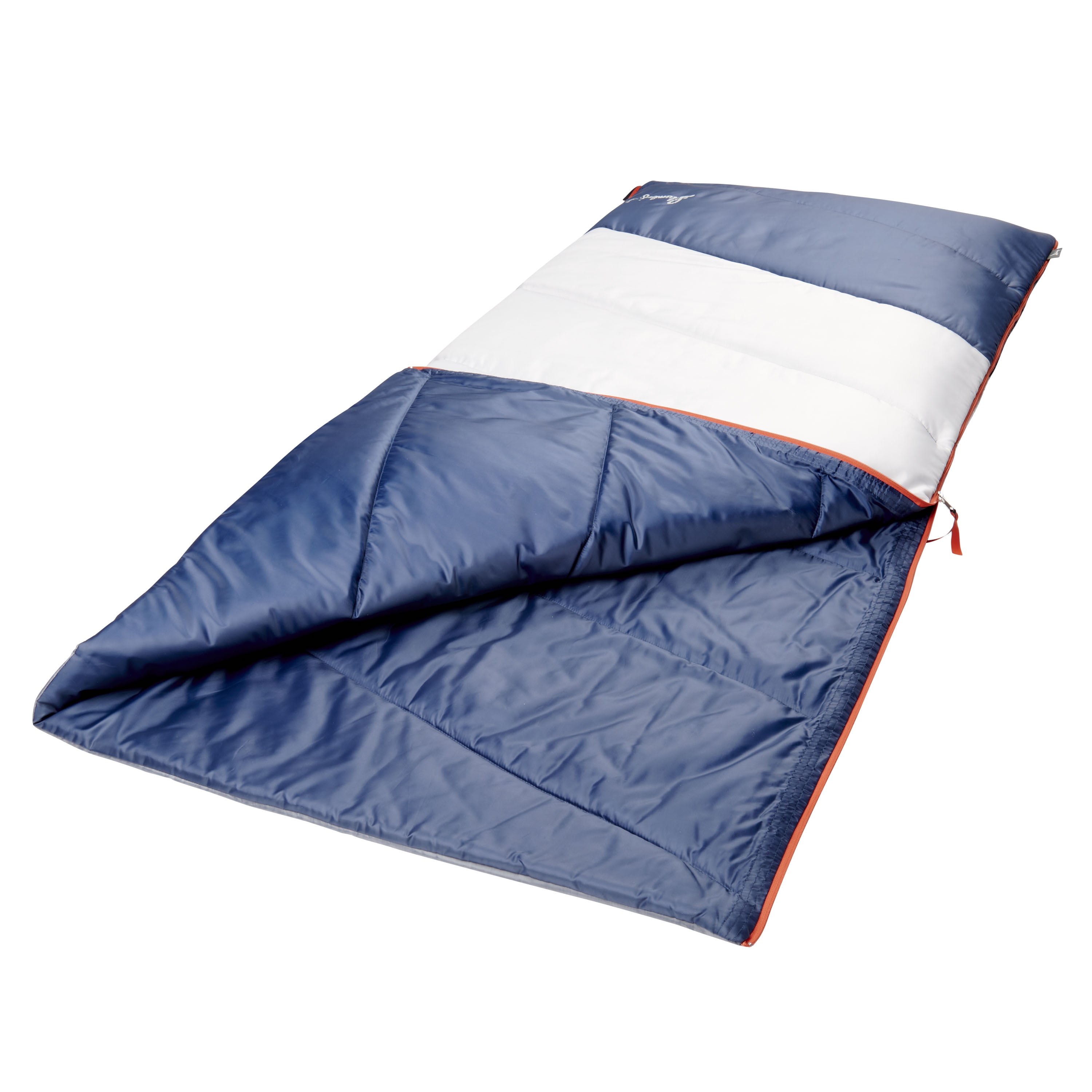 Slumberjack Sky Lake 40 F Rectangular Sleeping Bag: Perfect for fair weather camping Breathable and soft outer shell and liner fabrics provide ultimate comfort Insulated with lightweight, premium down-alternative fill for warmth, comfort, and compressibility Quilted design keeps fill in place and eliminates cold spots Draft tube with anti-snag keeps out the cold and ensures a smooth, fuss-free zipper experience Double-sliding zippers make it easy to enter and exit the sleeping bag while offering ventilation options Includes a stuff sack with compression straps for easy packing and space savings Machine washable for easy care Dimensions: 33″ W x 75″ L Weight: 2 lbs. 10 oz Model No.: 952824221-WM