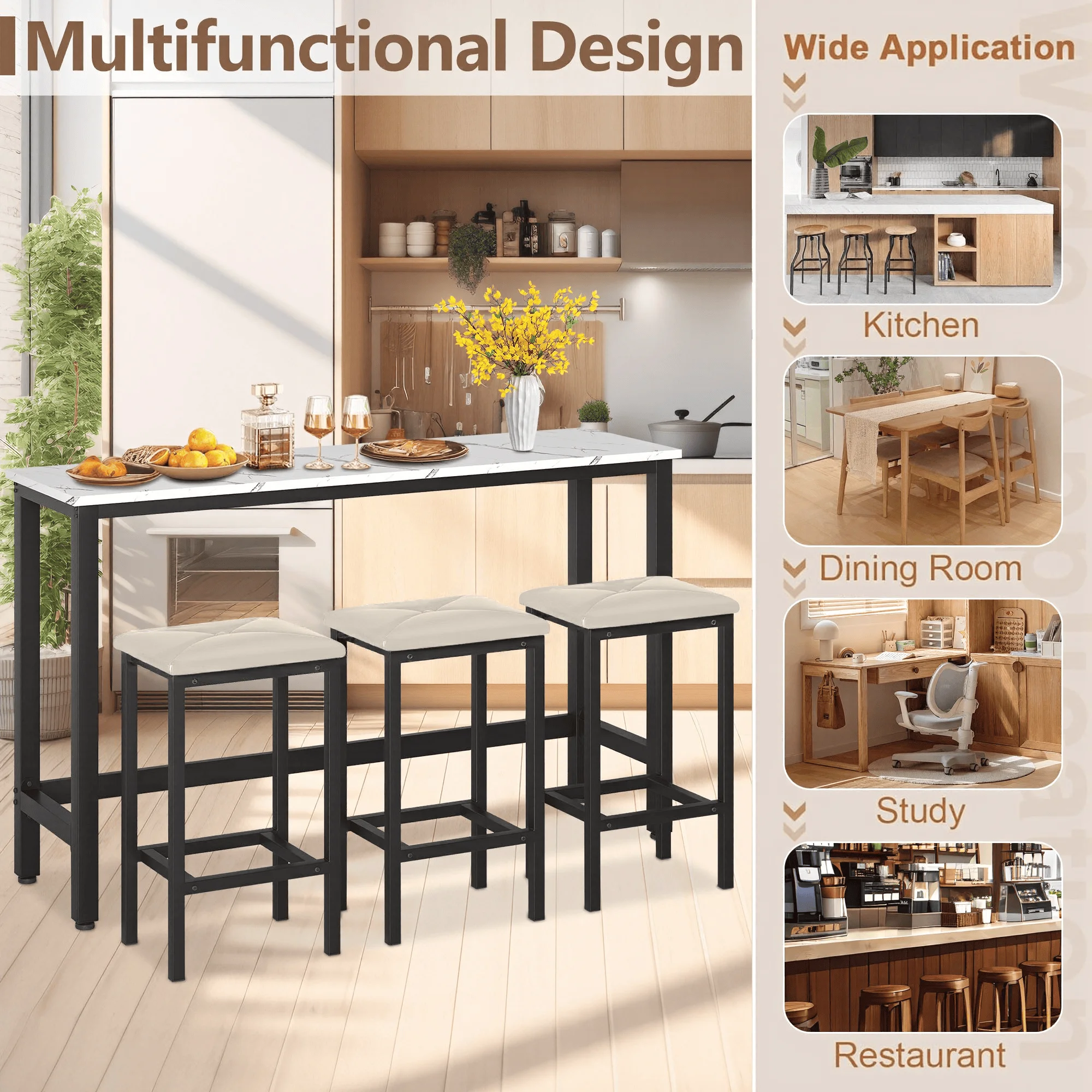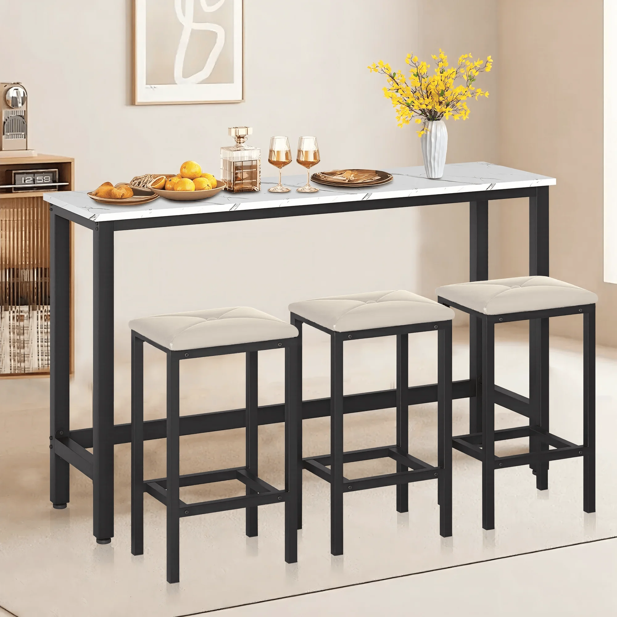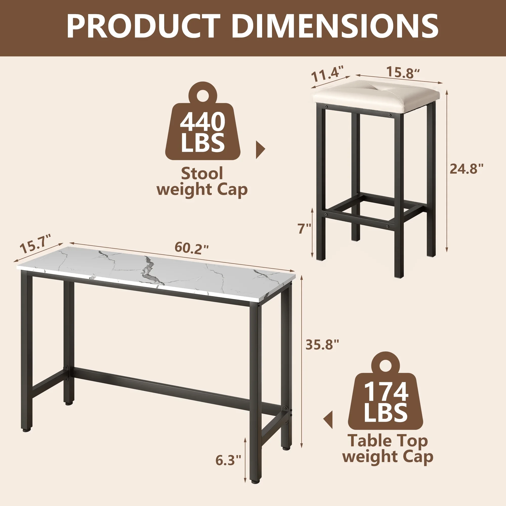 Modern dining room table set, giving you the most impressive dining experience. Made of thick MDF and metal, sturdy and durable; elegant brown or white finish, perfectly integrated into your home; creative extended dining table design, stylish and beautiful; bar table set with 3 stools with footrest, dining more comfortable. Counter height table set creates a romantic bar area for your home, and feel the beauty of life with your family and friends. 1. Rich Modern Flavor The dining table set follows the concept of simplicity, using straight lines, smooth lines, and the overall shape is simple and grand; the high top table surface has a unique wood grain, combined with brown or white finishes, pub table set will complement your furniture and show your extraordinary taste. 2. High-end Material The table board of the dining table is made of thick E1 grade particleboard, which has uniform density, high temperature resistance, and is not easy to deform; heavy metal supports the dining table and stool firmly, which is durable and has a service life of several years. 3. Comfortable Dining Everyone likes the feeling of completely relaxed and comfortable dining. Our high counter height table design leave plenty of space for the legs, even for tall people. Both tables and stools are designed with footrest. When you have a meal or drink, feet can be placed on the footrest, which will be very relaxing and comfortable. 4. Dining Table Set for Small Spaces Tall bistro table set is compact in design, enough for 3 people to share a meal. When not in use, the 3 stools can be neatly stored at the bottom of the table, which makes it very suitable for small rooms like apartments, studios or kitchenettes. 5. Not Only Dining Table Due to lengthened design, the length reaches 60.24 inches, you can place high top table as a side table at the entrance or porch, used to place objects or put on vase decoration, add more charm to your home. 6. Wide Range of Uses There is no doubt that this elegant and creative bistro table set will add stylish atmosphere, matching any style, widely used in your home restaurant, kitchen, living room, and even coffee shops, bars, pubs, restaurants, will give people left deep impression. Specifications: Product Name: Counter Height Dining Table Set Material: Metal (Frame) + MDF Panel Color: Brown Additional Tools Required: All Tools Included Overall Product Dimension Table (Overall): 60.24″L x 15.75″W x 35.43″H inch Stool (Overall): 14.76″L x 11.61″W x 24.41″H inch Overall Weight Net Weight for Kitchen Table: 36.60 lbs Net Weight for Stool: 7.50 lbs Weight Capacity Table Weight Capacity: 174 lbs Stool Weight Capacity: 440 lbs Package Includes: 1 x Bistro Table 3 x Stools 1 x Instruction