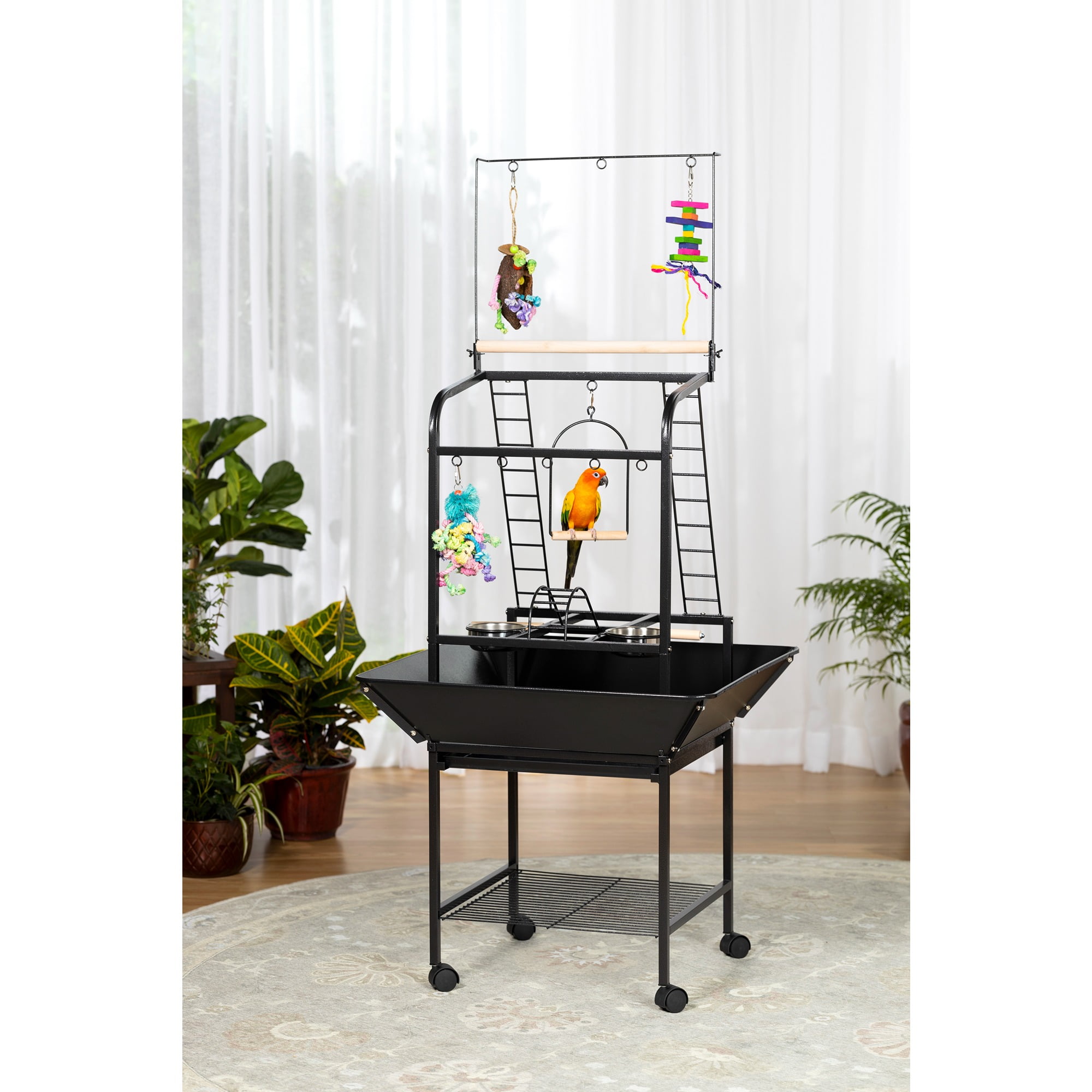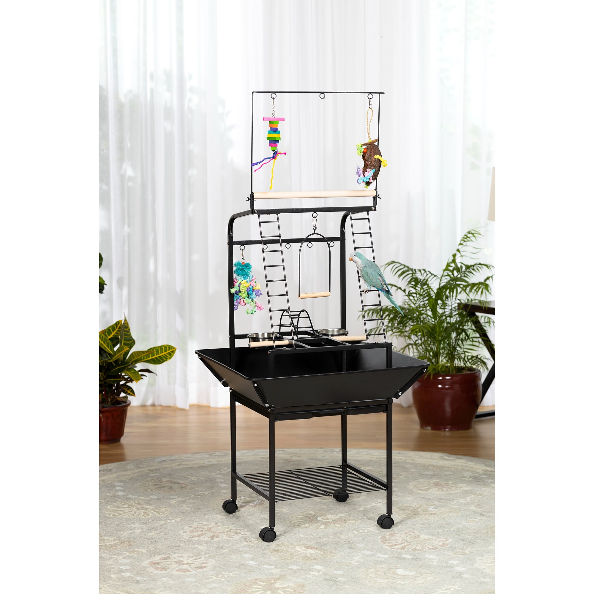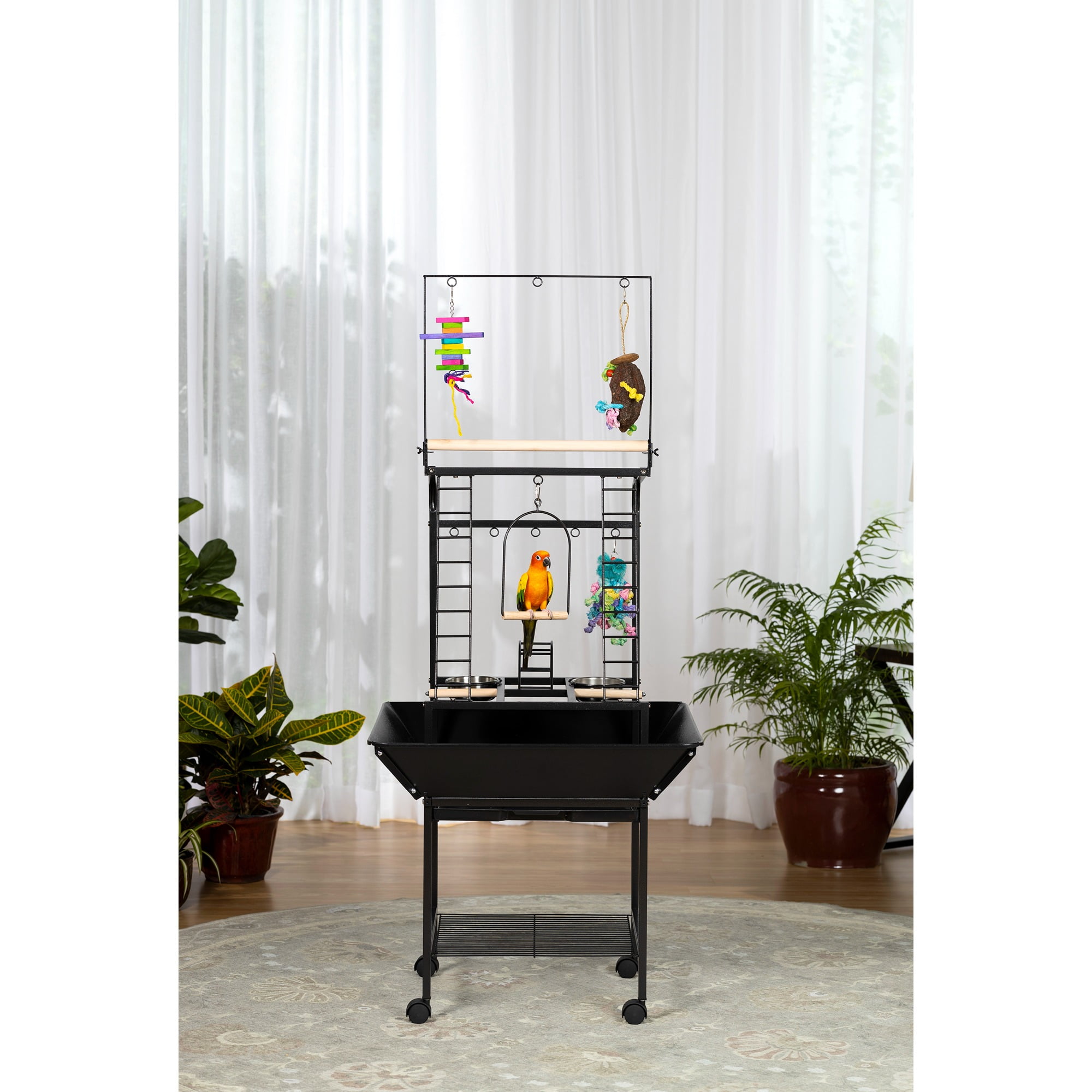 Eight toy hoops for hanging a variety of treats & toys Multiple activity areas, including ladders, perches, and swing Removable grille in the base interior, and removable debris tray for easy cleaning Playstand base features integrated storage shelf and easy-rolling casters Model NO : 3181 Small Parrot Playstand