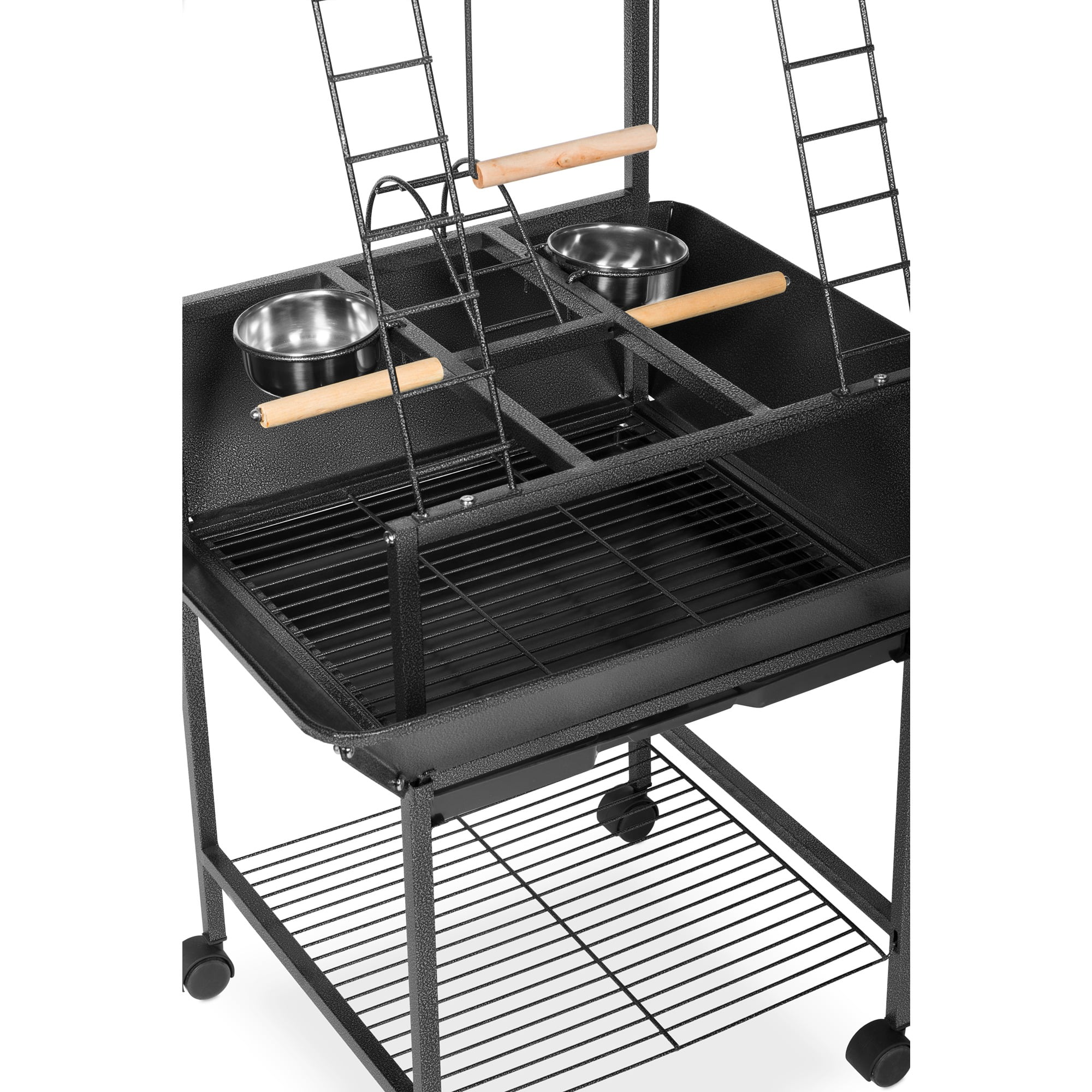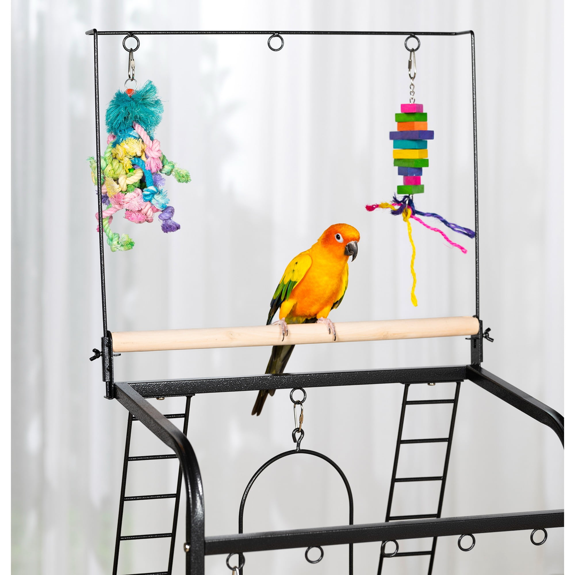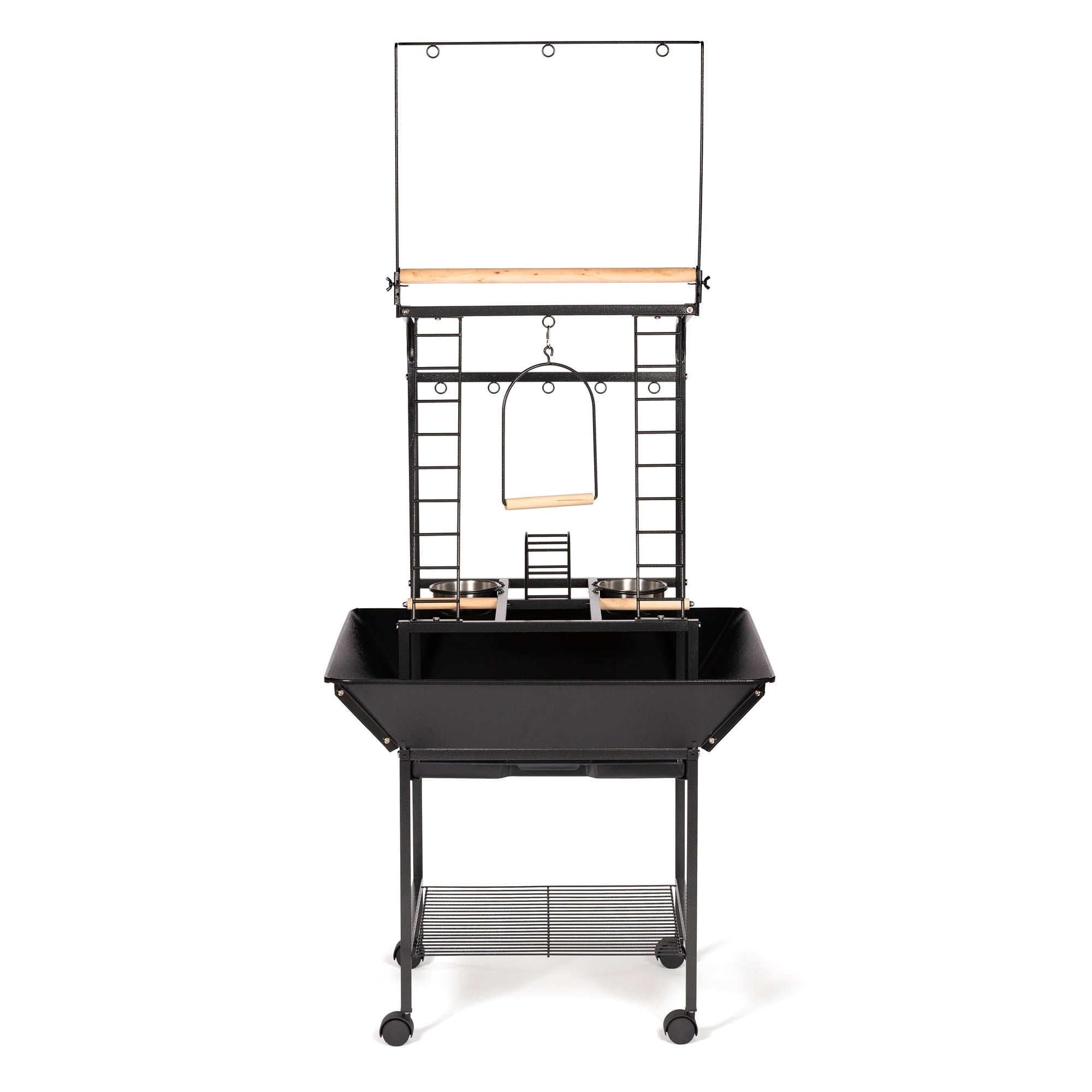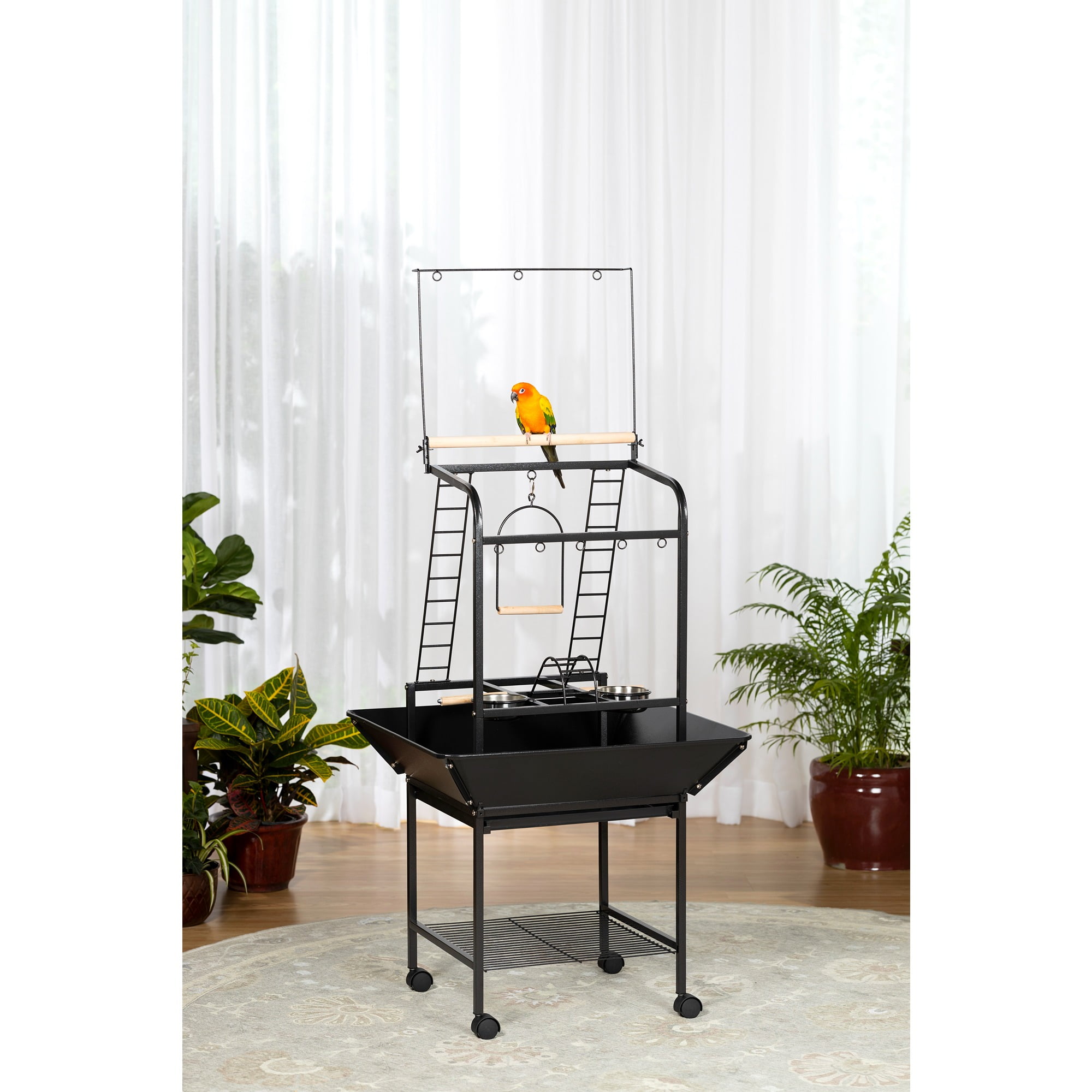 Eight toy hoops for hanging a variety of treats & toys Multiple activity areas, including ladders, perches, and swing Removable grille in the base interior, and removable debris tray for easy cleaning Playstand base features integrated storage shelf and easy-rolling casters Model NO : 3181 Small Parrot Playstand