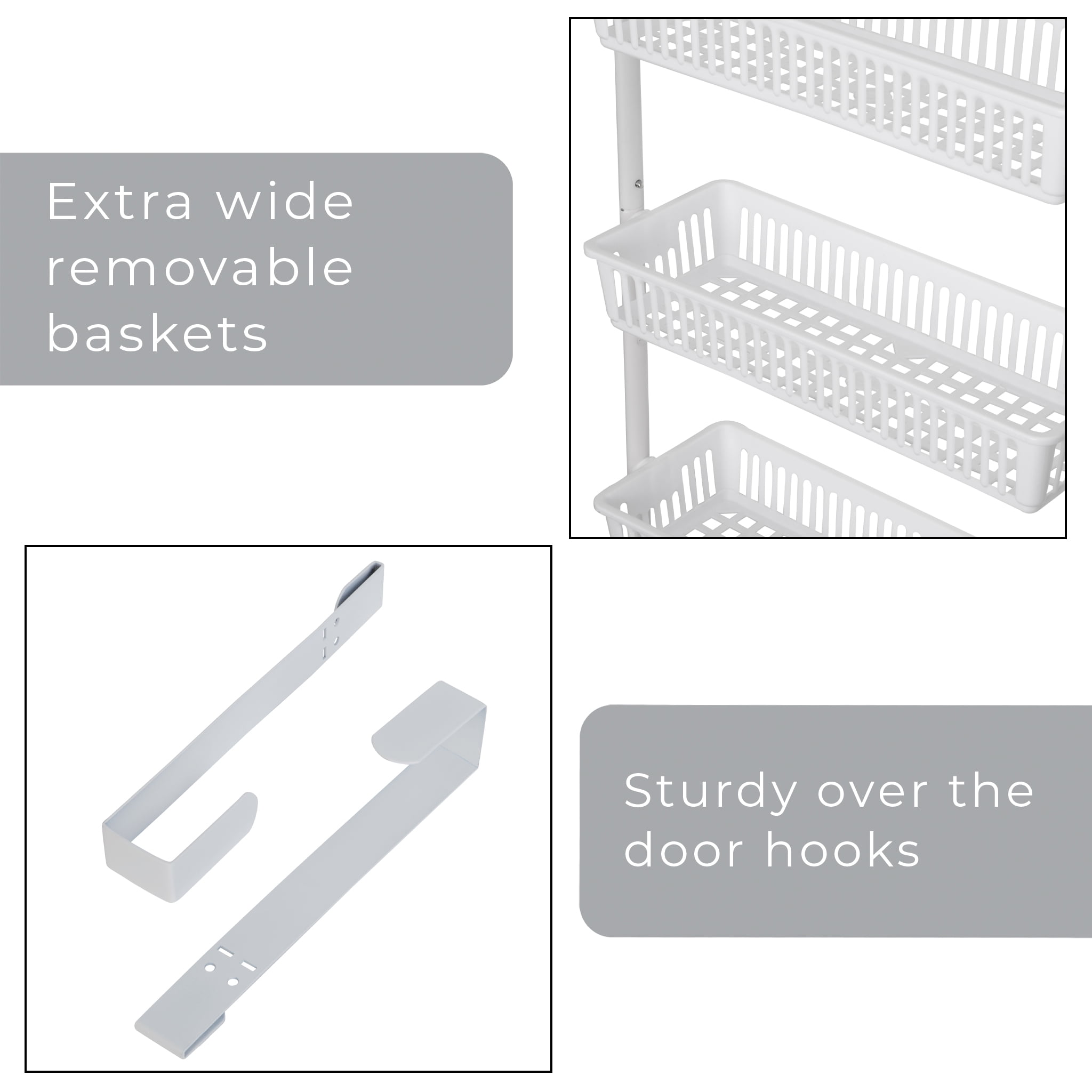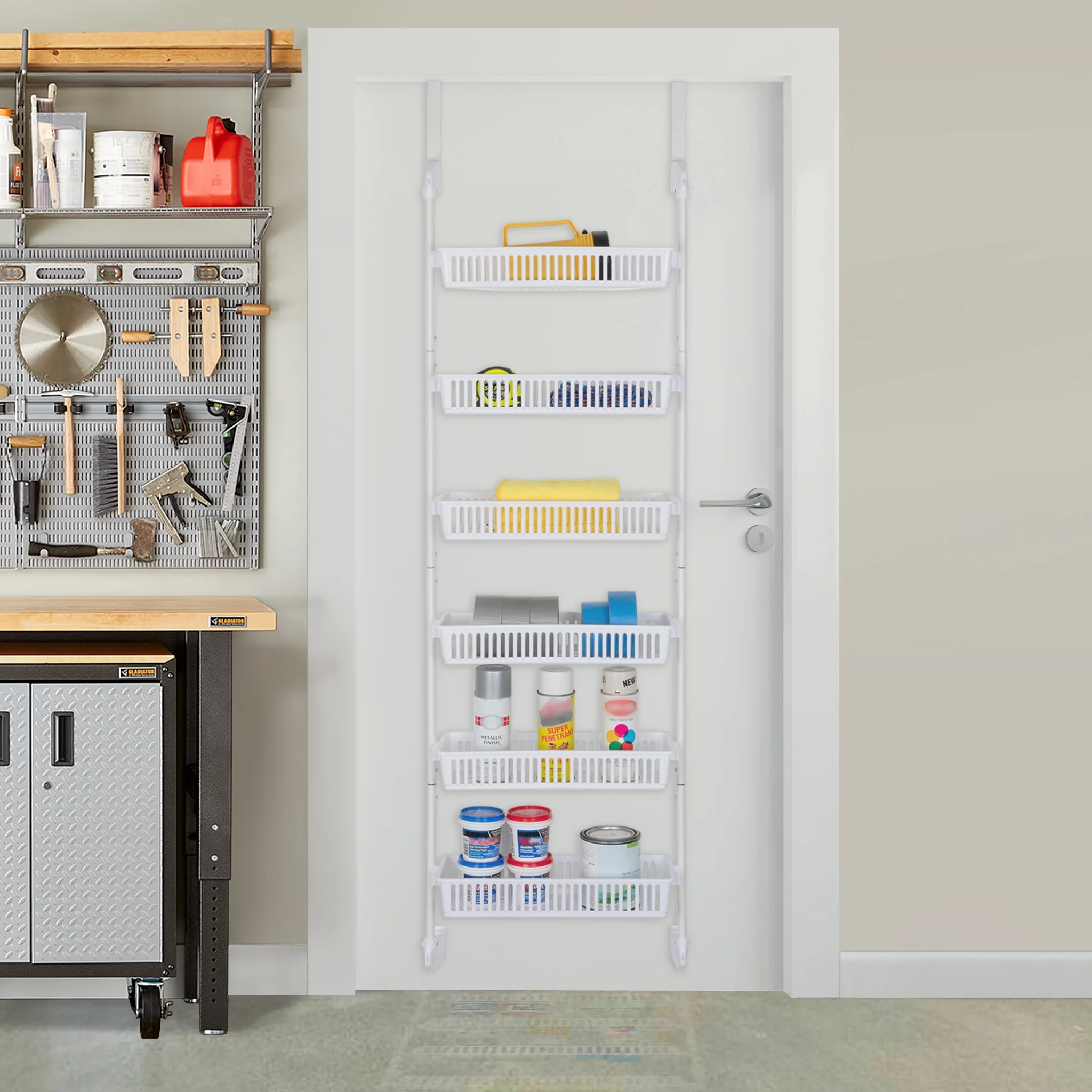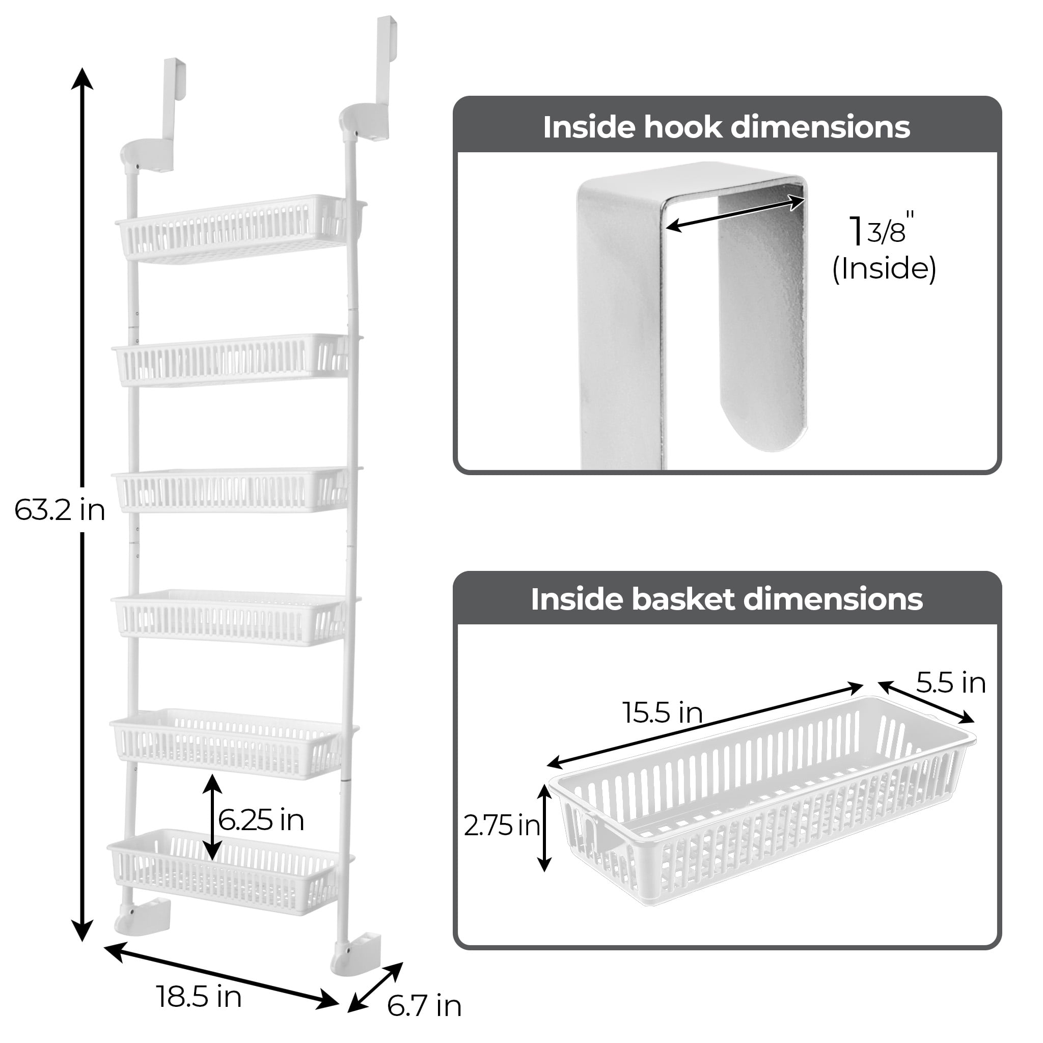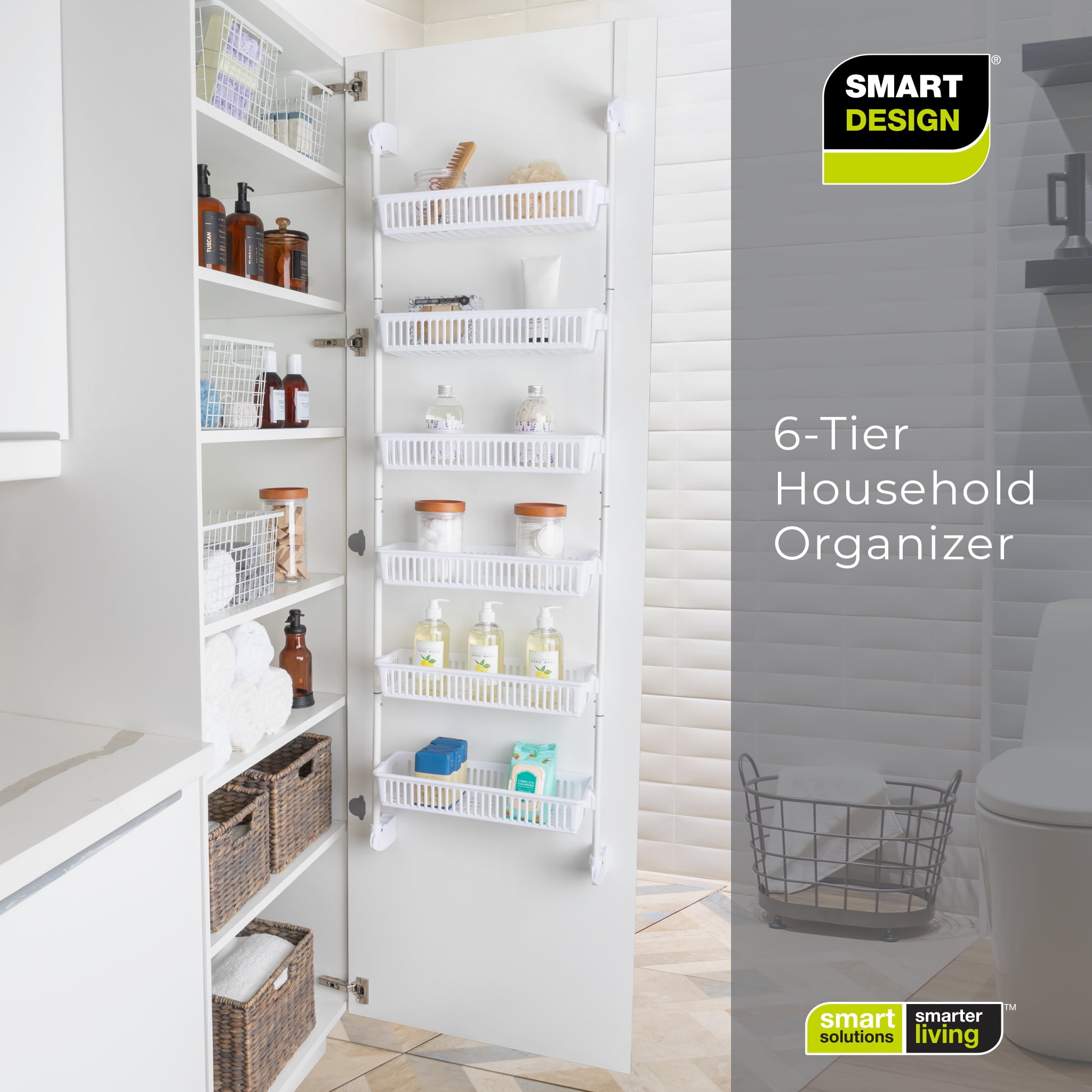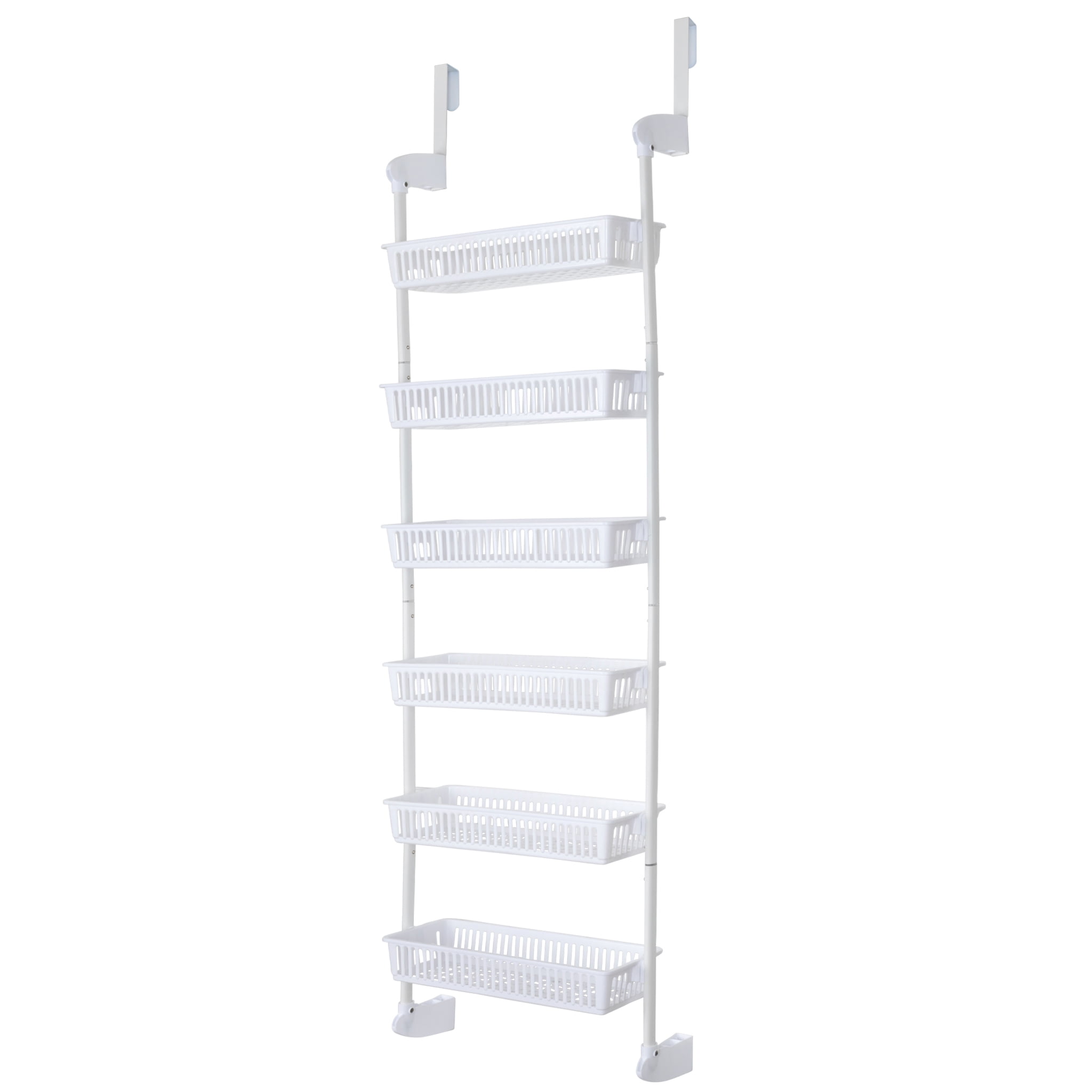Smart Design Large Over-The-Door 6-Tier Basket Pantry Organizer [White] The 6-Tier Over-The-Door Pantry Organizer is quick and easy to setup. Hangs over the door with the included sturdy hooks to fit almost any residential or commercial door. Six rows of adjustable shelving allows you to adapt the baskets to the desired height and has large capacity baskets for all your storage needs A sturdy steel frame design and rustproof finish along with resin baskets makes this a great multi-use storage solution.