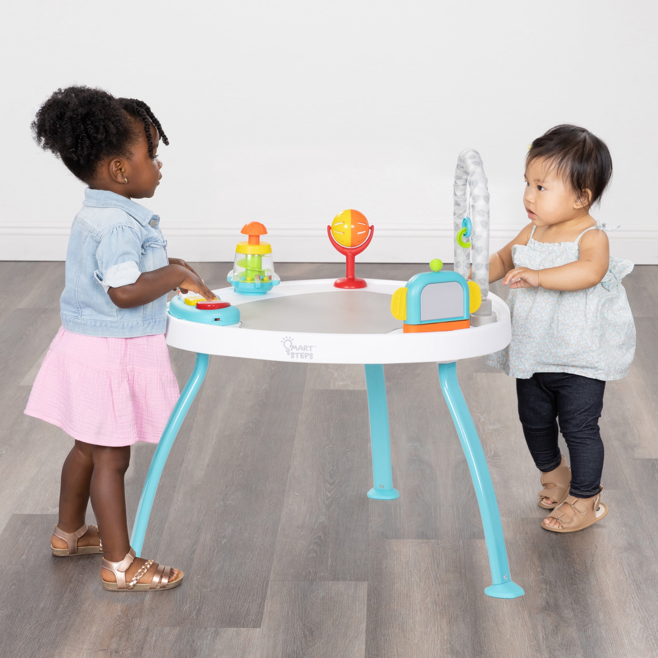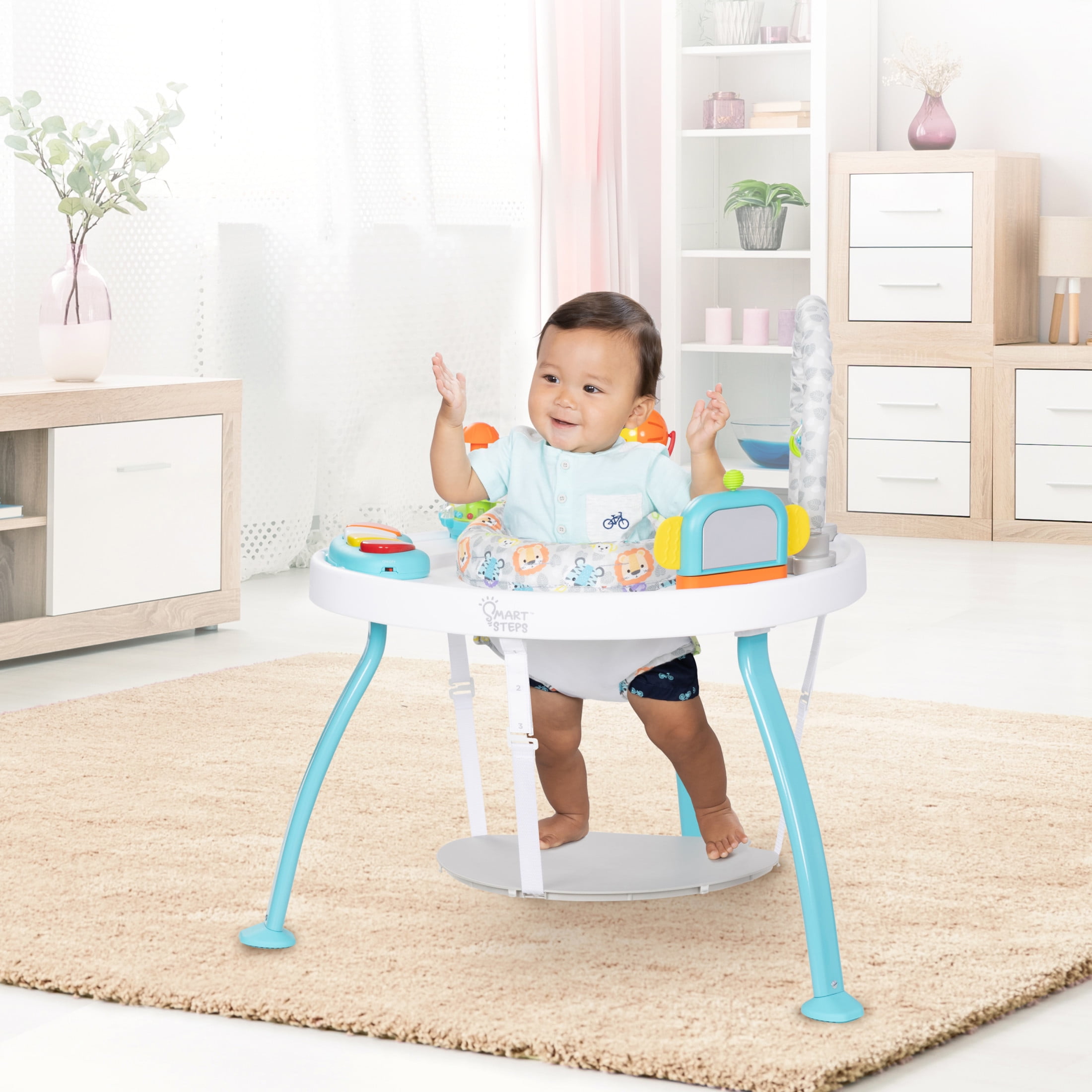 Converts from Activity Center, to Activity Play Table, and to a Flat Table Includes four unique STEM toys that can be taken on-the-go and are interchangeable with other Smart Steps activity products Includes bouncing board with three different positions Seat can move 360 degrees, giving baby motion and a wide range view Musical keyboard plays different melodies Unique three-leg design for stability