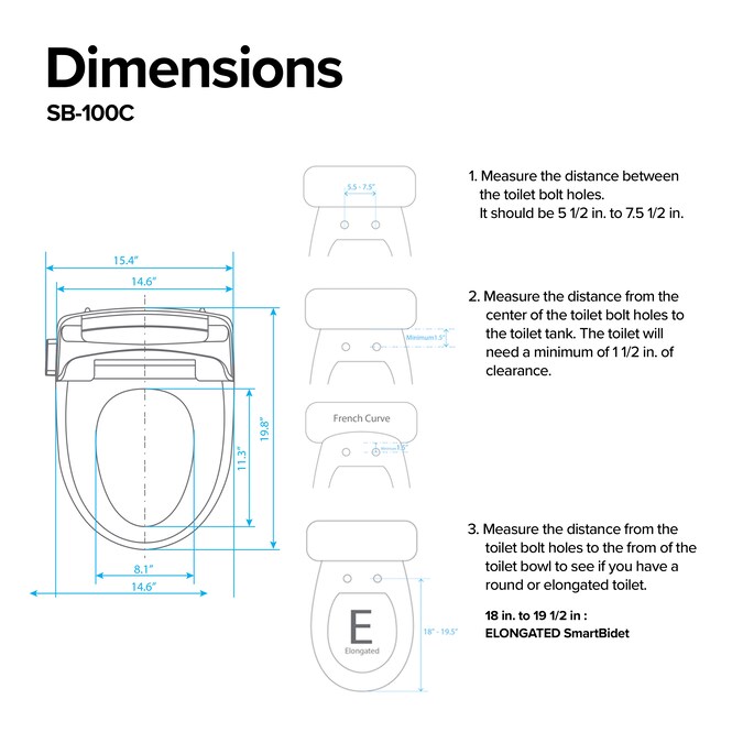 The SB-100C offers posterior, feminine, turbo wash modes with the massage option you can choose from the attached control panel. Heated seat and a self-cleansing nozzle are some beloved features. A family-friendly SmartBidet as it has an auto child wash and dry button. This does not include an air dryer. Customize the SmartBidet functions to match your needs and it becomes the default setting once they are set. The temperature and pressure of the water and seat are adjustable as well as the nozzle. Various wash modes – posterior wash is for his/Her rear. Feminine wash is a gentler, wider wash for Her front. Turbo wash is a stronger wash for his/Her rear. Massage wash – the water pressure will pulsate from a strong to a soft wash. The SB-100C does not include an air dryer. Our 3-in-1 nozzle self cleans before and after each wash. The skin sensor is a safety feature which activates the SmartBidet when sitting on it. The energy save function reduces the consumption of energy by keeping the seat and water at a steady temperature. A quick release button is there for easy cleaning and easy removal. Measure your toilet before purchasing – please carefully follow the measurement instructions to see if the SmartBidet model of your choice will fit your toilet before making your purchase. If you are still unsure, please contact our customer support team with the brand and exact model number of your toilet. How to clean – please use a neutral detergent. We recommend using baking soda mixed with vinegar. Don’t need warm water supply in your bathroom – just connect the SmartBidet to your bathroom water supply, the water travels into the SmartBidet tank, warms up, then shoots up warm water! Material: PP.