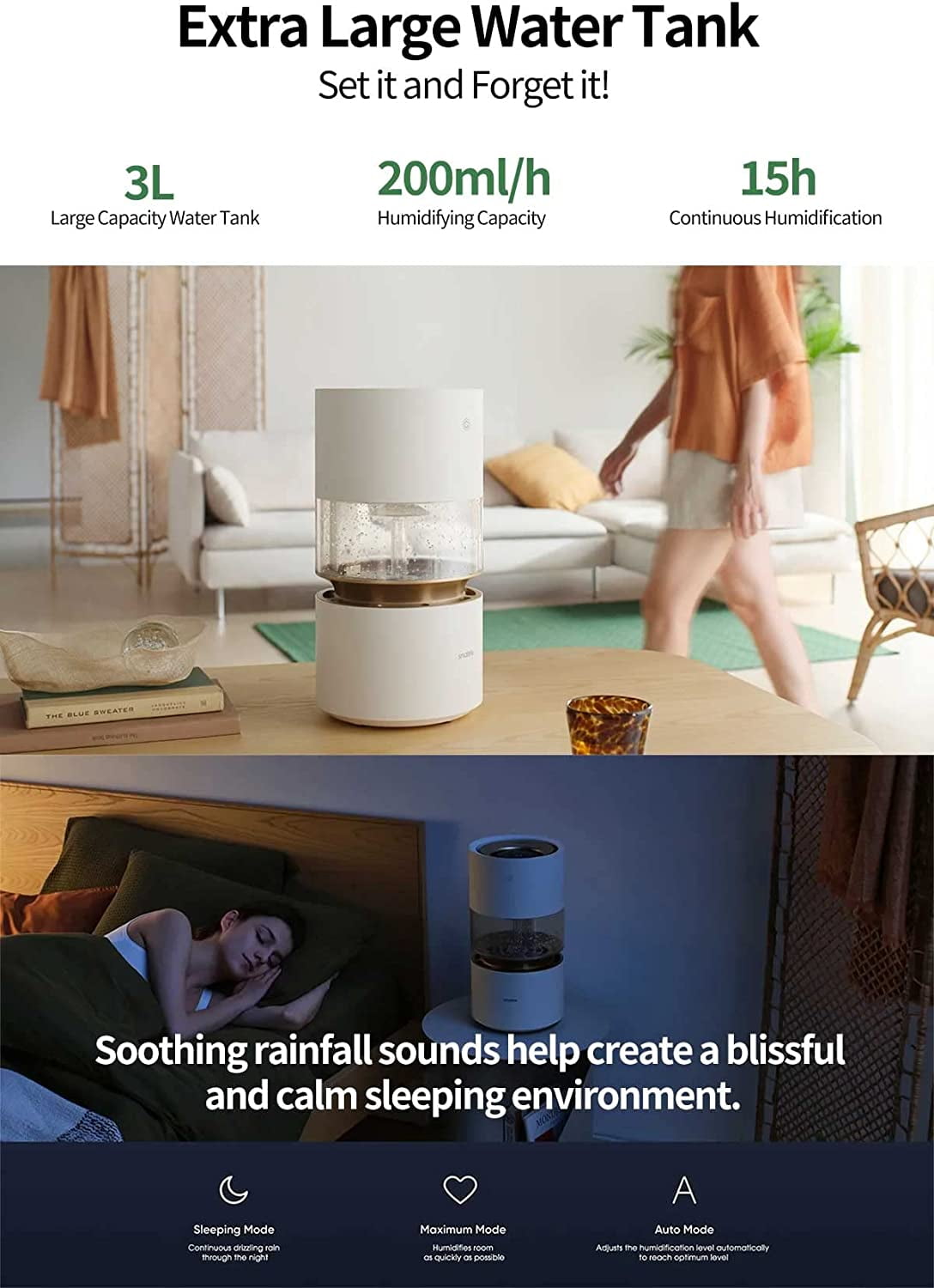 Its mist-free design ensures a comfortable environment while simulating the natural process of rain evaporating, providing a humid and fresher air to help you breathe better and sleep soundly. It emits soothing white noise, creating a relaxing and peaceful ambiance. Brand:smartmi Rainforest Humidifier