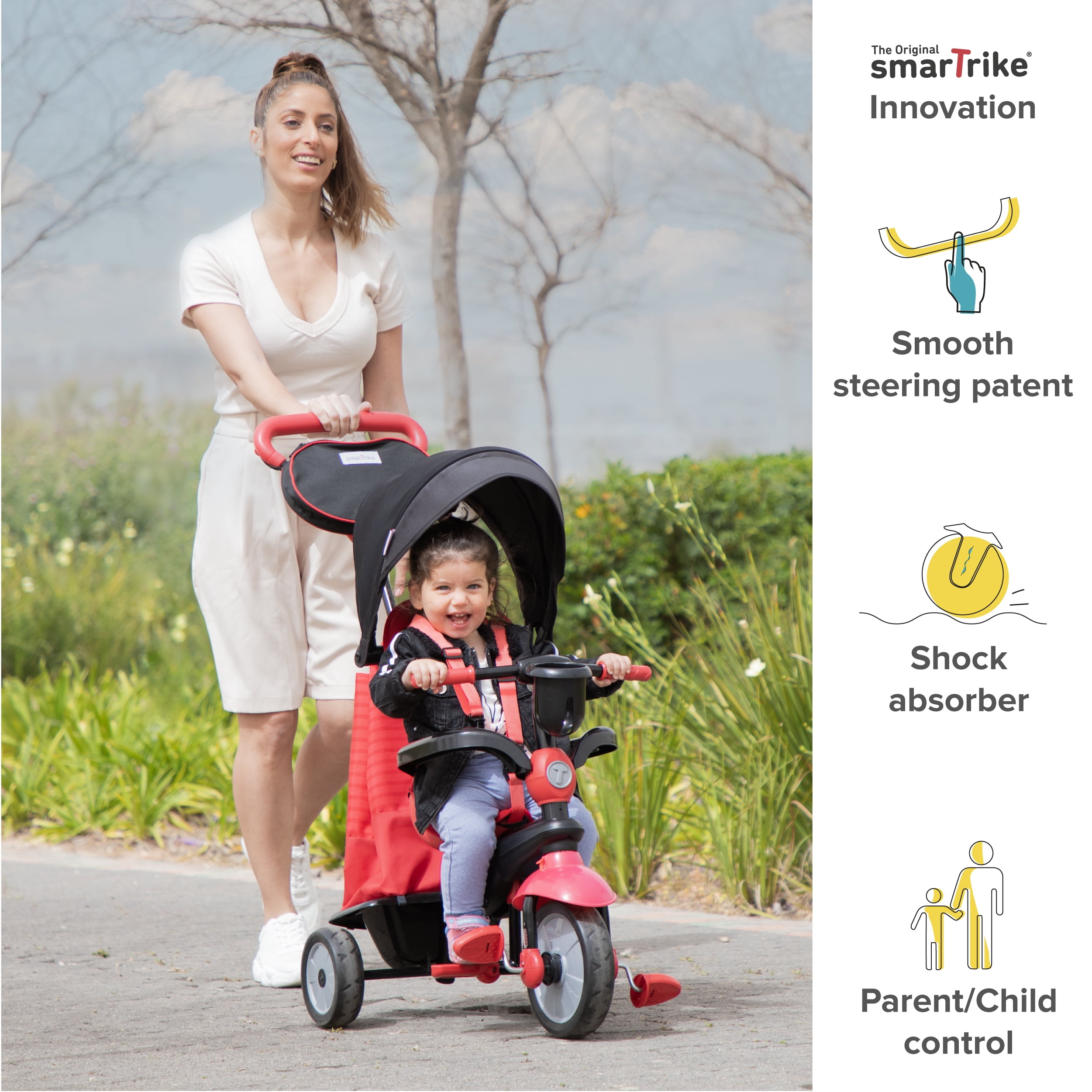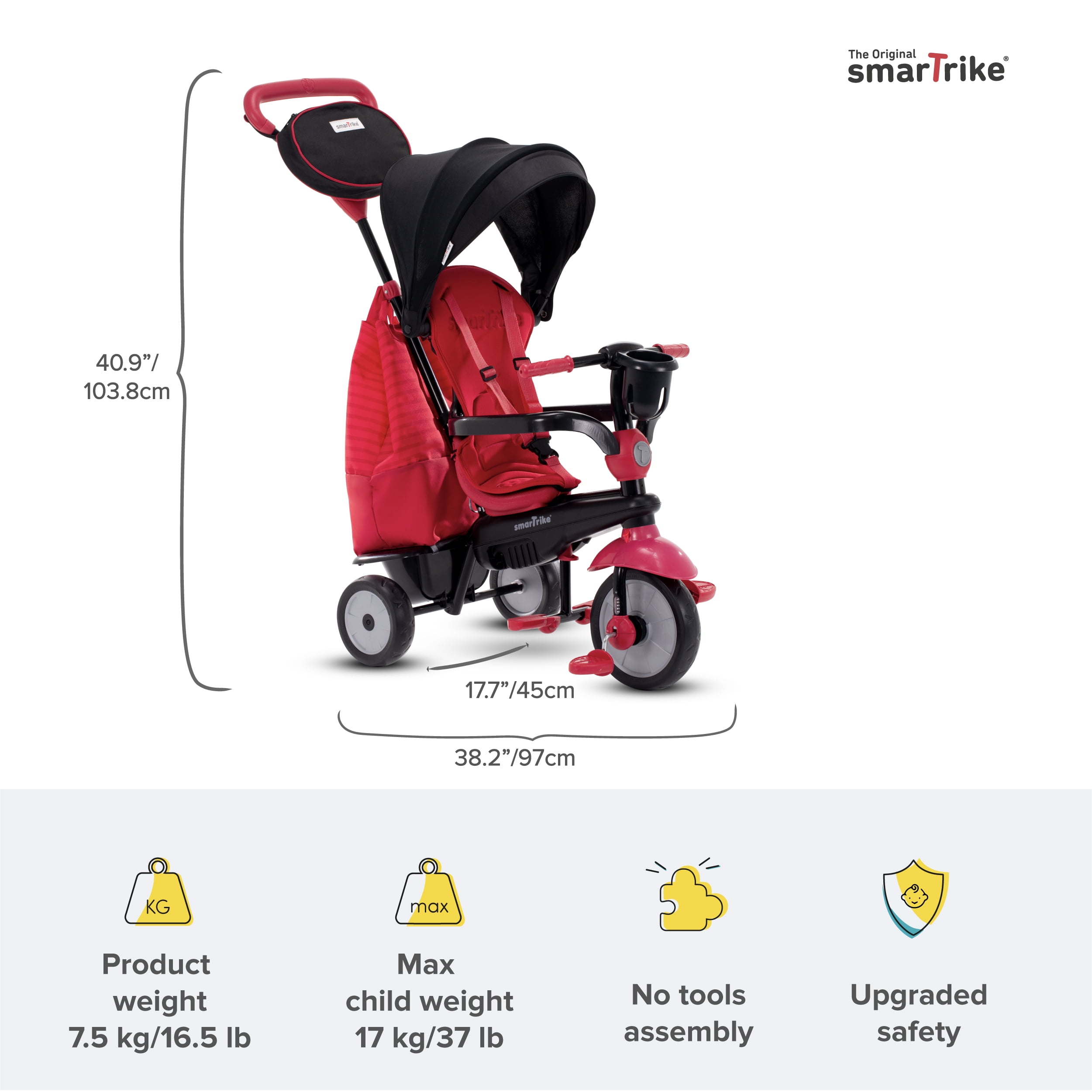 Enjoy the 4 adjustable tricycle configurations that suit every stage in your child’s life Effortless touch steering technology allows you to control the direction of the ride with just one hand Infant tricycle will maintain the comfort and safety of your little one 2-stage training wheels allow you to control while your toddler is learning and simply engage the 2nd stage to watch them pedal independently Sun canopy protects your toddler from harmful sun ray, providing shade when out in the sunshine Features a large storage bag, parent essentials console, and toy basket Recommend age is 15 months and older Maximum child weight: 38 pounds Material: Plastic Color: Red Dimensions (L x W x H): 14.57 x 6.97 x 15.83 inches Product Weight: 12 pounds