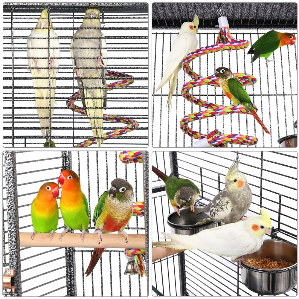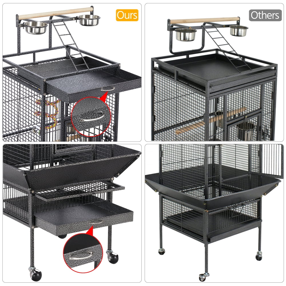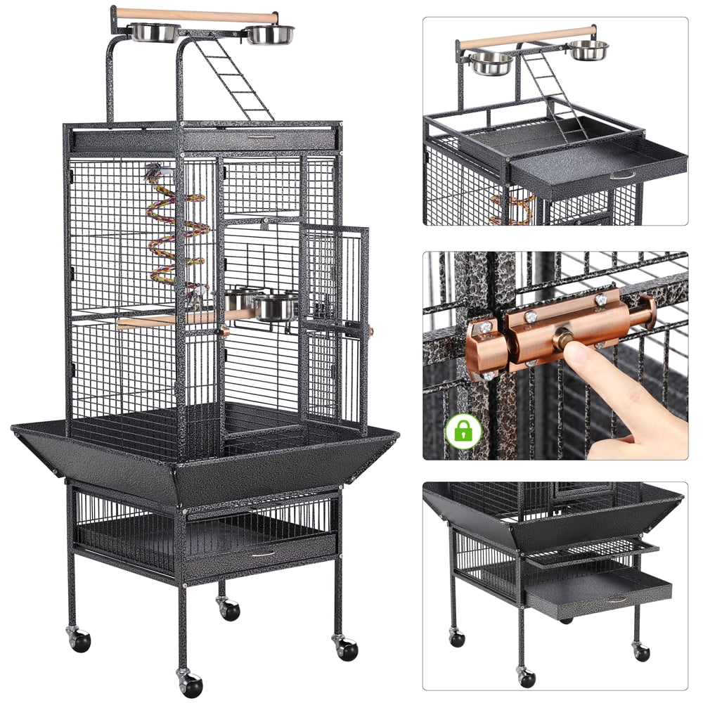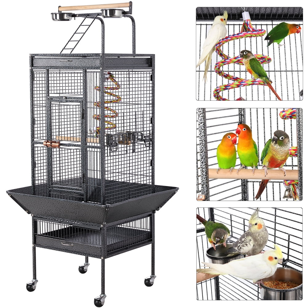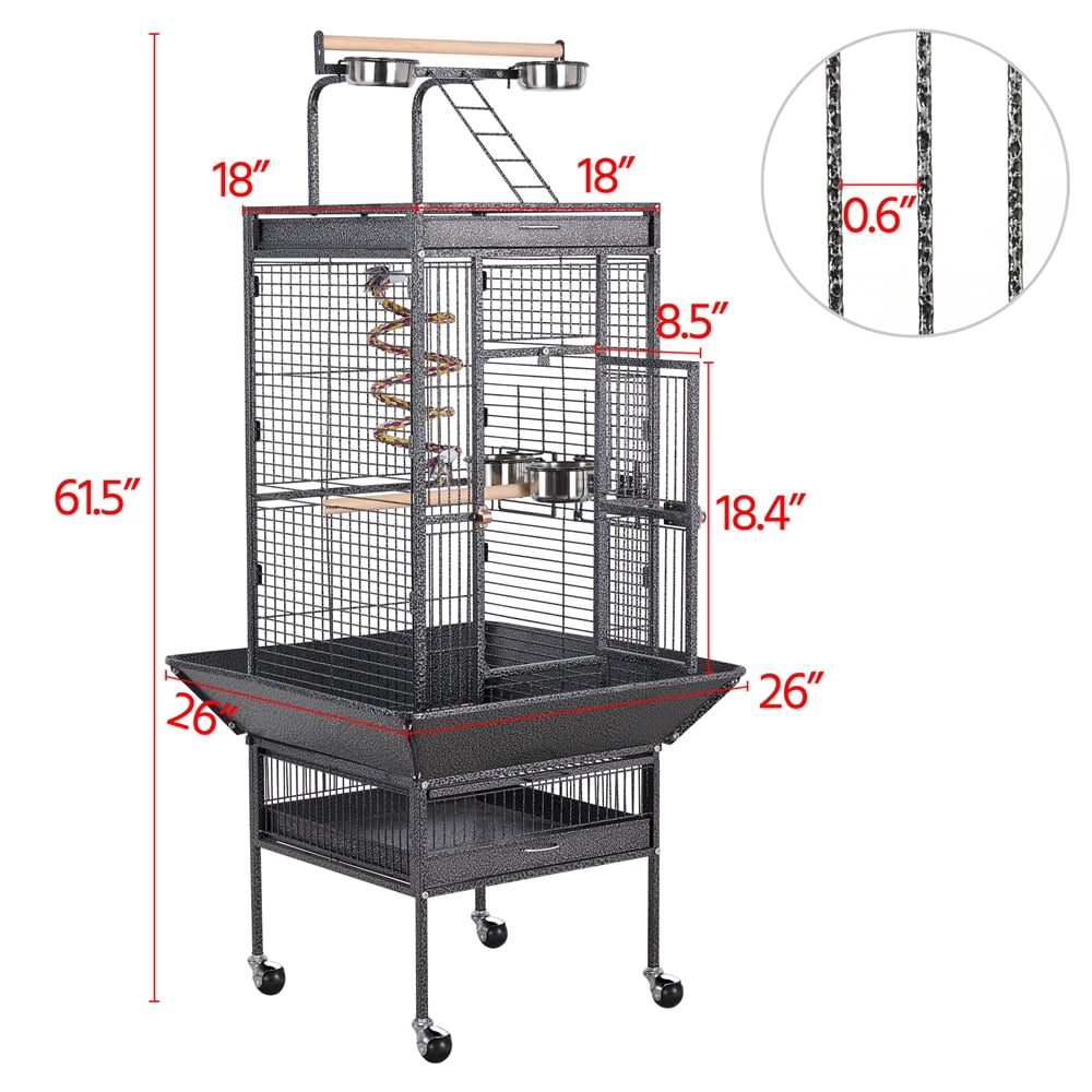 SmileMart 61.5″ Rolling Metal Parrot Cage Bird Cage with Play Top for Birds Cockatiel Lovebird,Black: Heavy-duty metal construction: Crafted out of quality metal and finished with waterproof and antirust hammered paint, this 61.5’’ tall birdcage is ready for the years to come. Spacious cage for small/medium size birds: This roomy parrot cage with 1.5cm/0.6’’ bar spacing provides ample living and activity space for small/medium size birds like lovebird, budgie, cockatiel, green-cheeked conure, sun parakeet. Playground on top: The ladder and the wooden perch on the cage roof offer you a better interaction with your beloved birds. There are 2 feeding bowls for seeds and water and a slide-out tray for catching spilled seeds and droppings. Safe & Secure: A button lock on the front door can keep your smart birdies safe in cage while the lock design is very easy for pet parents to operate. The hook locks on the feeding doors are for convenient seed refilling and safety purposes as well. Effortless rolling: This parrot cage comes with 4 heavy duty casters for high load capacity and smooth rolling. Easy cleaning: Slide-out tray and detachable mesh fence at the bottom can be removed for easy cleaning. The mesh fence between birds and the tray can prevent birds from walking directly in their excrement, which ensures your pets’ health and the tidiness of the cage. Simple assembly: Comes with all necessary tools and hardware, simple structure easy to assemble under the detailed instructions enclosed. Wide application: This high-quality parrot cage is suitable for both home and outdoor use. The large space, simple yet thoughtful designs make it a perfect choice for pet stores and pet hospitals. Toys included: This bird cage comes with a parrot bungee rope that is made of metal wire and polyester, strong enough to withstand the bites from your pets. A ring bell adds more fun for your birdies and a hook can be hung on any place you want inside or outside the cage. This bungee can develop birds’ coordination and balance skills. Specifications: Color: hammered black Material: painted iron, wood, stainless steel, plastic Overall dimension: 65.5 x 65.5 x 155.7 cm / 26 x 26 x 61.5’’ (LxWxH) Cage size: 45.5 x 45.5 x 77.5 cm / 18 x 18 x 30.5’’ (LxWxH) Front door size: 21.5 x 46.7 cm / 8.5 x 18.4’’ (WxH) Feeder door size: 14.4 x 11.2 cm / 5.7 x 4.4’’ (WxH) Feeder bowl size: 11 x 6 cm/ 4.3 x 2.4”; 11 x 4.5cm/ 4.3 x 1.8” (Dia.xD) Tray size: 45 x 42 x 4.6 cm / 17.7 x 16.5 x 1.8’’ (LxWxH) Bar spacing: 1.5 cm / 0.6’’ G.W.: 19.2 kg / 42.2 lb Free accessory: 4 stainless steel bowls, 2 wooden perches NOTE: 1. Please notice that the color of this bird cage is not pure black. It is hammered black. 2. Please allow ±0.2”/0.3cm errors due to manual measurements.