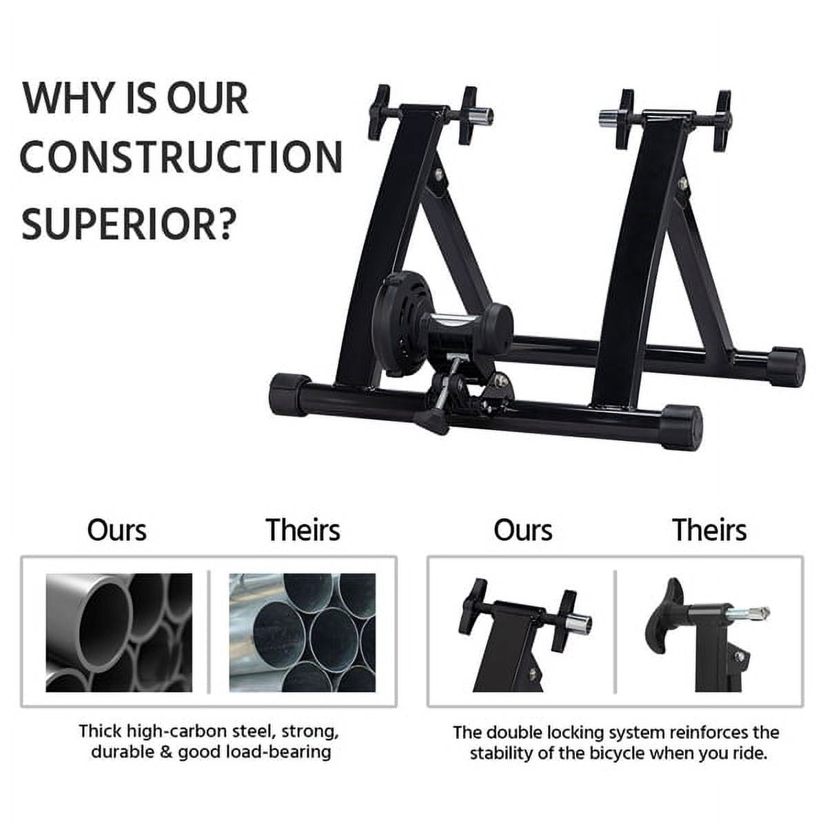 Solid construction: Constructed of quality magnet, corrosion-resistant alloy roller, and powder coated high carbon steel with the ability to support up to 120kg/264.6lb, our indoor bicycle trainer provides you with the most secure bicycle training method. Sturdy mounting system and front wheel support for added safety. Easy-to-apply: We provide a detailed user manual to help you set up your indoor cycling trainer quickly and with ease. The package includes a quick release skewer for rear wheel hub for accurate and safe assembly in trainer and front wheel stand. Space saver: The foldable design render this magnetic bike trainer rather simple to store without occupying much space when not in use, it can be slid into any narrow place in your room. Its collapsible stand also makes transport a breeze. Smooth operation: This low-noise magnetic turbo gives you a quiet exercise environment. Please note that the noise/friction sound comes from the friction between the wheels and the trainer. Our indoor bike trainer itself doesn’t contain any noise-causing parts. Functional home gym accessory: This indoor bike trainer fits for 26″ to 28″ and 700C wheels, and comes with a quick release skewer, so it requires a bike with a rear quick release wheel. Great for indoor cycling training, also an ideal gift for bicycle lover. Why an indoor bike trainer: When the bad weather tries to stop your cycling training, or somehow you just don’t feel like leaving the house and driving to the studio to get in your daily spin classes, then the indoor bike trainer is a handy and practical solution to your worries. With the cycling trainer, you can exercise at home with ease and leave those subjective or objective excuses behind. Protective levelness-adjustable feet caps: This magnet turbo trainer is secured by four non-slip feet caps, which prevents the trainer from displacing or damaging the floor during a workout. On each gear-like cap, the “teeth” are varied in thickness. You can rotate the cap and choose the right thickness to level the trainer. Note: The noise is mainly related to the materials and tread of bike tires. The use of road bikes is highly suggested, because the spinning sound will be louder if mountain bike is used. We also recommend using the bike trainer on a carpet to reduce noise.