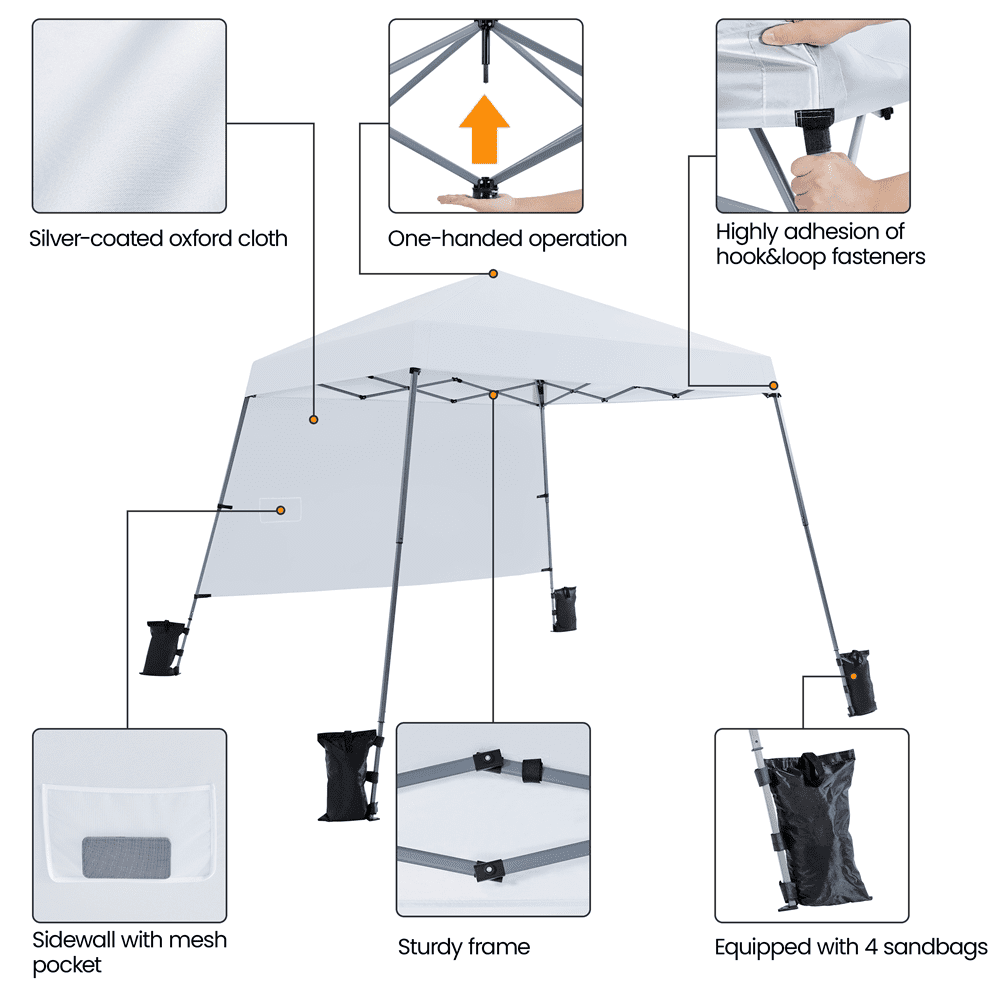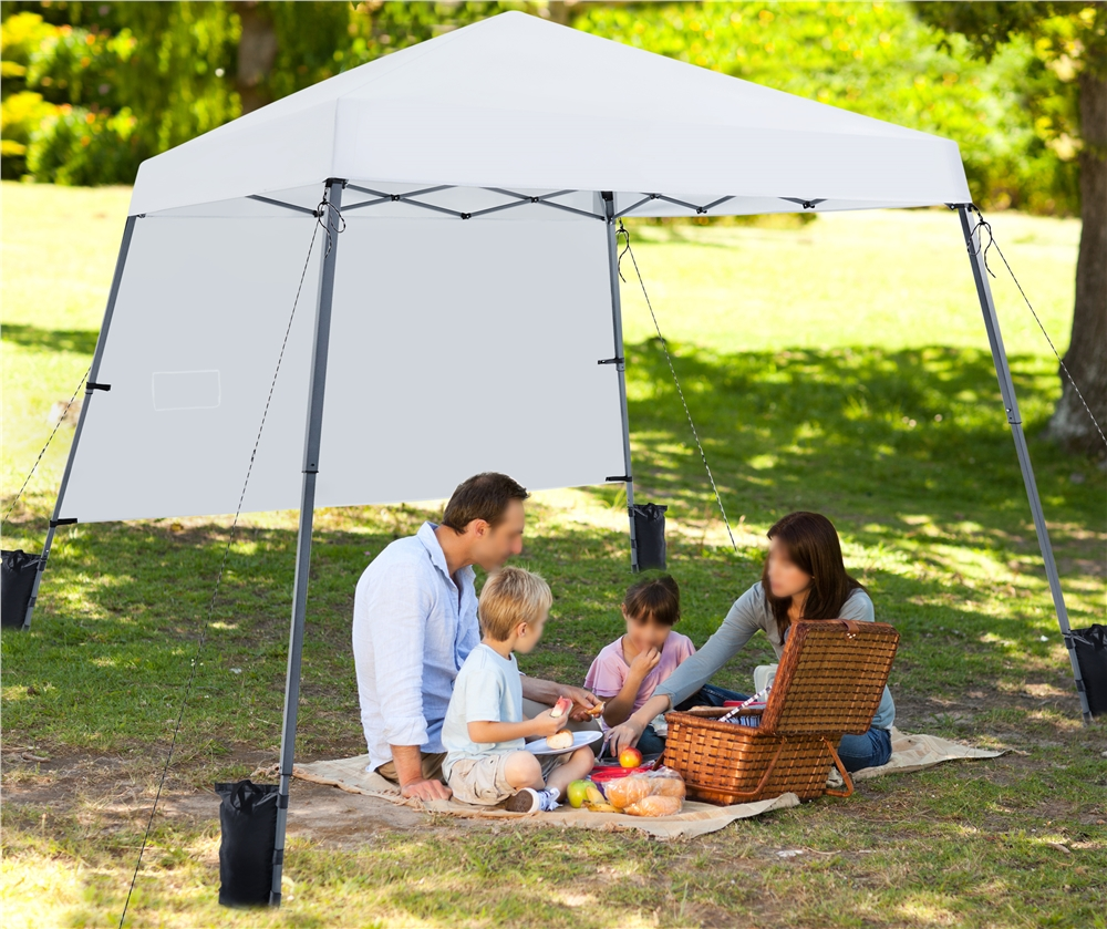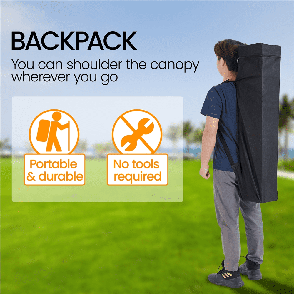 If you need a compact canopy for your family trip or BBQ in the backyard, try this decent pop-up canopy! Our canopy is made of silver-coated oxford cloth and plastic-sprayed iron, which has good stability and durability. Notably, we have all full accessories with this canopy, so you do not need to prepare other accessories. The backpack lets you take this canopy going outside conveniently. Also, the sidewall protects you from direct sunlight when you sit under the canopy. The pocket on the sidewall is a good spot for small items. The 4 legs are tilted yet stable when fully supported. The upper overall size of the canopy is 8ft L x 8ft W x 8.5ft H, and the lower overall size is 10ft L x 10ft W x 8.5ft H.This compact canopy is easy to set up due to its one-handed design. Just one person can push and set up the canopy in seconds, timing-saving and effortless. One of the sides has a sun-shading wall, which plays a good sun shade effect. This sidewall ensures that sunlight will not slant down to you when you sit under the canopy.With good value and thoughtful design, this waterproof canopy won’t let you down!