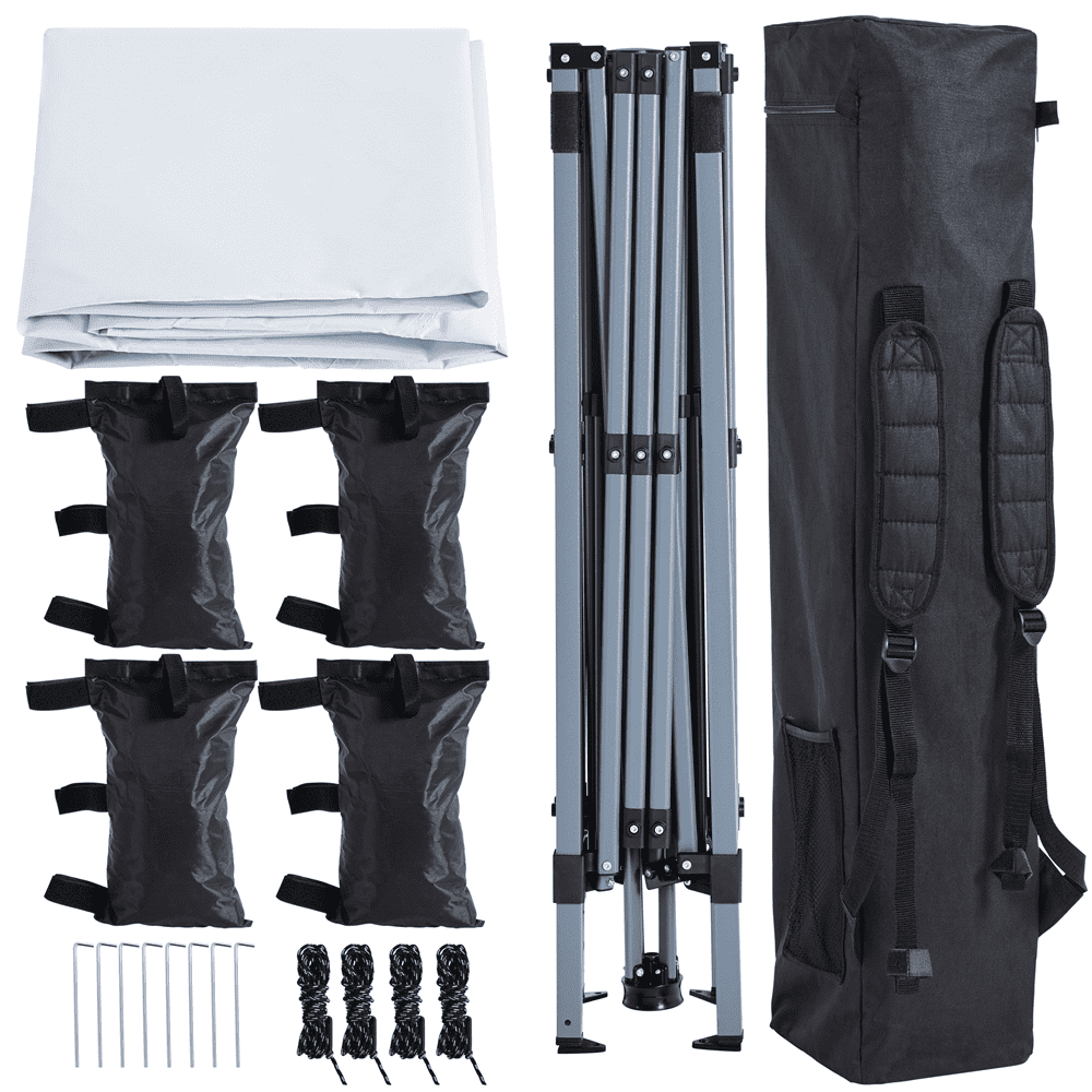 SmileMart Lightweight Pop-Up Canopy with Sun Shade Wall Backpack Bag, White Material: Silver-coated oxford cloth and plastic-sprayed iron; Color: White; N.W.: 13.1kg; G.W.: 14.4kg; Upper overall size: 234cm L x 234cm W x 260cm H; Lower overall size: 300cm L x 300cm W x 260cm H; Bag size: 105cm L x 22cm W x 20cm H Material: Silver-coated oxford cloth and plastic-sprayed iron; Color: White; N.W.: 28.9lb; G.W.: 31.7lb; Upper overall size: 8ft L x 8ft W x 8.5ft H; Lower overall size: 10ft L x 10ft W x 8.5ft H; Bag size: 41.3inch L x 8.7inch W x 8inch H NOTE: Please allow 2cm/0.8innch error due to manual measurement. For safety, please do not use the canopy under bad weather conditions.