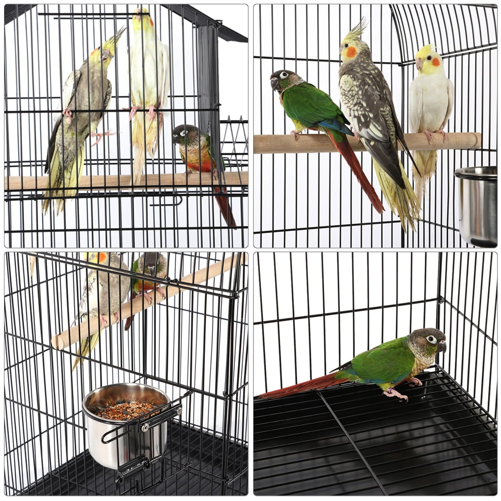 Ample space for small/medium size birds: Measuring 50LxW49.5xH83cm/19.7Lx19.5Wx32.7H” in housing area, this rolling bird cage can accommodate 1-2 small/medium size birds (height less than 25cm/ 9.8ââ) like budgerigars, green cheek conures, cockatiels, love birds, etc. Roomy cage gives your feathered friends enough space to move around, flit from perch to perch, and spread their wings. Thoughtful designs: The extra storage shelf on the stand can hold your petsâ accessories and feed, keeping them handy and neat. Thanks to the 2 feeder doors, feeders are accessible without opening the main door so that you can remove the feeders and replenish the feed from the outside and donât need to risk your bird escaping. 2 free stainless steel feeders are included. Aesthetical bird home: Special triple-A roofing design not only gives your beloved birds a beautiful and sweet home, but also can be an elegant decoration for your house. Curvy hollow-out legs add a layer of grace to the piece. Convenient moving: Considering the size, it may take a little effort to move this bird cage. However, our parrot cage comes with a stand that sits on four 360° swivel smooth-rolling casters (2 with brakes), making it easy to move around and lock in place for added security. The detachable mobile stand can be easily removed if needed. Easy cleaning: The plastic slide-out tray can be taken out and cleaned with water, making cleaning a breeze. The grate between birds and the tray prevents birds from walking directly on their excrement, which ensures both your petsâ health and the tidiness of the cage. Easy to assemble: Simple assembly is required. All necessary hardware and parts are included. We offer an illustrated instruction to help quick and easy setup. *Specifications: Color: black Material: powder coated iron, plastic, wood, stainless steel Free accessory: 2 perches, 2 stainless steel feeders Overall dimension: 59.5 x 59.5 x 140 cm / 23.5 x 23.5 x 55ââ (LxWxH) Cage size: 50 x 49.5 x 83 cm / 19.7 x 19.5 x 32.7ââ (LxWxH) Entrance size: 23.5 x 26.5 cm / 9.3 x 10.4ââ (WxL) Bar spacing: 1.5 cm/ 0.6ââ Bottom storage shelf size: 50 x 48 cm / 19.7 x 19ââ (LxW) Feeder size: 11 x 8 cm / 4.3 x 3ââ (Dia.xD) Perch size: 2.3 x 52 cm / 1 x 20.5ââ (Dia.xL) Ground clearance: 21 cm / 8.3ââ N.W.: 11 Kg/ 24.3 Lb G.W.: 12.9 Kg / 28.4 Lb NOTE: 1. Please allow ±0.2”/0.3cm errors due to manual measurements. 2. This cage is recommended for small/medium birds. Please make sure whether this cage is suitable for your birds before placing an order.
