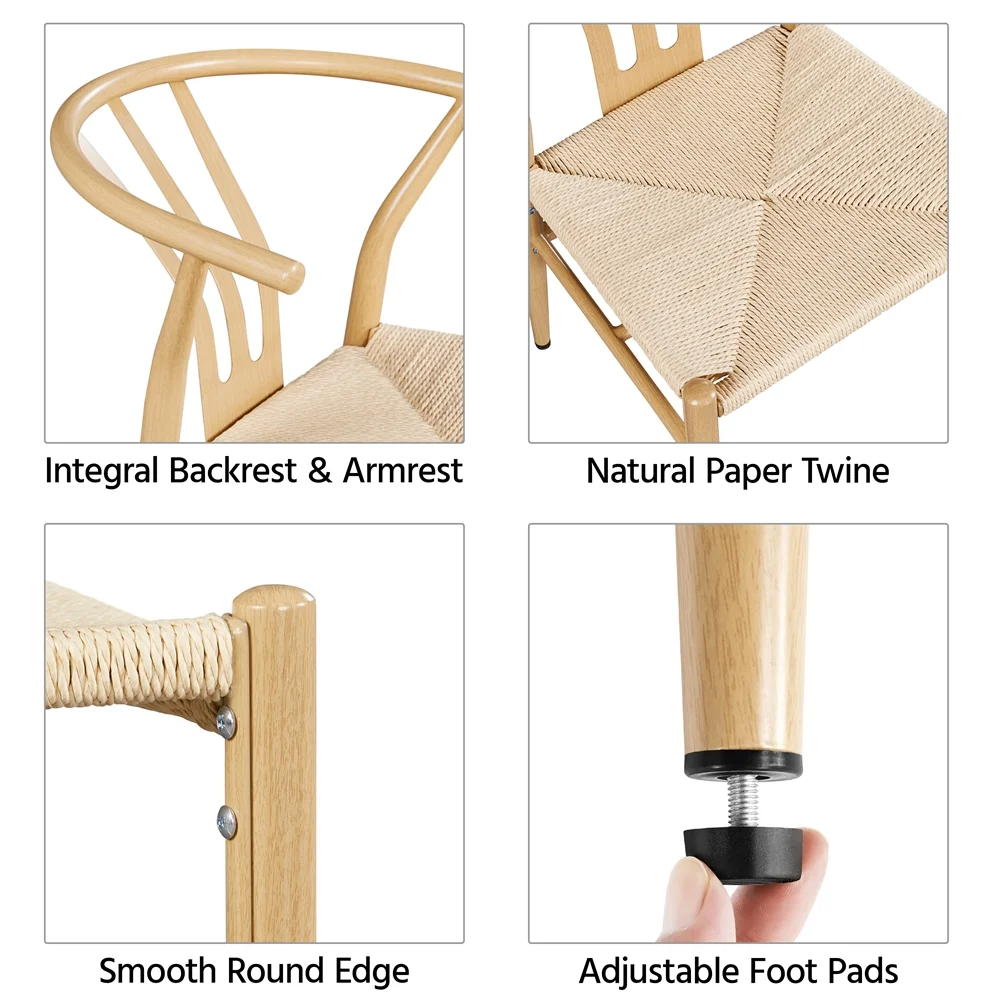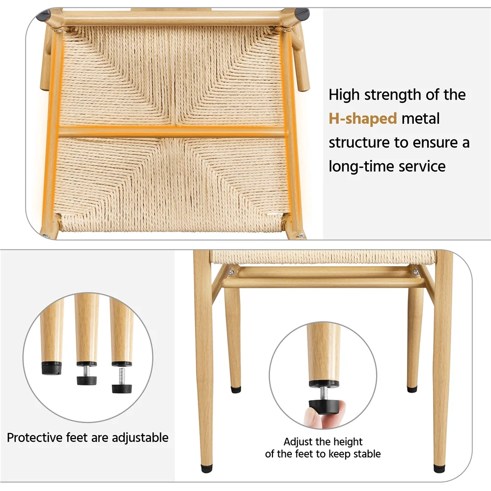 Smile Mart Mid-Century Weave Dining Chairs with Solid Metal Frame, Wood Materials: Iron and paper twine Color: Wood (as pictures show) Qty: 2PCS Overall size: 22 x 22 x 29 inch (L x W x H); Seat Size: 16 x 16 inch (L x W x H); Seat Height: 17 inch; Max. weight capacity: 331lb; N.W.: 27.5lb; G.W.: 34.4lb Note: 1. Please allow ±1cm/0.4inch error due to manual measurement. 2. Please do not use the products outdoors. Do not expose the chairs to moisture and sunlight directly. Twine Woven Seat Adjustable Foot Pads