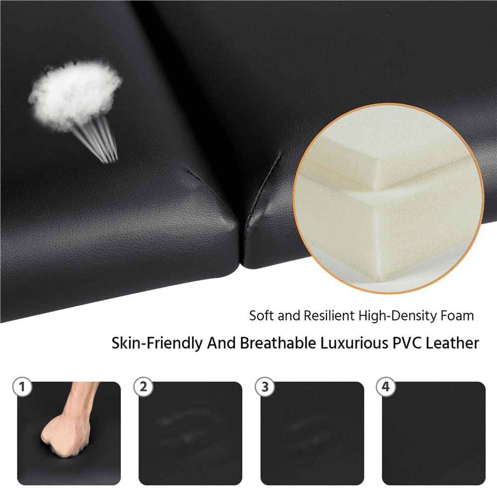If you’re a massage therapist or work in a spa or rehabilitation center, this 3-folding massage table is essential. It’s versatile enough for massage and clinical use and can easily be moved thanks to its portable design. The table is constructed with an engineered wood frame and beech wood legs, ensuring it’s sturdy and reliable. The faux leather cushion is comfortable and can be quickly cleaned. With an adjustable third section and 8 height options ranging from 25″ to 34″, this table can be customized to meet your specific needs. Best of all, there’s no complicated setup required.