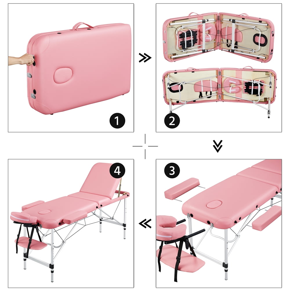SmileMart 3Fold Adjustable Aluminum Massage Table, 84″, Pink Made from highquality materials: Aluminum alloy, beech wood, and a cushion composed of plywood, nonwoven fabric, foam, and PVC leather Stylish pink color adds a vibrant touch to any spa or treatment room Assembled Dimensions: 213 cm L × 80 cm W × (67.5-89) cm H / 84″ L × 31.5″ W × (27-35)″ H Folded Size: 92.5 cm L × 56.5 cm W × 18.5 cm H / 36.4″ L × 22.2″ W × 7.3″ H Headrest: 28.5 cm L × 28.5 cm W × 7 cm Thickness / 11.2″ L × 11.2″ W × 3″ Thickness Armrests: 34 cm L × 11 cm W × 5 cm Thickness / 13.4″ L × 4.3″ W × 2″ Thickness Maximum Weight Capacity: 250 kg / 551 lb Item Weight: 13.2 kg / 29 lb Shipping Weight: 14.8 kg / 32.6 lb