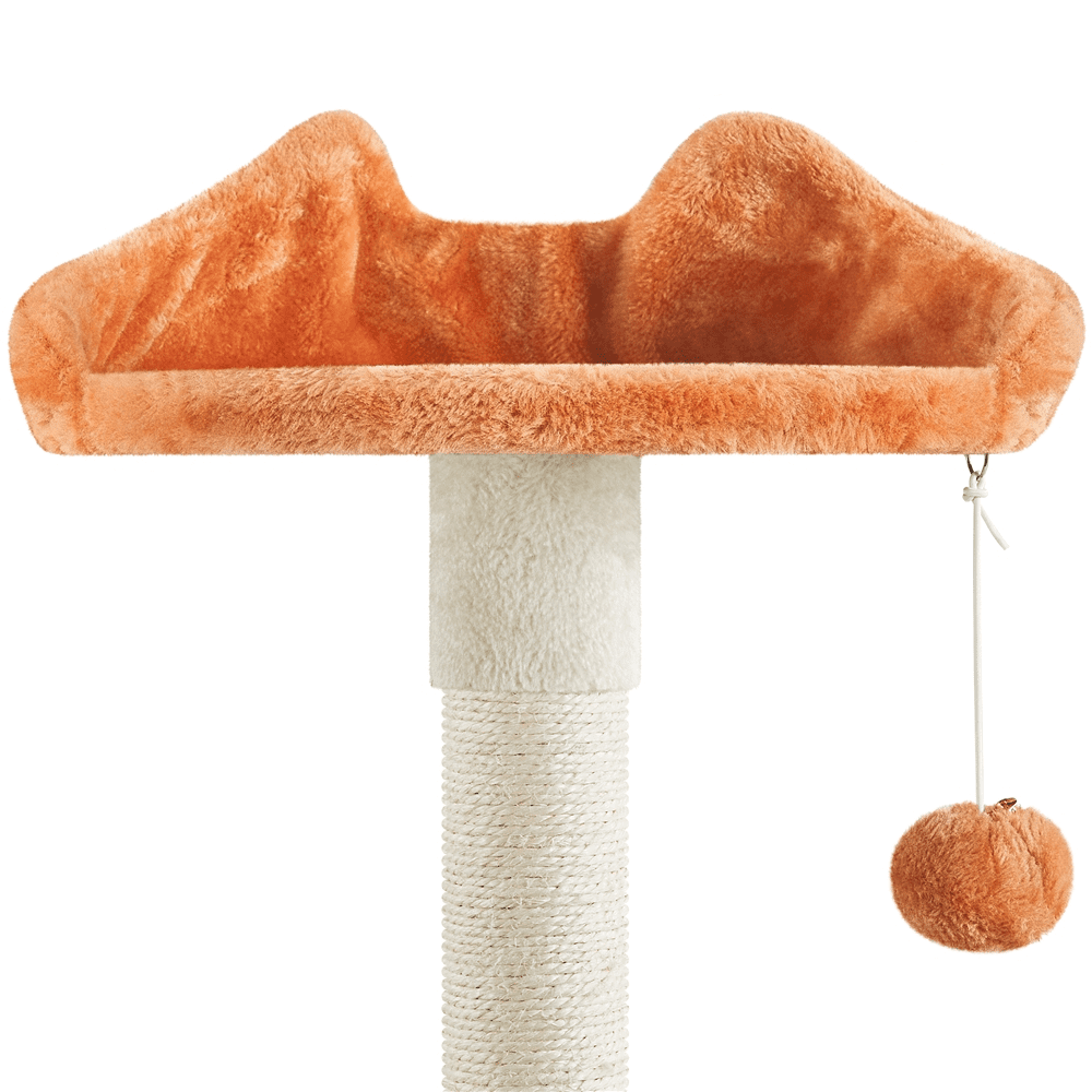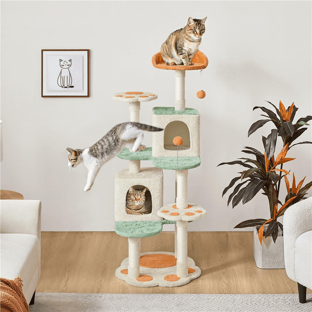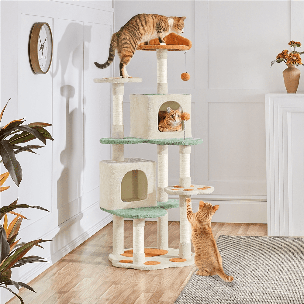 A cat paw? It’s a CAT TREE! Taking inspiration from a cat’s claw, this 58″ tall cat tree features a delightful combination of beige, orange, and green colors, along with cute cat claw-shaped details for a vibrant and lovely look. The cat tree offers various spots for relaxation, including a sturdy cat paw-shaped base, multiple scratching posts, comfortable perches for viewing from above, cozy condos, and extended platforms for lounging. The sisal-coiled scratching posts flawlessly mimic tree bark’s texture and maintain your pet’s claws’ scratching and health. This cat tree fulfills your cat’s essential needs, from lounging and napping to playing and scratching—an ideal addition to any household with a love for cats.