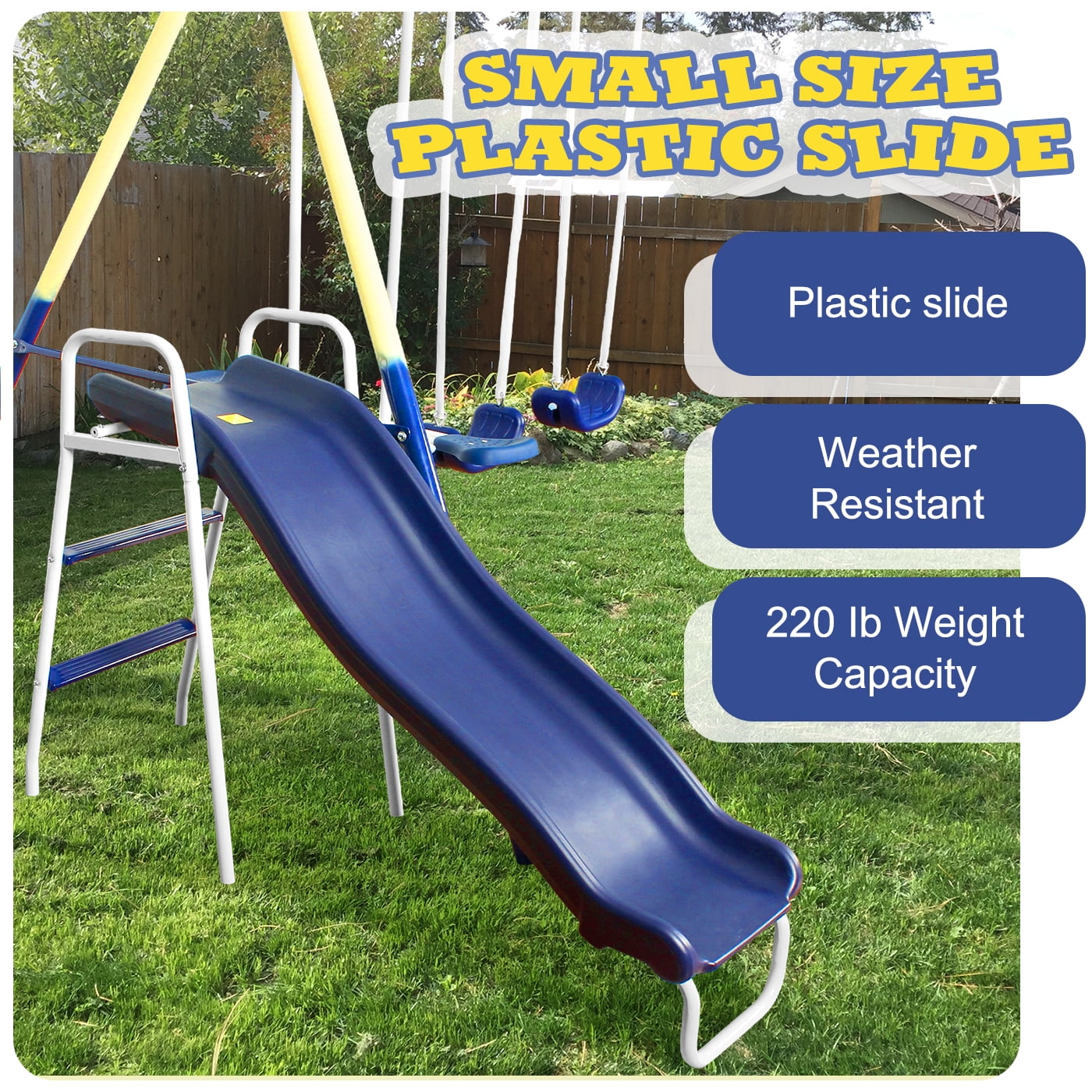 [Multi-Function Swing Set for Backyard]: Our swing sets outside includes two swing, one movable trampoline, one glider and slide for more active play. We designed the tramopoline that can be easily disattached from the swing set and move into indoor fun. [Playground Swing Set]: Our playsets for backyard measures in 191″L x 91″W x 74″H. The kids swing set with slide supports kids weighing up to 100 lbs total 600lbs. Our outdoor playsets for kids pased the CPC test. An ideal recreation for your 3 years and up kids as well as a great gift for them [All Weather Duriability]: You don’t need to worry if the weather will damage your outdoor swing sets for kids. The swing is made by PP material which is more durable. The trampoline with frame is anti-rust and uv-resistant to survive sunshine, rain and snow [Easy Installation with Guide]: Please follow our installation manual in the package . Tools are included. The swing set with slide and trampoline is perfect for garden, backyard or playgroup. Enjoy the family time with your kids [Customer Care for Swing Set]: It’s important to keep your kids safe when they play; It’s also important not to disappoint them when you tell them you have bought a swing set. We stand behind our products. So when you encounter any question or problem during the installation, please contact us. We will take care of it