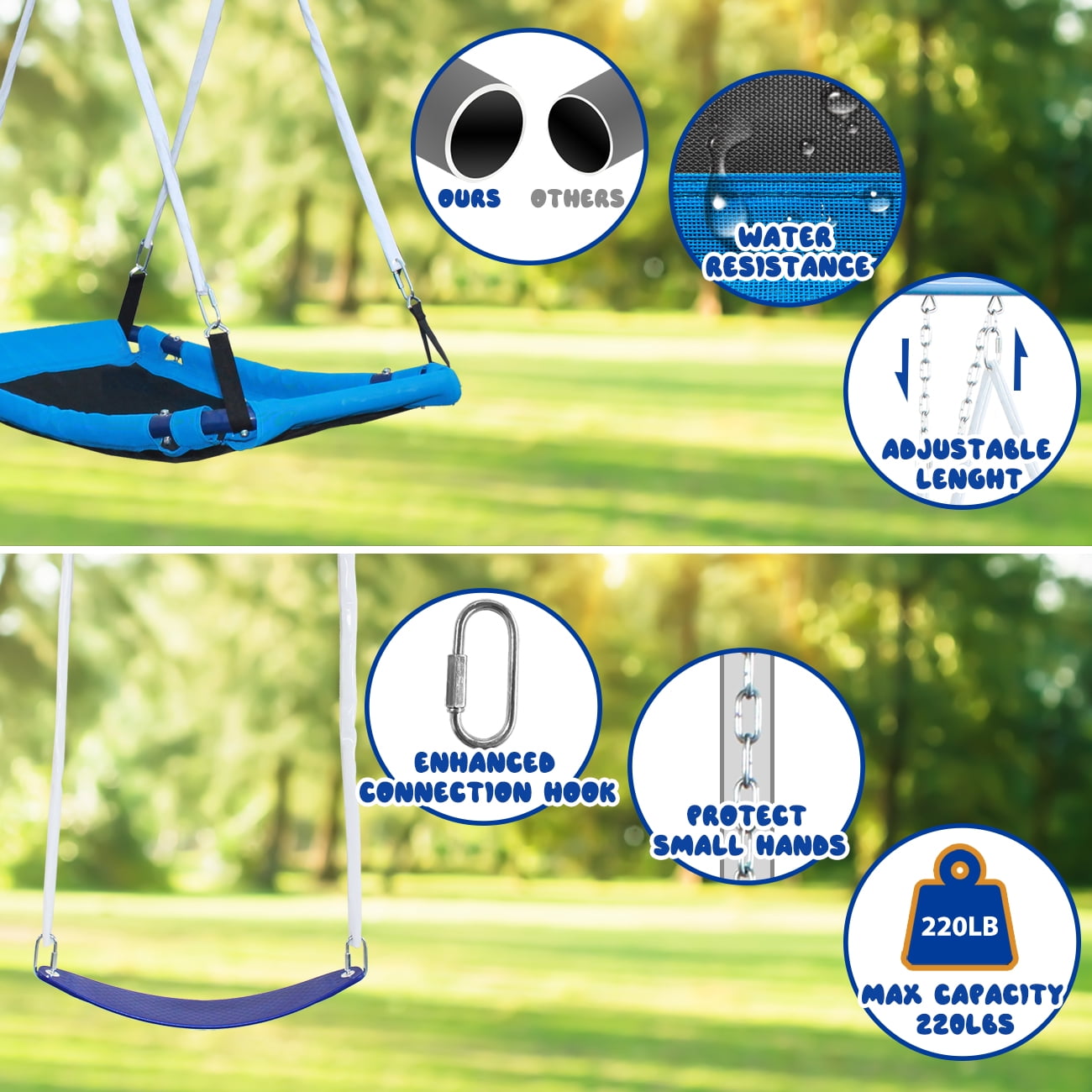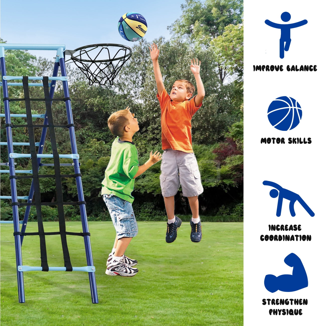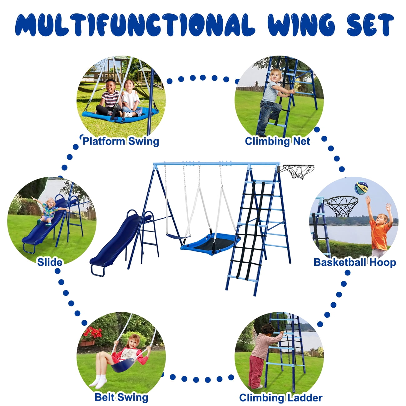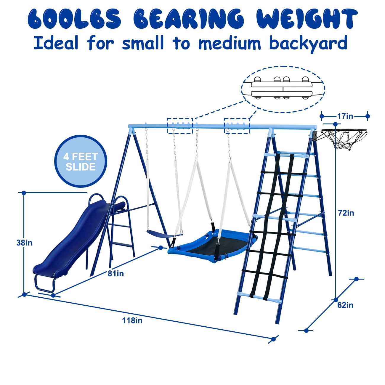 6 in 1 Swing Set for Outside: Our Playground Sets for Backyard features a Platform Swing Seat, Belt Swing, Slide, Basketball Hoop, Climbing Ladder, and Climbing Net, allowing multiple children to play together Includes 6 strong spiral stakes for added stability Sturdy, Safe, and Durable: Constructed with heavy duty weather resistant steel tubes and hardware, featuring a powder coated finish for excellent anti rust and anti corrosion properties The A frame design enhances robustness The Platform Swing is made with a strong galvanized chain and high density textilene fabric, ensuring UV resistance and long lasting durability Climbing Ladder Functionality: Encourages children to engage their entire body, improving physical fitness, coordination, balance, cooperation, and self confidence Outdoor Playset for Kids: Assembled dimensions are 124″L x 54″W x 69″H, with a weight capacity of 100 lbs per seat Designed for up to 6 children to play together, suitable for backyards, gardens, parks, and large playgrounds Easy Installation: All necessary accessories and hardware are included, along with detailed instructions for quick assembly It is recommended to bury 5 inches of the swing stand leg into the ground with cement concrete for added stability