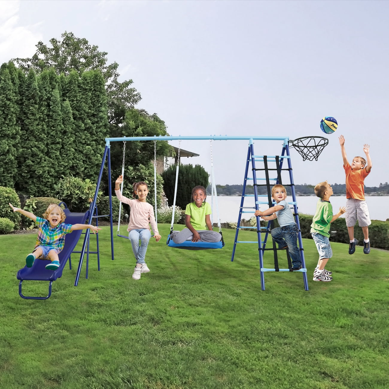 SMkidsport 6 in 1 Swing Sets for Outside, Playground Sets for Backyard with Saucer, Slide, Climber and Basketball Hoop, Heavy Duty Metal Outdoor Playset for Kids
