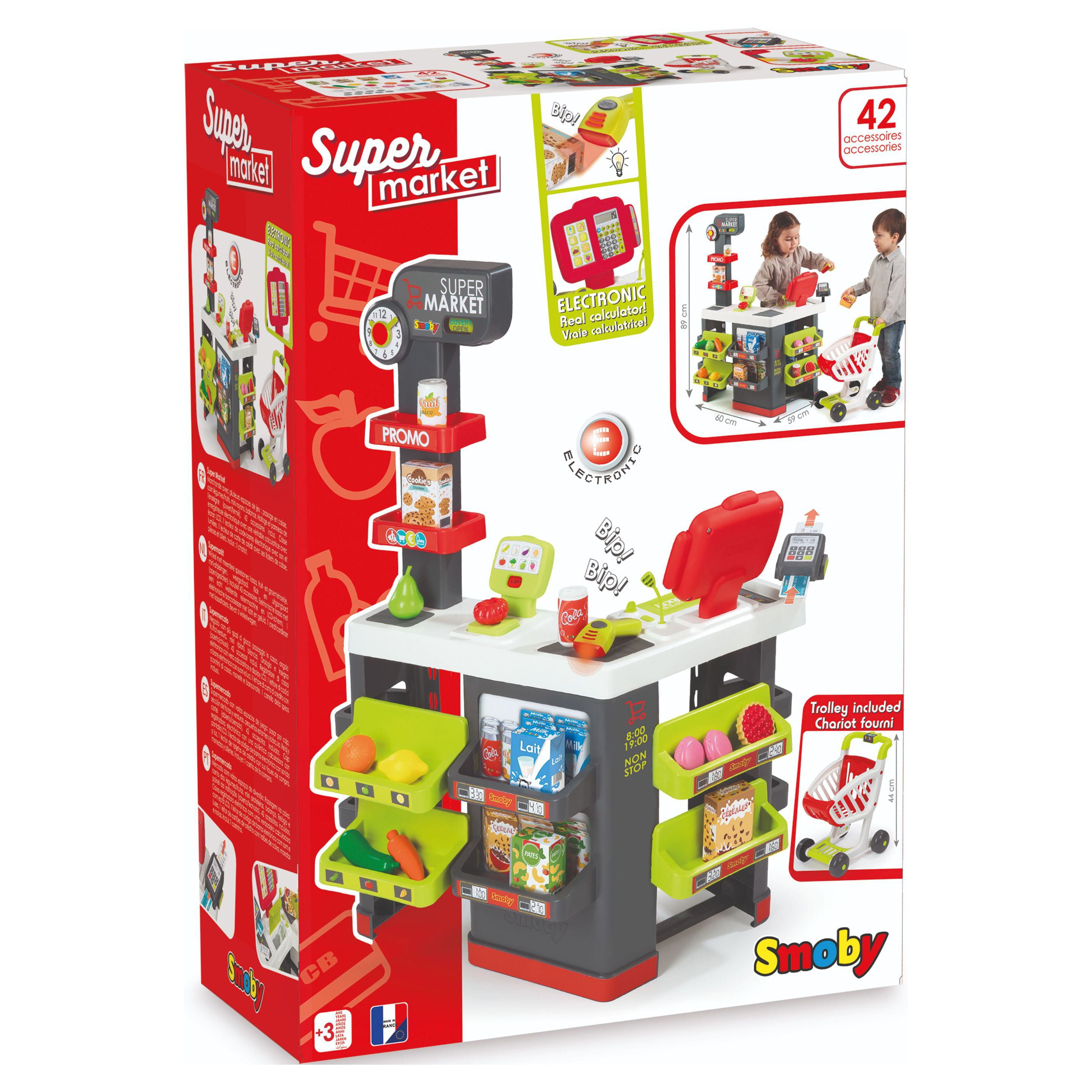 Create and run your business thanks to this pretty market! With this Super Market set, you will develop your imagination and become familiar with the shopping universe. Different elements are at your disposal to organize departments: shelves, boxes, vegetables, fruits, and more. Play customer using the trolley, like mom and dad to do your shopping. Don’t forget to weigh your foods, using the scale before going to the checkout! The cash register has a lot of interesting functions. You will love to use the barcode scanner: it makes sound and light, just like the real thing. In addition, you can use your credit card because there is a credit card reader. And, as if by magic, a receipt will come out! For cash purchases, develop math skills by figuring out the needed change using the calculator. Suitable for ages 3 years and up. WARNING: CHOKING HAZARD — Small parts. Not for children under 3 yrs.