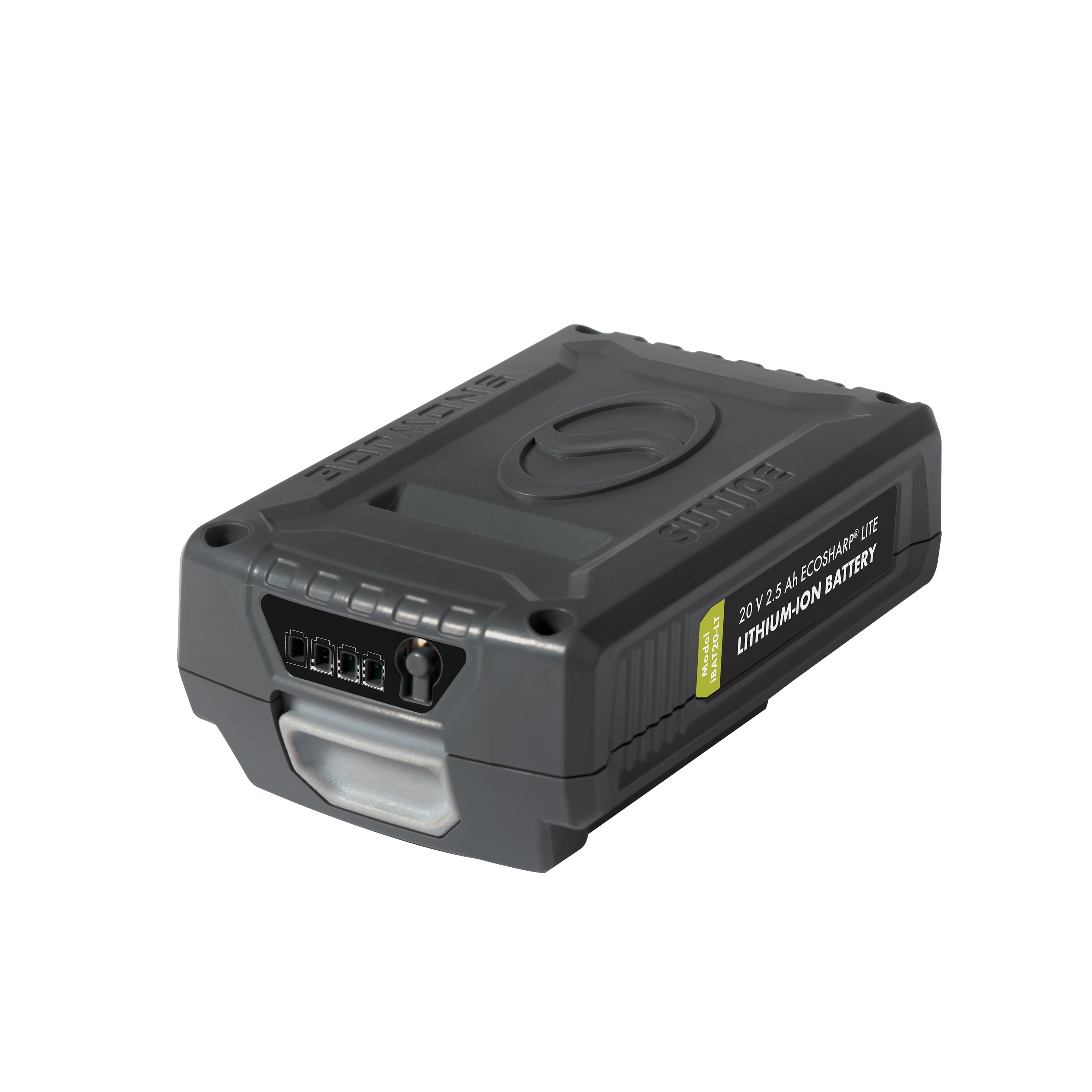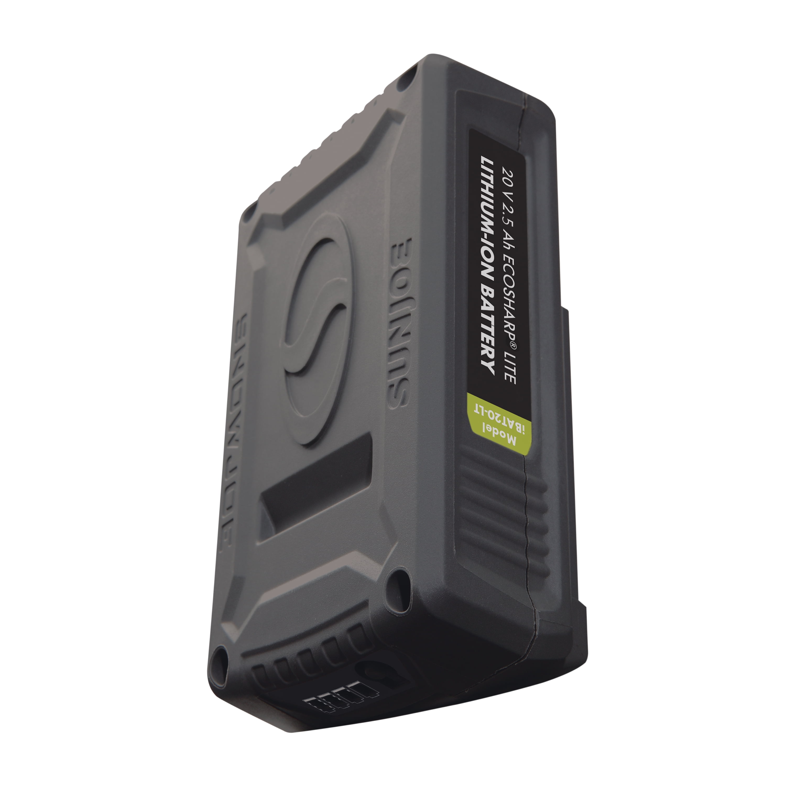Power up. Power your cordless iON tools the eco-friendly way with the 20-volt EcoSharp? LITE iBAT20-LT lithium-ion battery. Compatible with all Snow Joe® and Sun Joe® 20v models, the iBAT20-LT features high capacity 2.5 Ah lithium-ion cells that deliver no-fade power for maximum job performance. Simply insert the EcoSharp? battery pack into your iON tool of choice and power up instantly without having to mess with gas, oil, pull-cords, or tangled extension cords! Breathe easily and confidently while working with your iBAT20-LT since this Energy Star-rated battery pack provides for cleaner, emission-free air during operation. Although run-times will vary depending on the tool used and the job performed, up to 50 minutes of whisper-quiet operation is a good approximation of what to expect from your iBAT20-LT-powered tool. The fuel gauge indicator lights on the EcoSharp? will also let you easily monitor your battery?s charge capacity while it is in use. When it is time to charge, simply slide the iBAT20-LT into its dedicated iCHRG20 charger. Just like your cell-phone battery, the iBAT20-LT has no memory effect, so there is no need to drain the battery or wait for full charge before use. The iBAT20-LT holds its charge well in storage and will retain up to 65% charge for six months. Easy, convenient, reliable, and super-lightweight (only 0.8 lbs!), the 20-volt EcoSharp? iBAT20-LT is the smart way to battery pack for your power trip.