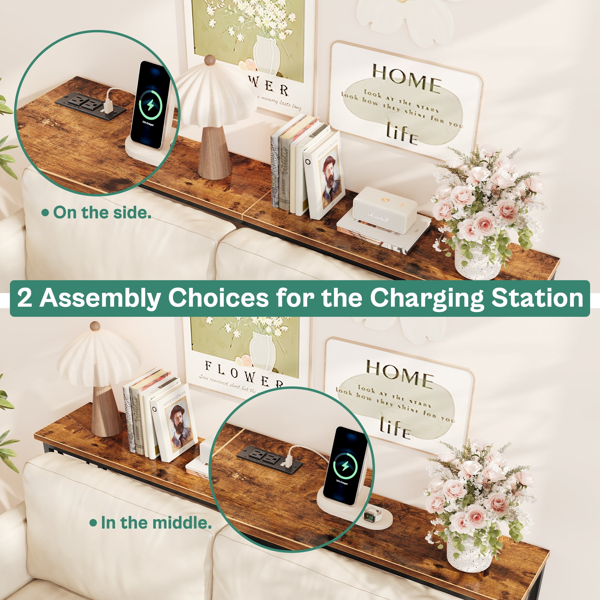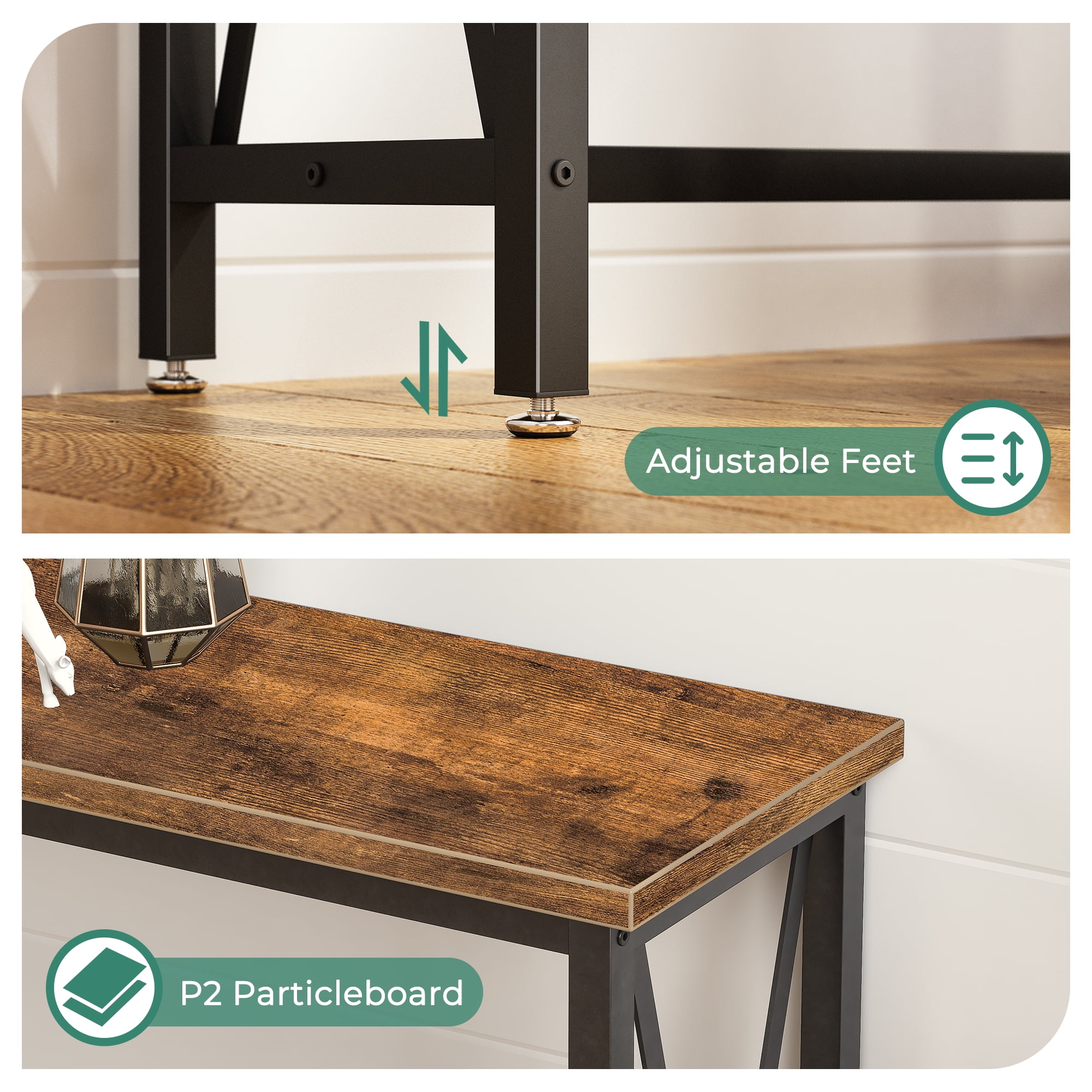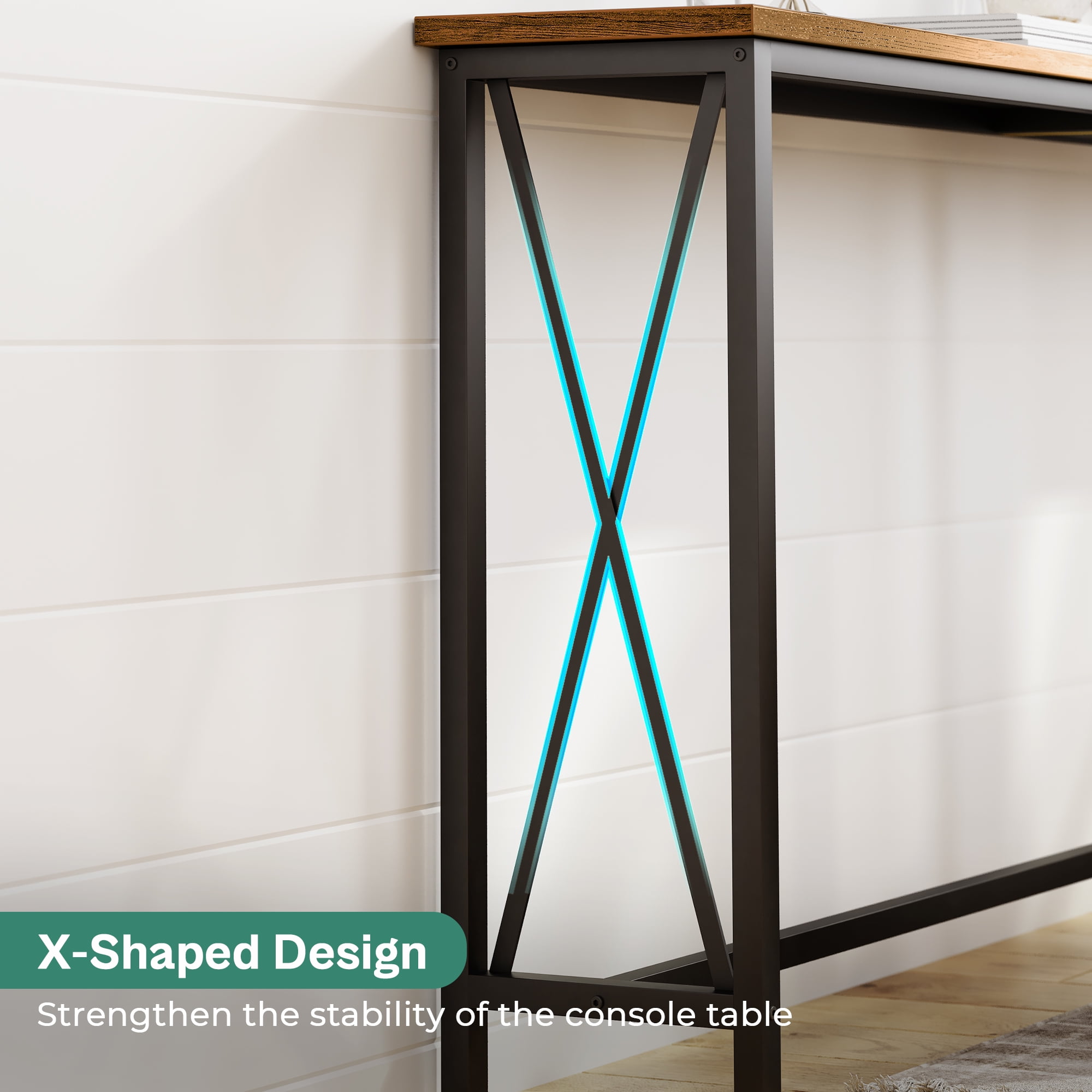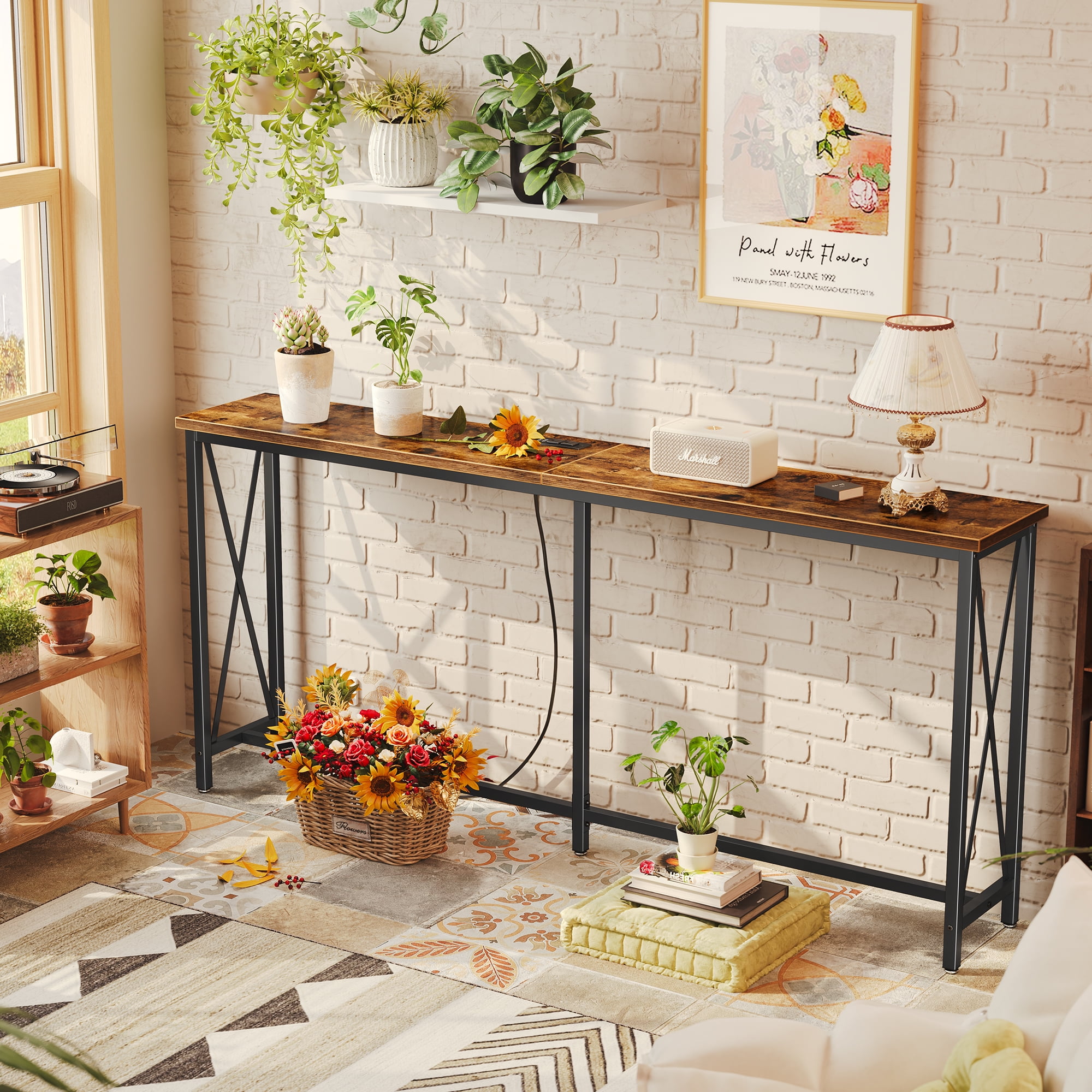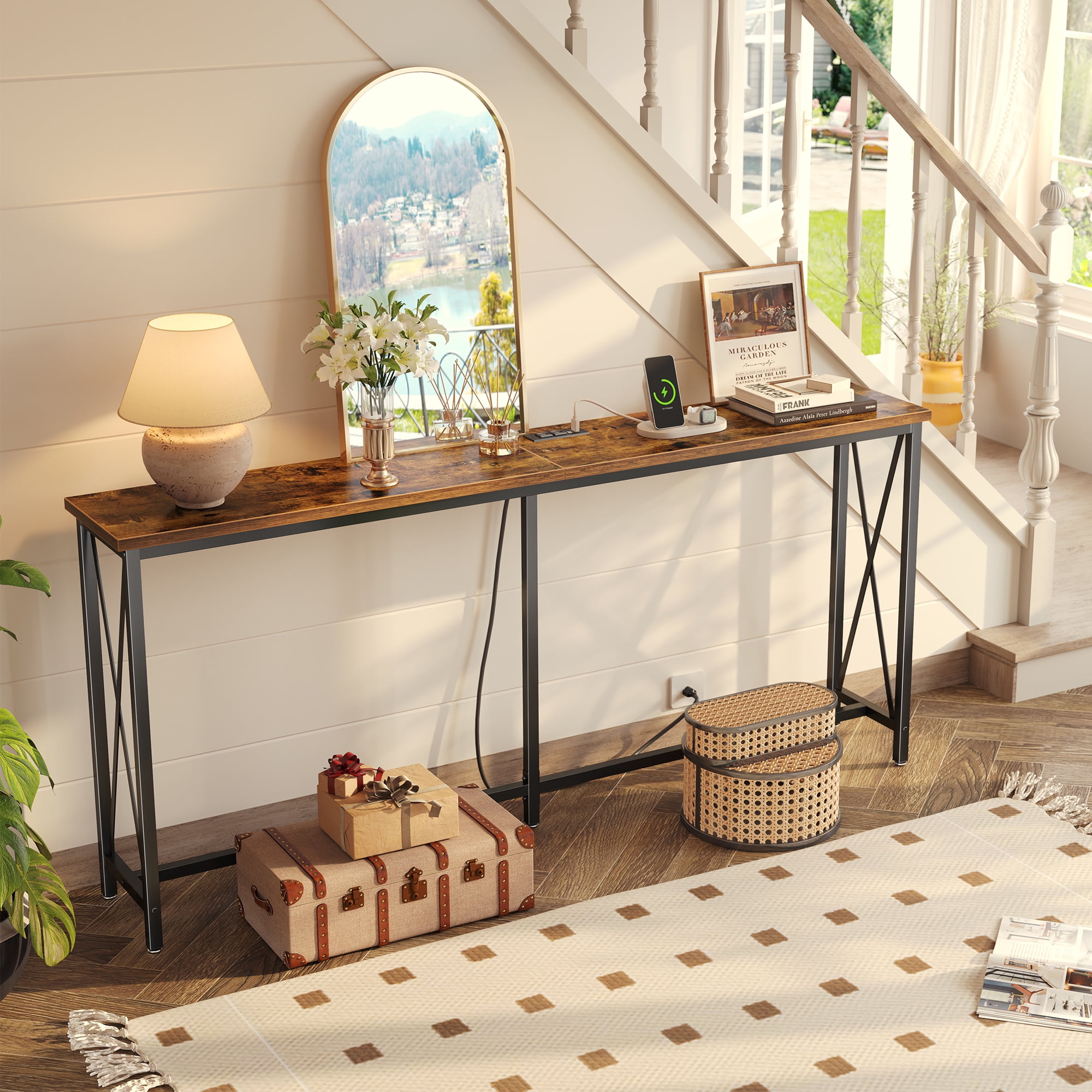 This 70-inch sofa table with charging station will complement your room and elevate your hallway or entryway with its versatile features. The console table features 2 AC outlets and 2 USB ports that can be used to charge your lamps, phones or laptop behind your sofa side. With a spacious desktop, you can keep decorative items or everyday essentials within reach. Made from solid particle board and sturdy metal frame, this skinny table for hallway is built to last. The X-shaped brackets and the adjustable feet give this skinny entryway table more stability on the uneven floors. Whether you want to use this table as a sofa side table to fill the sofa space, place this slim entryway table under the window as a place for your plants, or a display spot in the hallway and entryway, put it in the living room, this behind the couch table has got you covered. Invite this console table with power outlets to your home space to elevate the overall vibe.