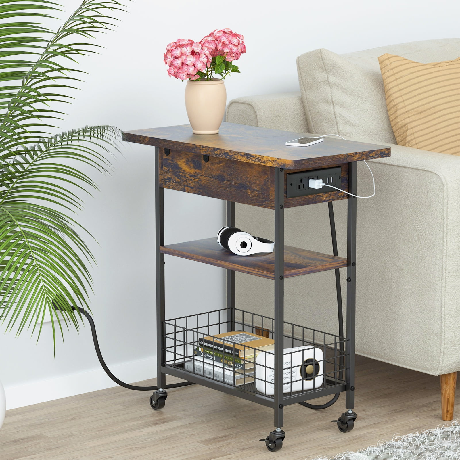 Softlife End Table with Charging Station, Narrow Flip Top Side Table with USB Ports and Outlets, Nightstand with Storage, Sofa Table for Living Room, Bedroom, Easy Assembly, Antique Brown