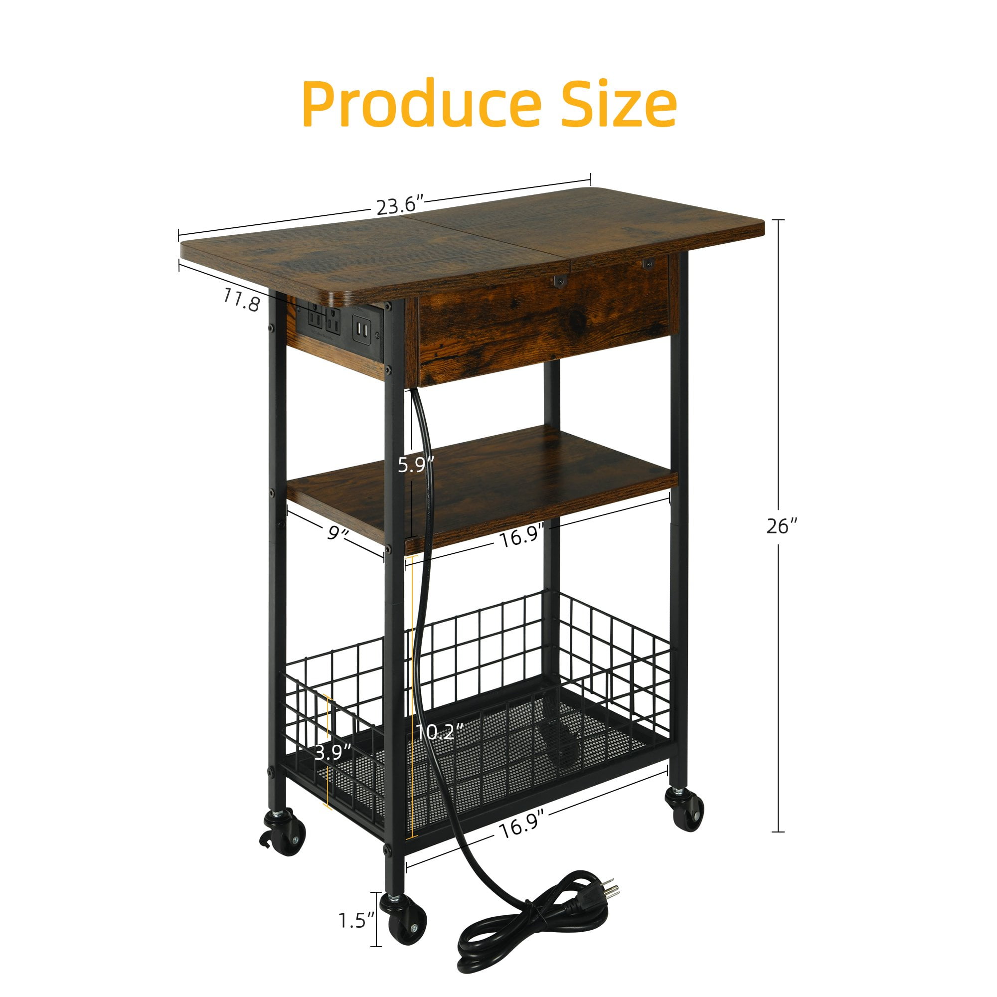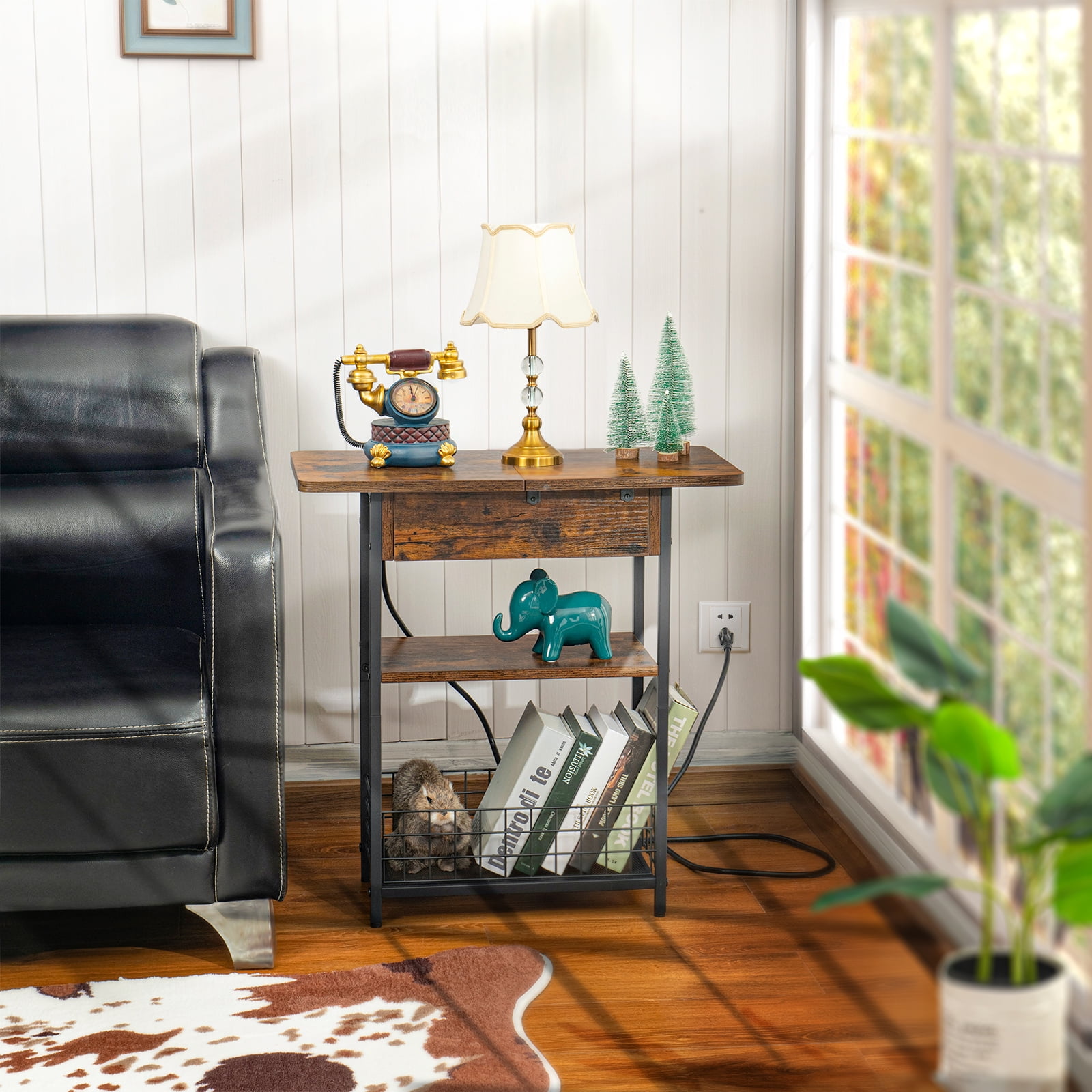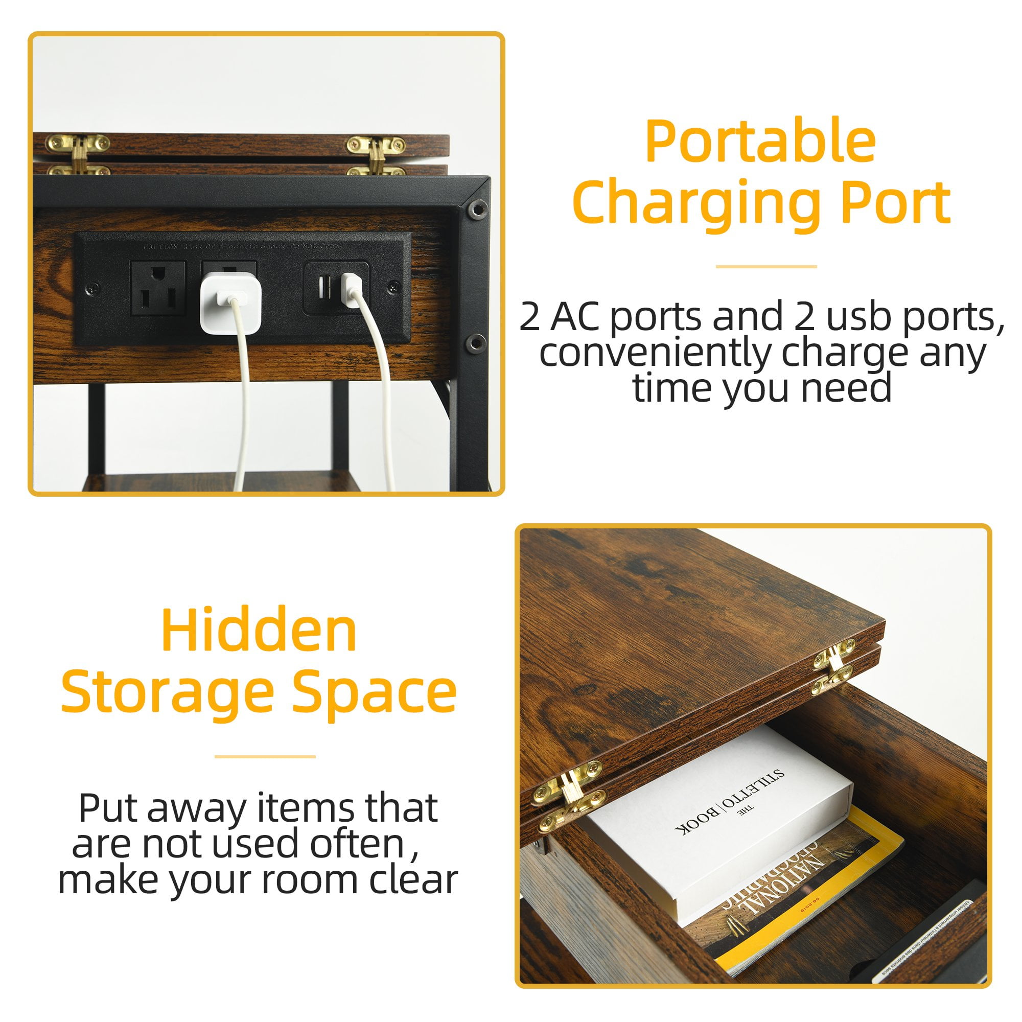 Industrial Style: A perfect combination of particleboard and sturdy metal frame! The nightstand with a charging station, drawer and shelves gives you plenty of storage space. Its rustic style can be paired with any furniture in your home. This side table is both a perfect decoration and a practical storage space! Beautiful and Useful Design: The 24 x 12 x 21.4 inches flip top nightstand with a 59 inches power cord helps you charge your electronic devices at will. You can put your decorations, books and other daily necessities on the side table. It is perfect for living room, bedroom, home office and small space So Stable: The side table comes with 4 adjustable feet which allows you to easily level the end table on uneven floors, and also protect the floor from scratches. Sufficient accessories will be provided to bring you a user-friendly experience Easy-To-Follow Assembly Steps: Tighten the screws in place and the assembly is done. The side table is simple in structure and comes with detailed instructions and clearly numbered accessories. Follow the steps and you’ll find that you’ll have a fancy end table with a charging station in no time! What Will You Get: A industrial end table (side table or nightstand) with durable engineered wood panels and classic black iron legs, a detailed instruction manual, and a numbered accessory pack.