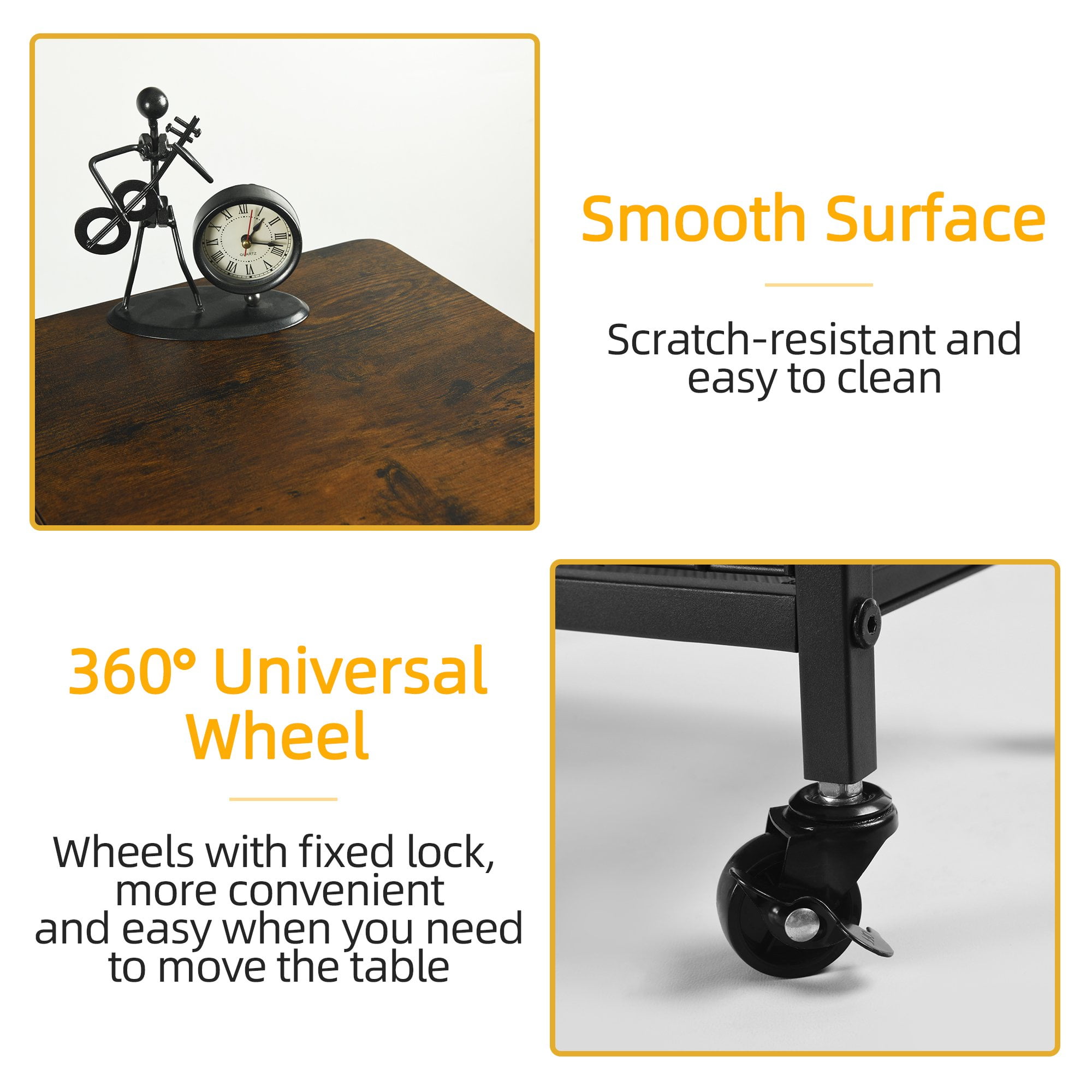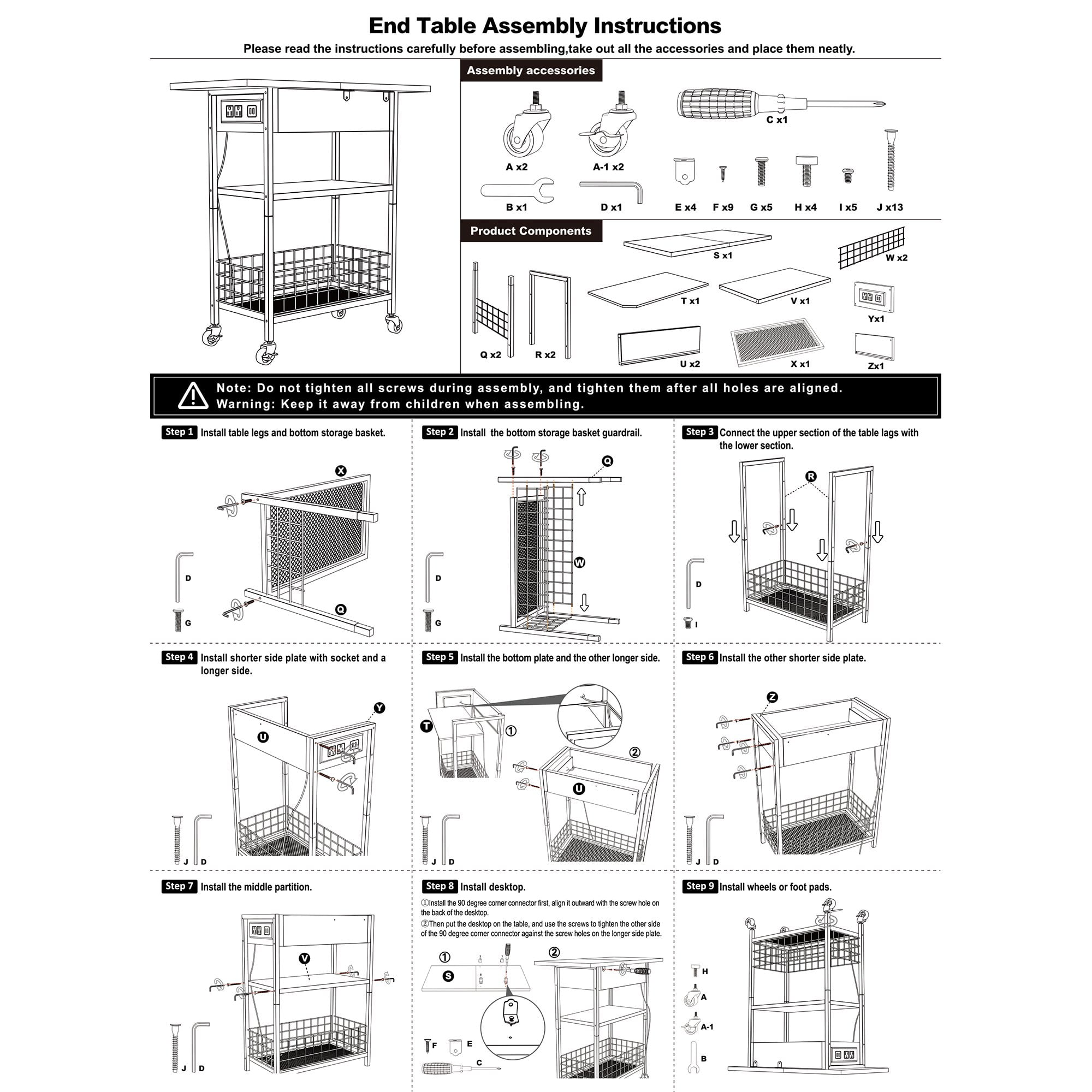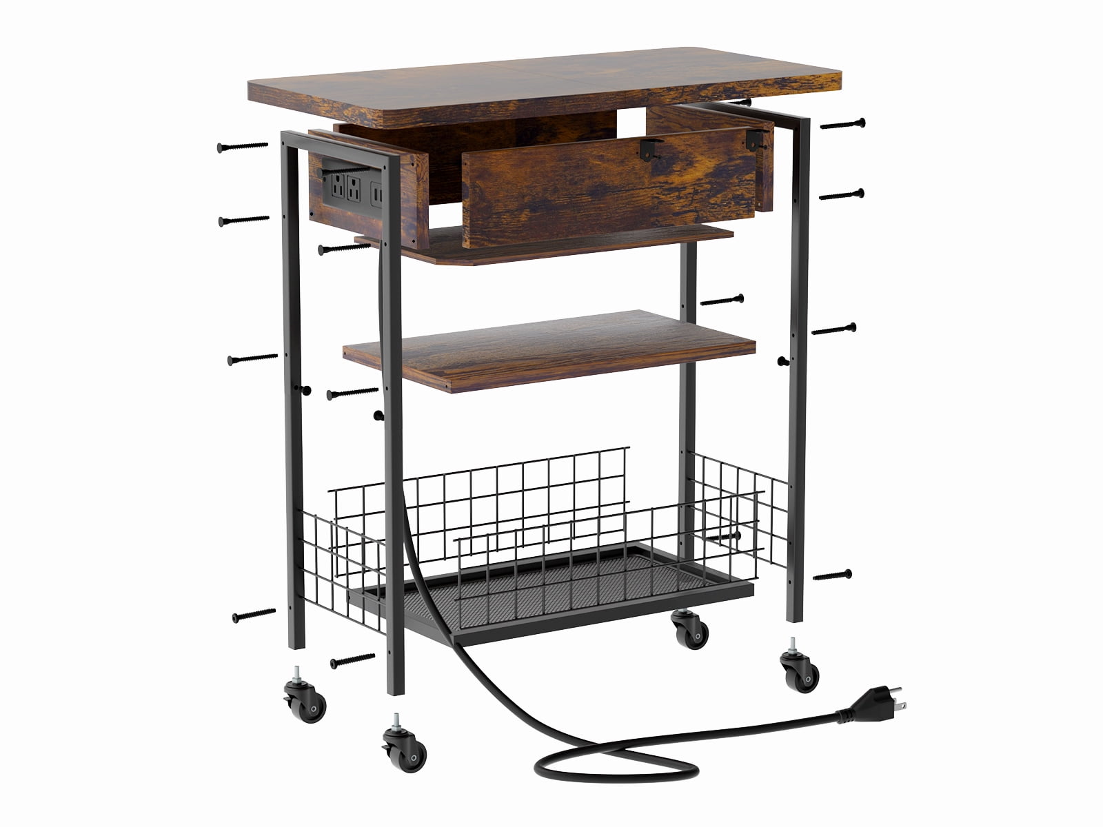 Industrial Style: A perfect combination of particleboard and sturdy metal frame! The nightstand with a charging station, drawer and shelves gives you plenty of storage space. Its rustic style can be paired with any furniture in your home. This side table is both a perfect decoration and a practical storage space! Beautiful and Useful Design: The 24 x 12 x 21.4 inches flip top nightstand with a 59 inches power cord helps you charge your electronic devices at will. You can put your decorations, books and other daily necessities on the side table. It is perfect for living room, bedroom, home office and small space So Stable: The side table comes with 4 adjustable feet which allows you to easily level the end table on uneven floors, and also protect the floor from scratches. Sufficient accessories will be provided to bring you a user-friendly experience Easy-To-Follow Assembly Steps: Tighten the screws in place and the assembly is done. The side table is simple in structure and comes with detailed instructions and clearly numbered accessories. Follow the steps and you’ll find that you’ll have a fancy end table with a charging station in no time! What Will You Get: A industrial end table (side table or nightstand) with durable engineered wood panels and classic black iron legs, a detailed instruction manual, and a numbered accessory pack.