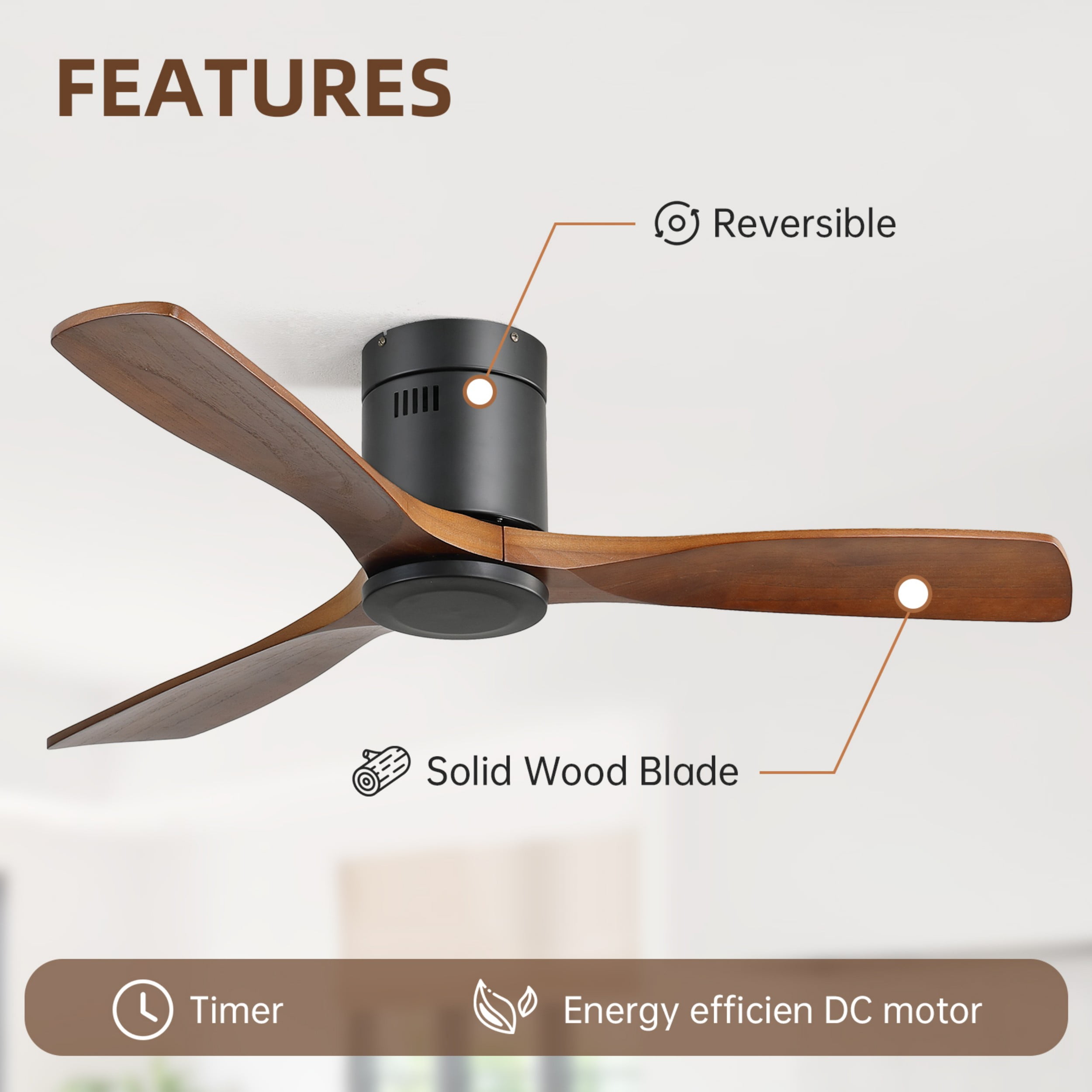 【Quiet DC Motor】 Enjoy the ultimate comfort with our low profile ceiling fan, featuring 3 wood blades that deliver a high cfm airflow of up to 5800 CFM. The whisper-quiet, high-speed velocity DC motor ensures a noise level below 30dB, making it perfect for light sleepers. 【Ceiling Fan with Remote Control】 The remote control makes operating the lights easy and convenient. Our 52 inch ceiling fan with light has a multi-functional remote, 6 fan speeds, 3 sleep timer intervals (1/4/8H), & reverse airflow option. With reversible function and variable speeds, you can enjoy the fan’s benefits all year round. 【Indoor Outdoor Flush Mount Ceiling Fan】Our wet-rated indoor outdoor ceiling fan is suitable for various spaces such as bedrooms, nurseries, living rooms, kitchens, dining rooms, and covered outside patios or porches. However, please note that our damp-rated exterior ceiling fans should not be exposed to water. Designed specifically for flush mounting, this fan is not suitable for sloped & vaulted ceilings. With a height of only 7.8 inches, it is perfect for low profile ceilings. 【75% more Energy-efficient】Experience the benefits of our modern ceiling fan with its sleek wood blade design and noiseless DC motor. The DC ceiling fan is typically 75% more energy-efficient than AC fans, significantly reducing your electricity consumption. Additionally, the smart lighting feature allows you to control and optimize your energy usage. 【Easy to Install & Quality Warranty】Installing the fan is a breeze with our user-friendly manual and video. Our dedicated customer support team is available to provide excellent after-sales service, guaranteeing your happiness with your purchase.