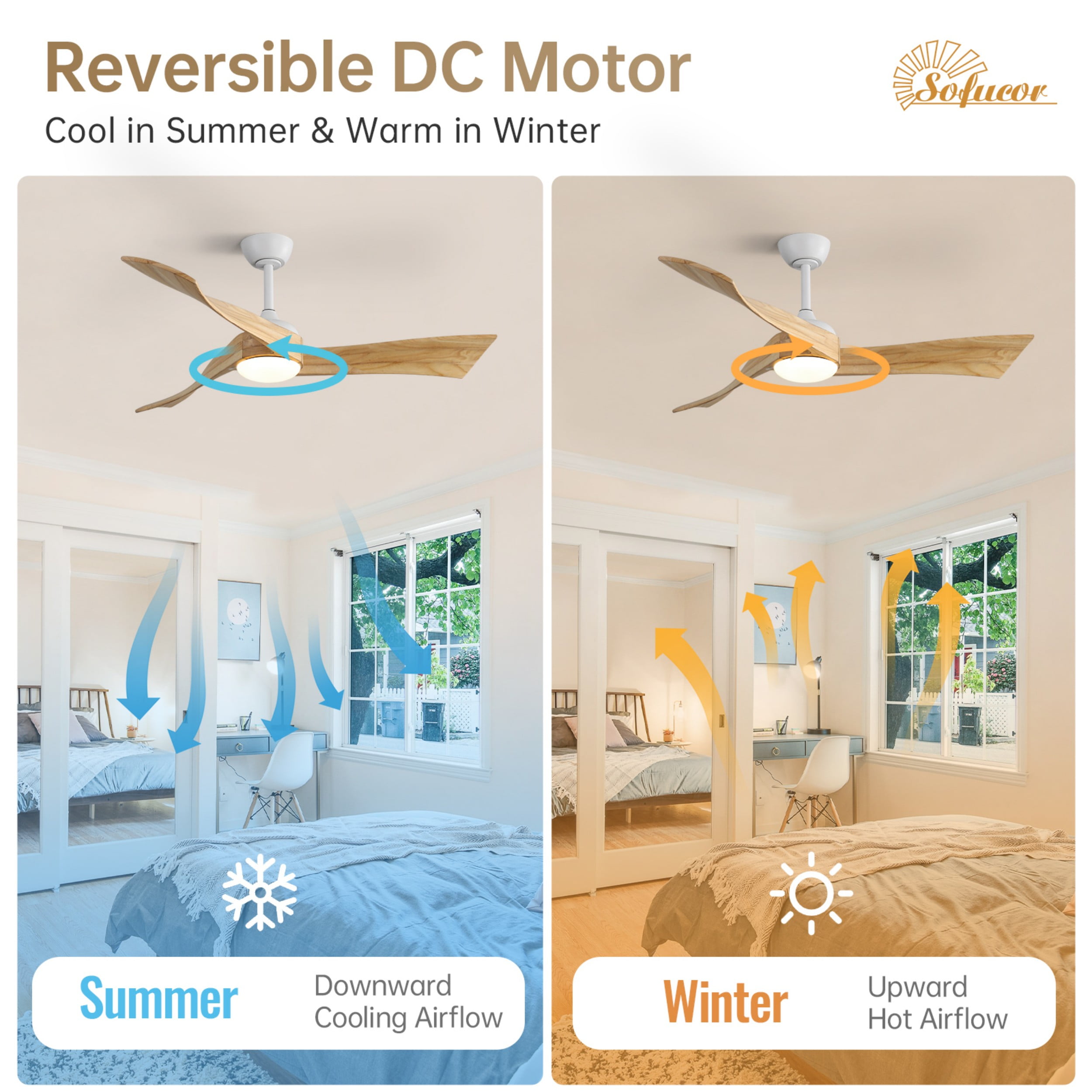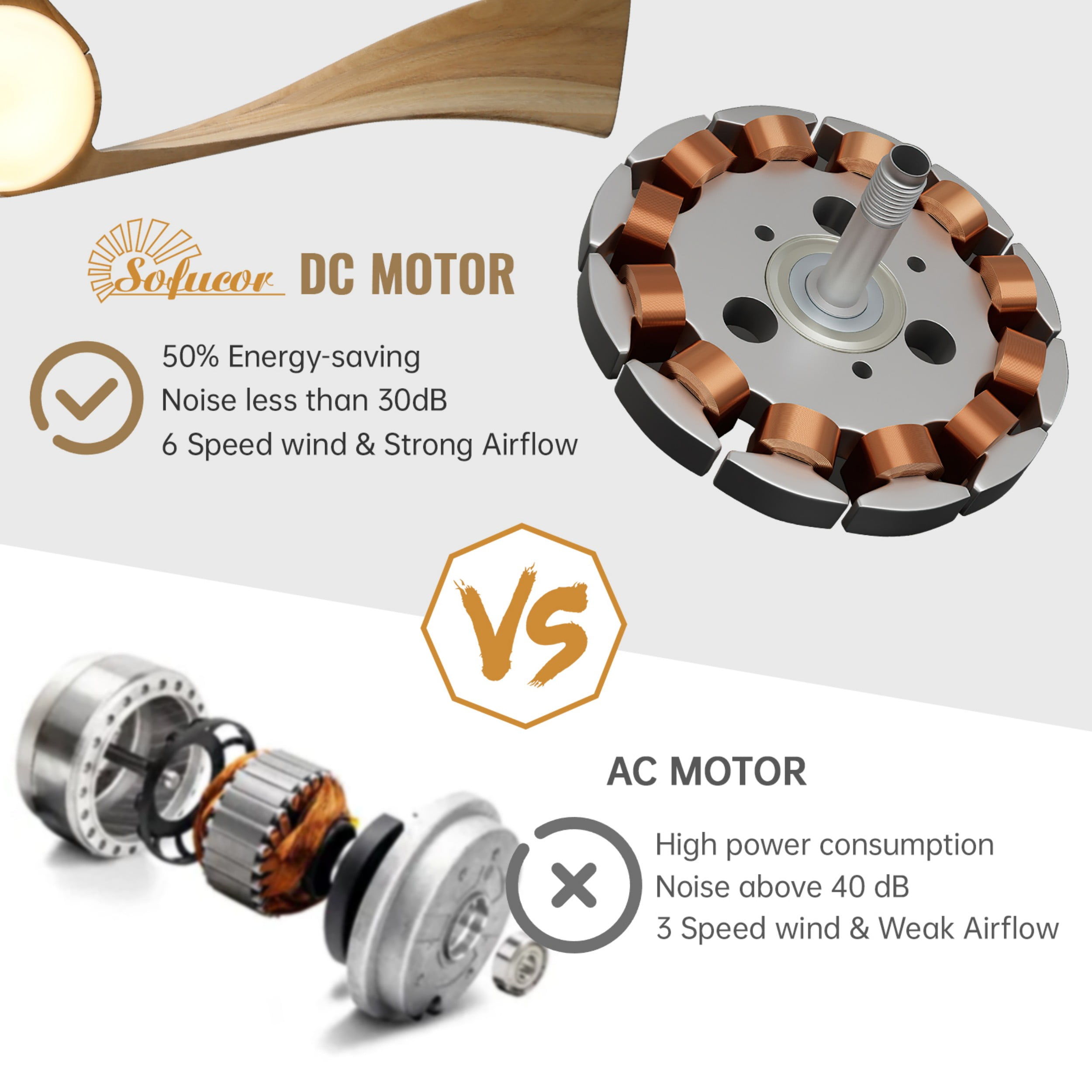 52 Inch Ceiling Fan with Lights: Sofucor 52 inch wood ceiling fan suits for medium or larger size room from 100sq.ft up to 300sq.ft, such as a kitchen, bedroom, living room, dining room,patio or common areas. Modern Ceiling Fan: Copper DC motor provides strong air flow and quiet operation. The reversible function can cool down your room during summer, and help rotate warm air and cutting down on energy costs in winter by holding down the reversible button. Dimmable LED Light: Dimming LED lamps can save energy and changes the visual appearance and mood of your space. It capable to dimming from 100% to 10% via remote controling. The long-lasting bulbs have longer lifespan than traditional bulbs. Ceiling Fan with Remote: The led lights ceiling fan had setting the timer function, 1/4/8 timing function. 6 speed let you choose your wanted air flow. You can choose anti-theft function when leaving home. Easy to install: Diameter 52 inch in diameter, 2 down-rods: 5 inch and 10 inch, for low ceilings or high ceilings. And the wood ceiling fan can be installed on a ceiling with maximum slope of 15 degree .