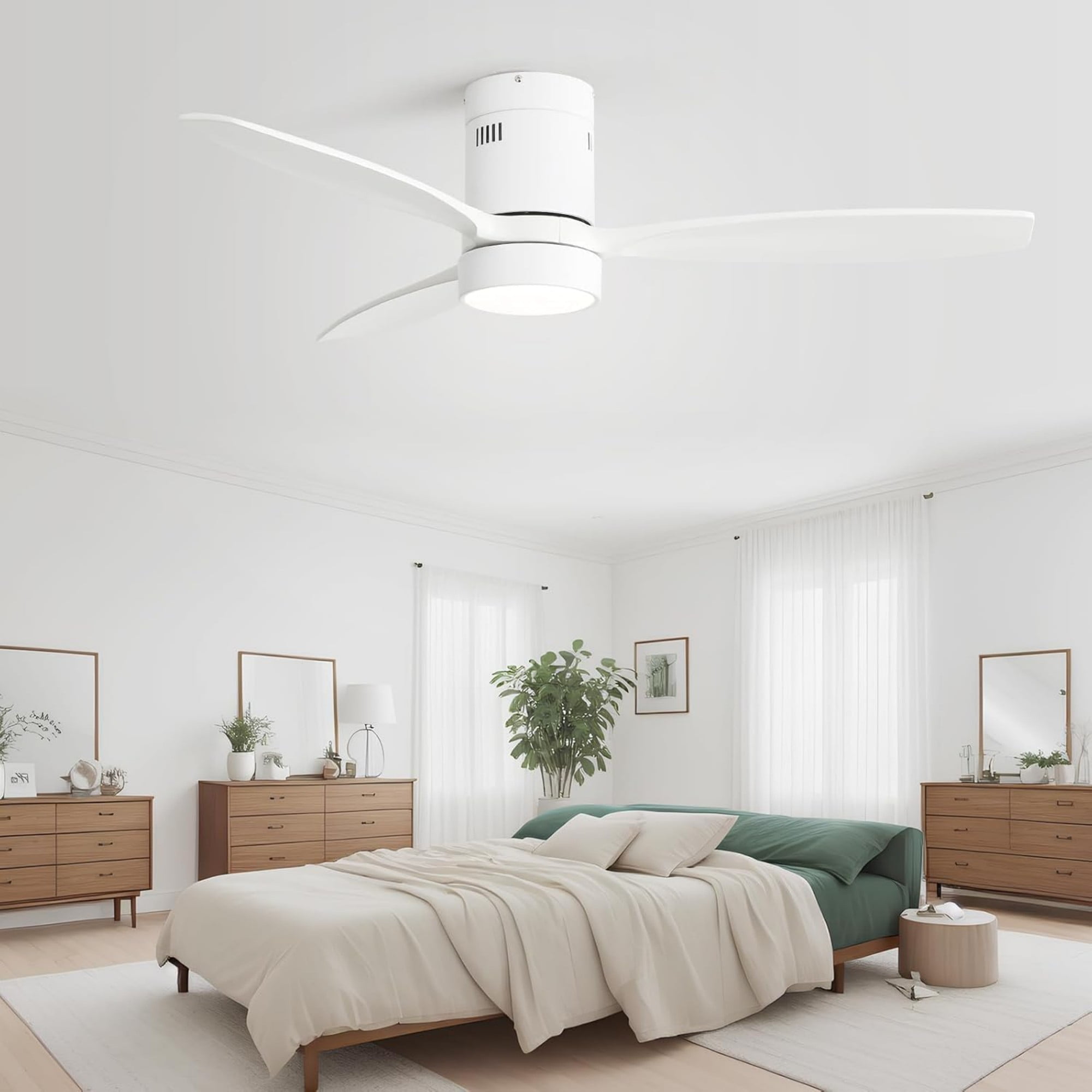 Sofucor 52 inch Wood Low Profile White Ceiling Fans with Lights and Remote, Modern Flush Mount Quiet Ceiling Fan for Bedroom, Reversible DC Moto
