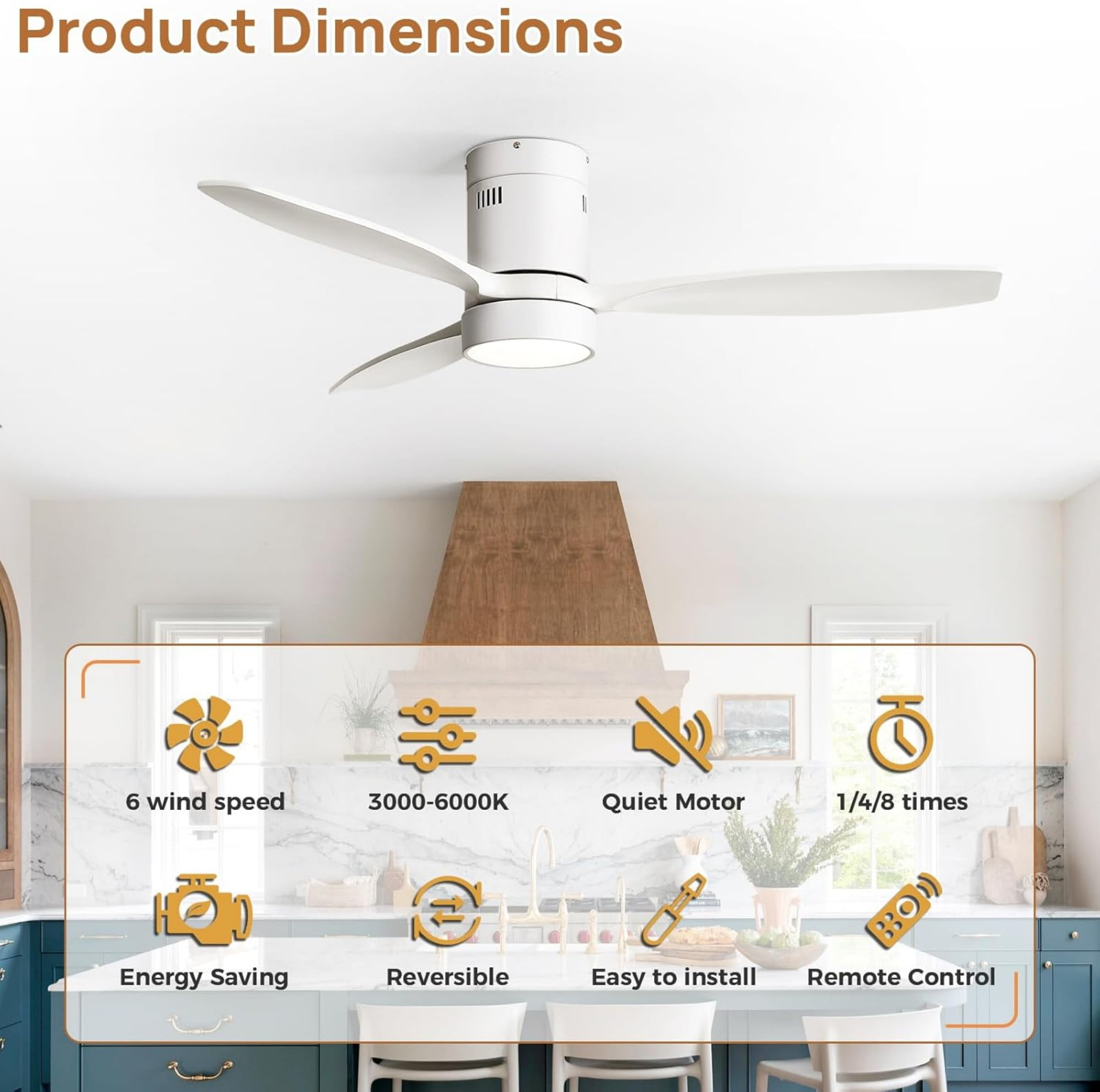 Upgrade your home comfort with Sofucor Ceiling Fans—combining stylish looks with smart features. The 52 inch compact design includes energy-saving LED lights, using 75% less electricity than regular fans while running quietly. Easy to use with a minimalist design, it effortlessly elevates your home decor. Ceiling Fans with Lights and Remote:6 adjustable fan speeds (gentle breeze to powerful airflow) and tune white light (warm to cool) with one remote. Set 1/4/8-hour auto-off timers. Operate fan and lights independently. (After being fixed, the remote can function as a wall switch.) Low Profile Flush Mount ceiling fan: With its modern, ultra-low-profile design, it’s ideal for spaces ranging from 100 to 324 square feet. Perfect for creating comfortable spaces in farmhouse, bedroom , living office, study, kitchen, as well as outdoor transitional spaces (covered patio, pergolas,breezeways, pergolas or shaded arbors). Rainwater should not come into direct contact with the unit. Silcent Experience Space: Sofucor ceiling fan with light is crafted for light sleepers, operating at a low 35dB . Its noiseless airflow brings peaceful comfort to bedrooms, kids’ rooms, and spaces for the elderly. Perfect for families with babies or seniors, where nights are filled only with gentle breezes – softer than any machine noise. Reversible DC Motor: High-quality motors provide smooth operation, resulting in peaceful surroundings. With a reversible DC setting, you can aim the fan downward in summer to cool rooms 50% faster. In winter, adjust it upward to push warm air downward—this saves on heating bills. Kids and older can adjust the airflow to their liking for gentle comfort. Adjustable Color Temperature: Sofucor 52 inch ceiling fan allows you to freely adjust brightness (10%-100%) and switch between three color options: warm yellow (3000K), natural white (4000K), and bright white (6000K). For example, dim the lights for a cozy movie night, or brighten them up for homework sessions or family gatherings. Adjust the lighting anytime to suit your needs and create the perfect ambiance for any occasion. Easy Installation & Lifetime Motor Maintenance: With comprehensive instructions and a detailed video guide, you can achieve a seamless setup. Should you encounter any issues, our dedicated 24-hour technical team is here to assist you. Plus, we offer a 3-year protection plan for the ceiling fan and Lifetime maintenance for the motor. Choose us for quality and reliability.