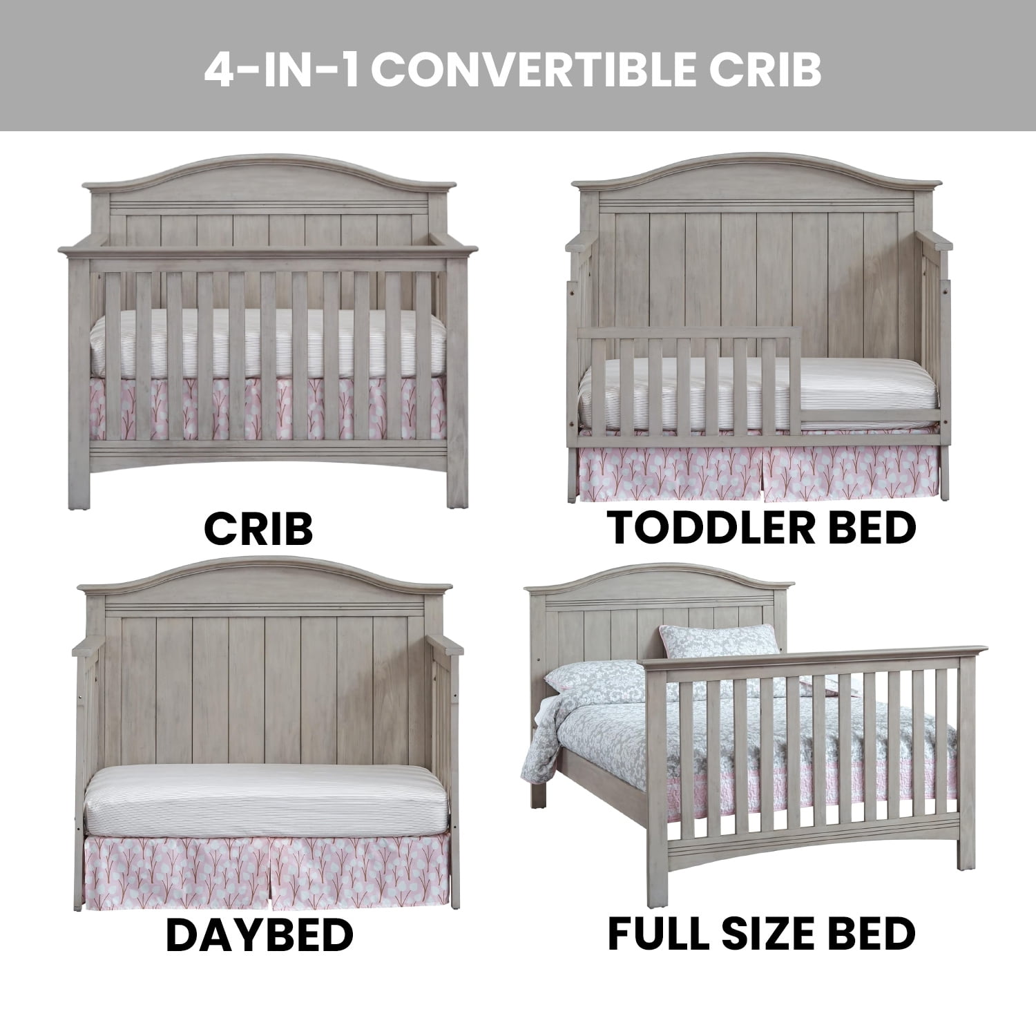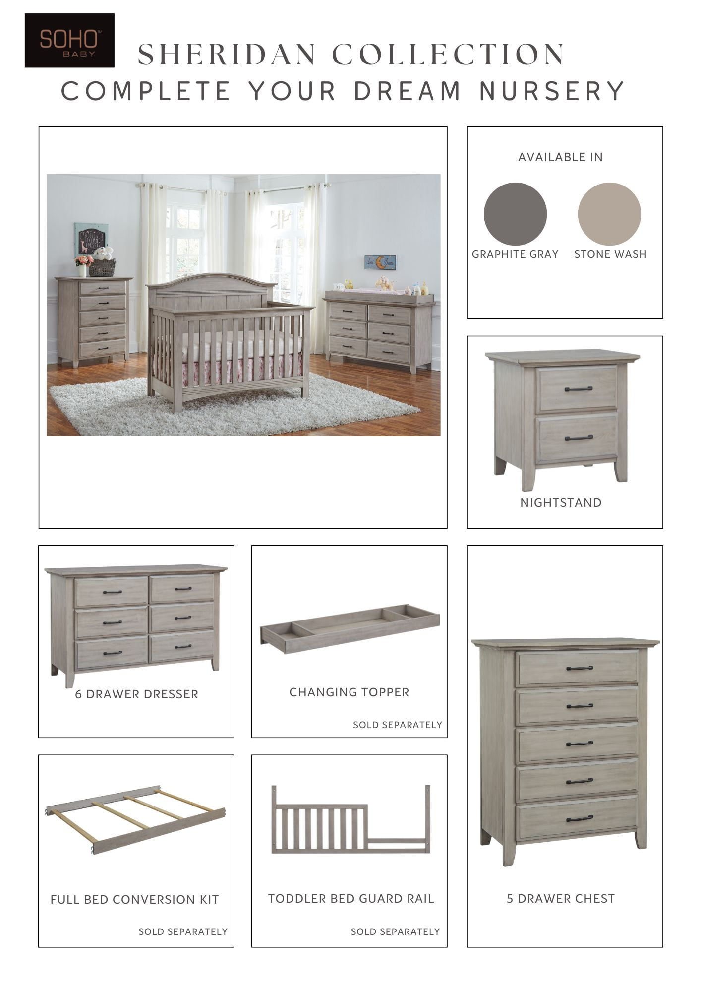 SAFETY FIRST: Soho Baby Nursery Furniture is made to the highest safety standards that meet those set by the Consumer Product Safety Commission (CPSC) and American Society for Testing and Materials (ASTM); Our furniture endures rigorous testing by third-party labs to guarantee compliance with U.S. and Canada market so you can rest assure that your child is sleeping in a safe sleep environment SOPHISTICATED STYLING: The Sheridan Crib boasts an intricate full panel gently curved headboard with beautifully refined vertical shiplap detail complemented by horizontal clean line accents, and a grainy wire brush finish PREMIUM QUALITY & CRAFTSMANSHIP: Made from solid woods and wood veneers and backed by a 1 Year Limited Manufacturer’s Warranty, this crib is expertly crafted from solid and sustainably sourced wood providing quality construction creating a safer, sturdier sleep environment for your baby THOUGHTFULLY DESIGNED: Designed to fit a standard-sized crib mattress, this Soho Baby 4-in-1 Crib offers a convenient convertible design that will grow as your child grows by converting from a crib to toddler bed, daybed, and full-size bed with 3-levels of mattress height adjustments for your growing child GROWS WITH YOUR BABY: To guarantee your child’s crib can be converted as they grow, we highly recommend purchasing the compatible crib conversion accessories such as toddler guard rail and full bed conversion kit within a year of your initial crib purchase. This helps avoid any potential issues with stock availability or product discontinuation. Secure your conversion accessories early to ensure your little one enjoys a smooth transition from crib to toddler bed and beyond.