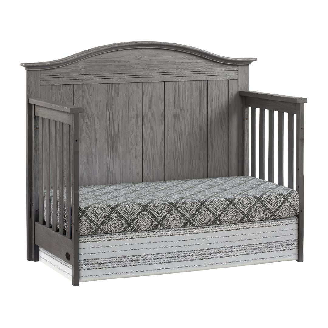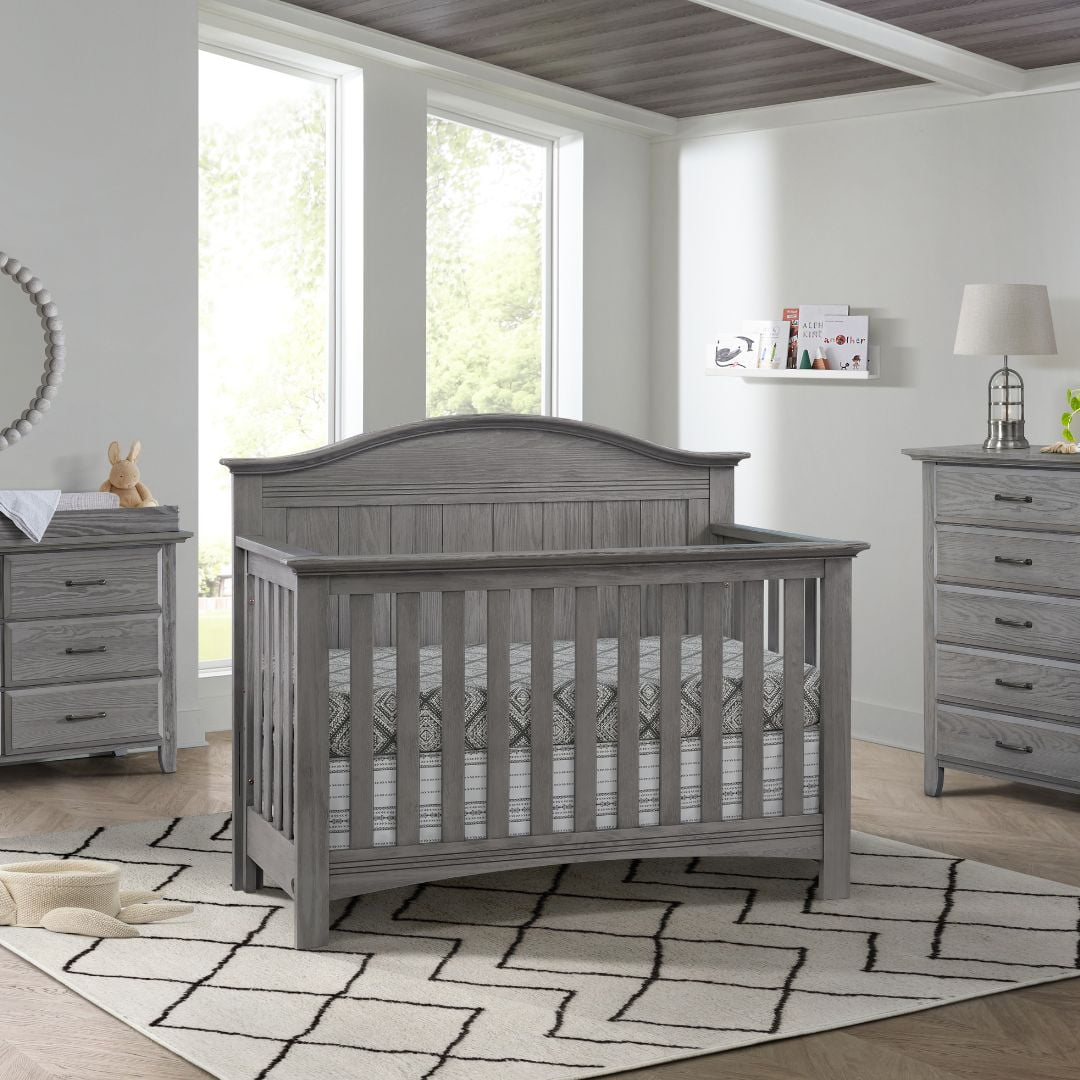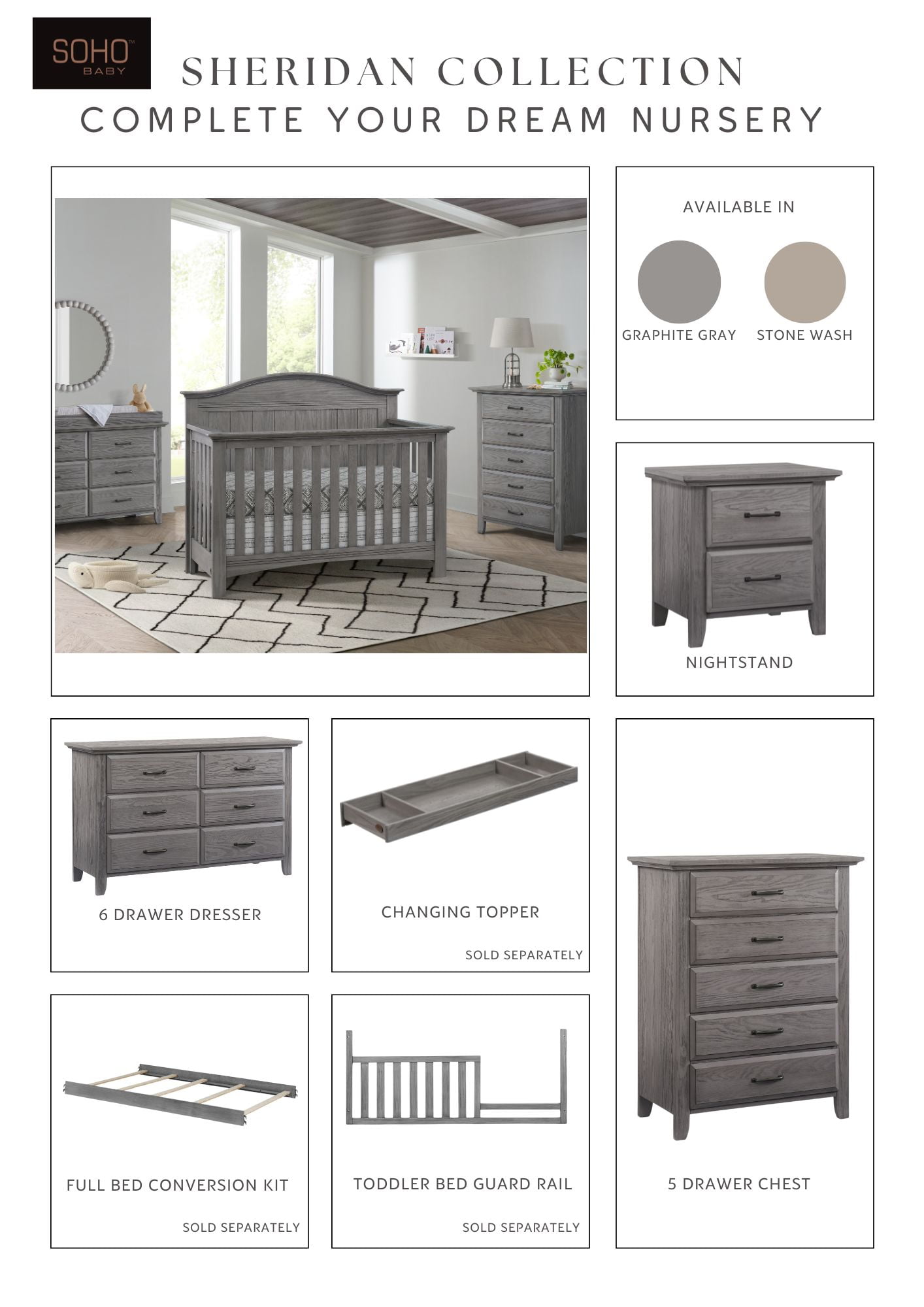 SAFETY FIRST: Soho Baby Nursery Furniture is made to the highest safety standards that meet those set by the Consumer Product Safety Commission (CPSC) and American Society for Testing and Materials (ASTM); Our furniture endures rigorous testing by third-party labs to guarantee compliance with U.S. and Canada market so you can rest assure that your child is sleeping in a safe sleep environment SOPHISTICATED STYLING: The Sheridan Crib boasts an intricate full panel gently curved headboard with beautifully refined vertical shiplap detail complemented by horizontal clean line accents, and a grainy wire brush finish PREMIUM QUALITY & CRAFTSMANSHIP: Made from solid woods and wood veneers and backed by a 1 Year Limited Manufacturer’s Warranty, this crib is expertly crafted from solid and sustainably sourced wood providing quality construction creating a safer, sturdier sleep environment for your baby THOUGHTFULLY DESIGNED: Designed to fit a standard-sized crib mattress, this Soho Baby 4-in-1 Crib offers a convenient convertible design that will grow as your child grows by converting from a crib to toddler bed, daybed, and full-size bed with 3-levels of mattress height adjustments for your growing child GREENGUARD GOLD CERTIFIED: The Soho Baby Sheridan4-in-1 Convertible Crib has achieved GREENGUARD GOLD Certification; GREENGUARD GOLD Certified products have undergone rigorous testing for over 10,000 chemical emissions, ensuring that this product is certified for low chemical emissions into indoor air during product usage COMPLETE NURSERY COLLECTION: The Sheridan Collection by Soho Baby in Graphite Gray features a 4-in-1 Convertible Crib, 2-Drawer Nightstand, 5-Drawer Dresser, 6-Drawer Dresser, Changing Topper, Toddler Bed Guard Rail, Full-Size Bed Conversion Kit and Soho Baby Crib Mattress, sold separately; The Sheridan Collection is available in Graphite Gray and Stone Wash finishes ASSEMBLED DIMENSIONS: Measuring 32.25 in. W x 58.88 in. D x 47.50 in. H (79.40 lbs.), this full-size Soho Baby Crib arrives ready to assemble and includes hardware for assembly WEIGHT CAPACITY: 50 pound weight capacity when used as a crib, toddler bed, or day bed; 400 pound weight capacity when converted to a full-size bed GROWS WITH YOUR BABY: To guarantee your child’s crib can be converted as they grow, we highly recommend purchasing the compatible crib conversion accessories such as toddler guard rail and full bed conversion kit within a year of your initial crib purchase. This helps avoid any potential issues with stock availability or product discontinuation. Secure your conversion accessories early to ensure your little one enjoys a smooth transition from crib to toddler bed and beyond.