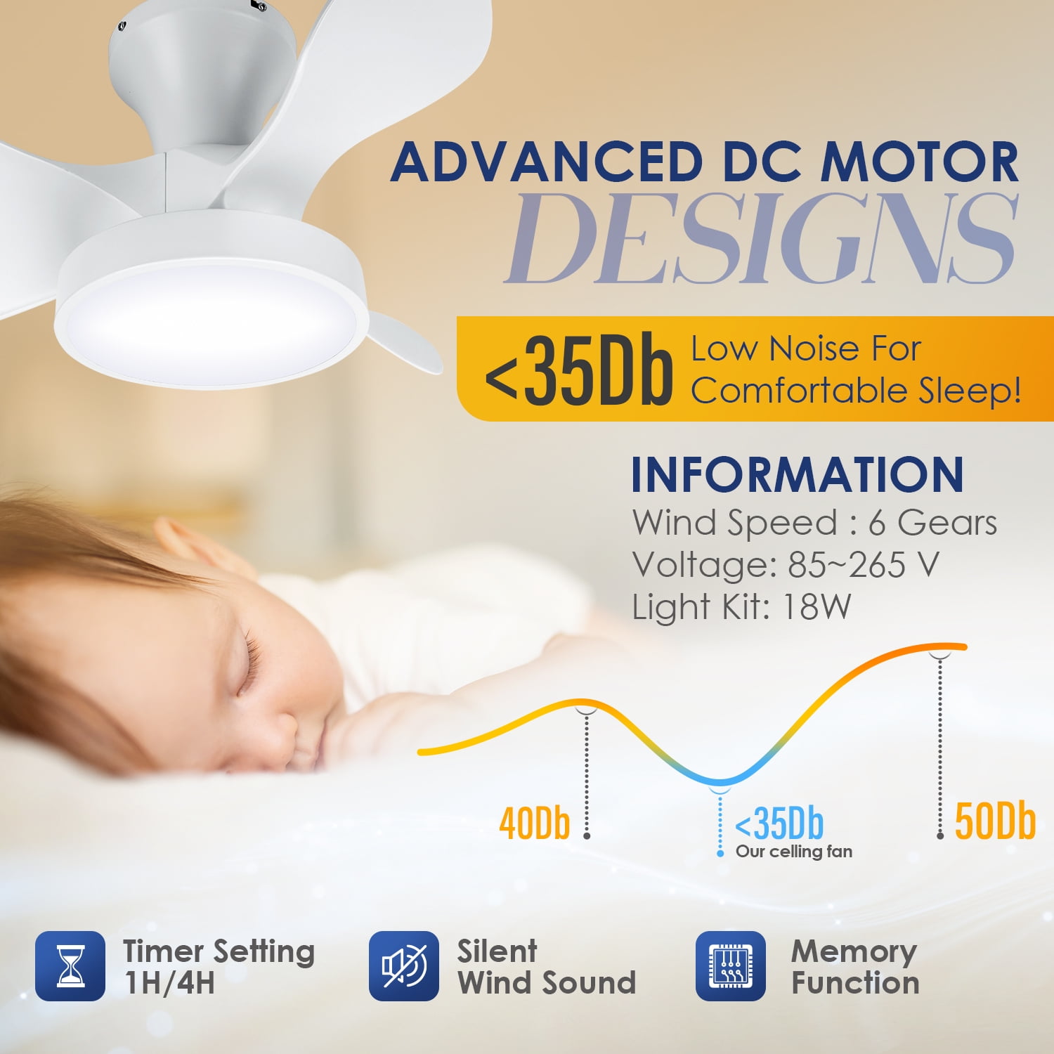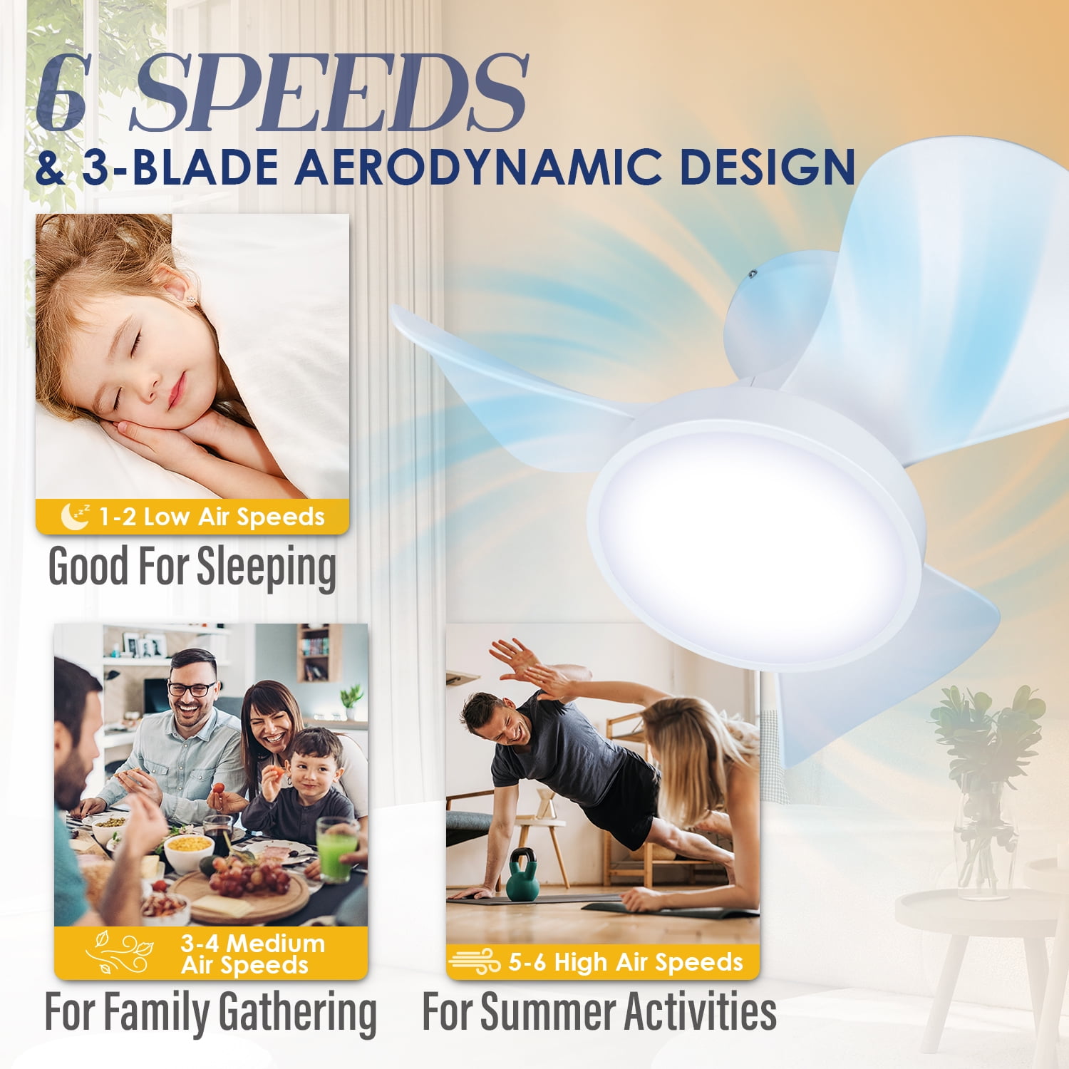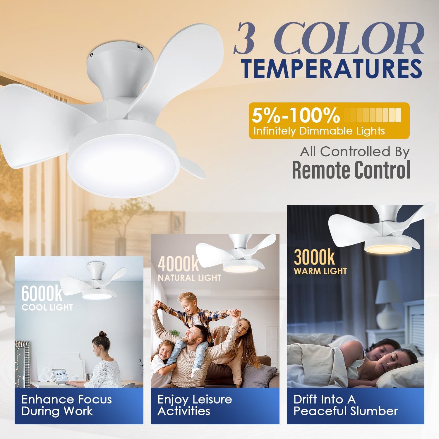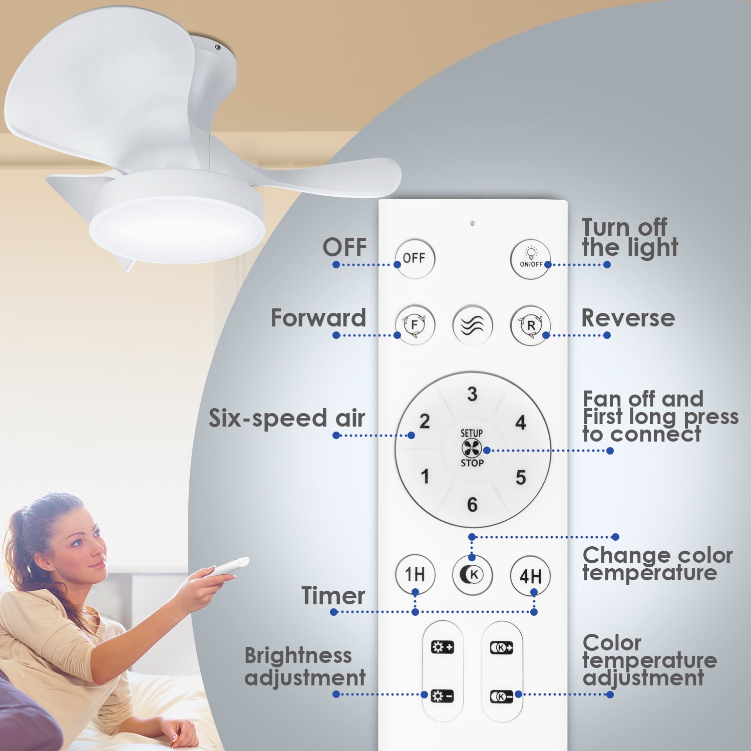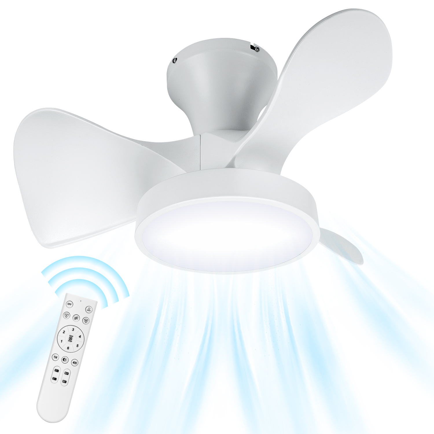 Soilsiu 6 Speed Quiet Reversible Motor 3 Color Temperature Ceiling Mount Ceiling Fan & Light Remote Controls 22-inch white ceiling fan designed for small spaces Features a low profile for flush mount installation Equipped with a remote control for convenient operation 6-speed quiet reversible motor for customizable airflow 3 color temperature dimming options for versatile lighting Modern smart design suitable for bedrooms and indoor spaces Energy-efficient LED light for enhanced illumination Ideal for creating a peaceful and relaxing environment in your home