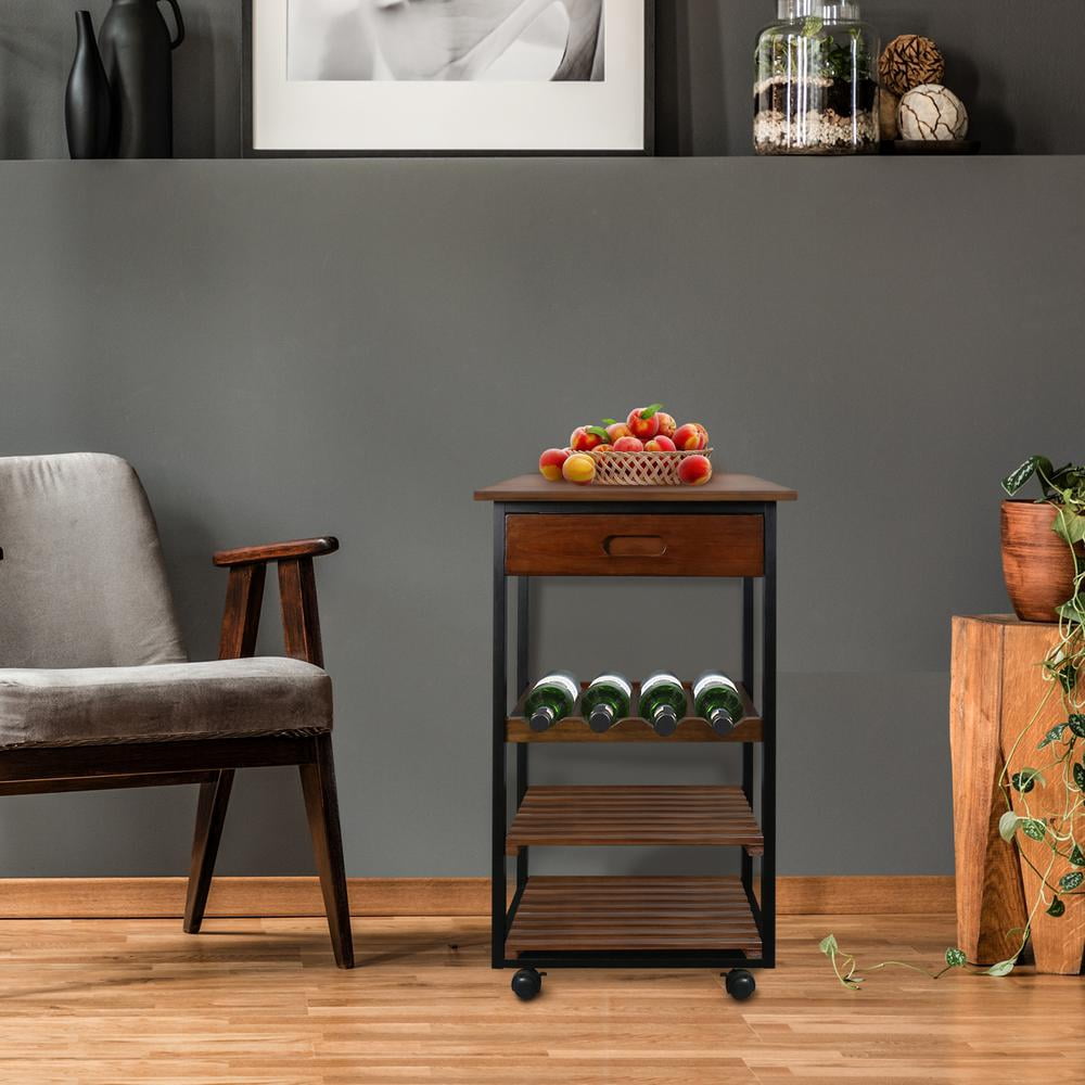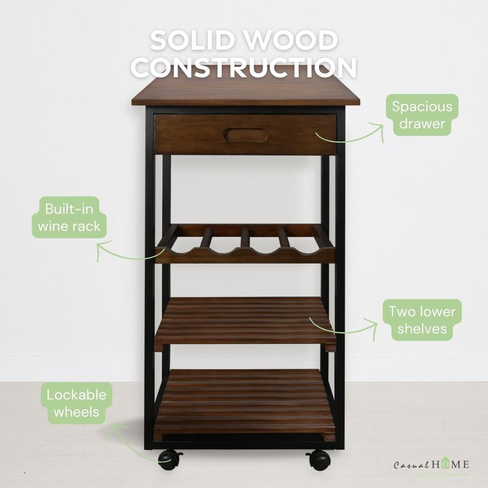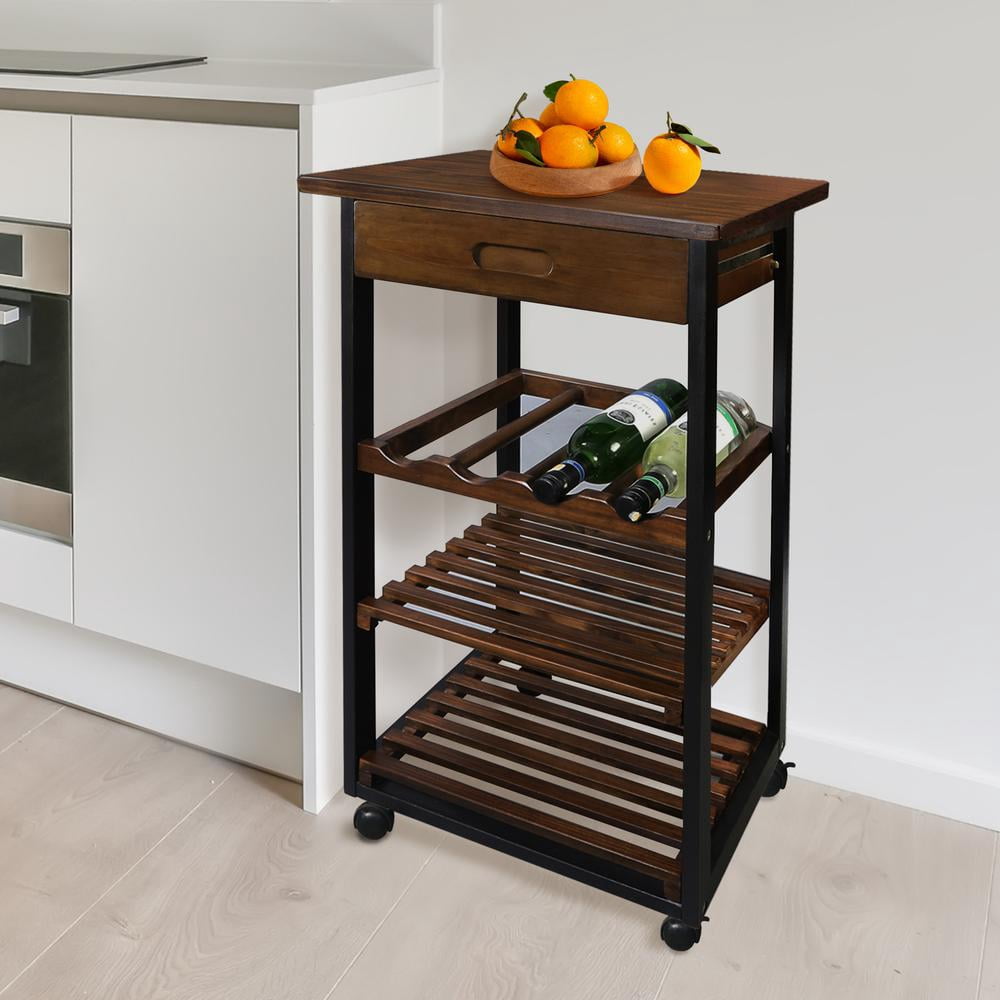Casual Home Solid Wood Small 4-Tier Rolling Kitchen Cart with Wine Rack and Drawer