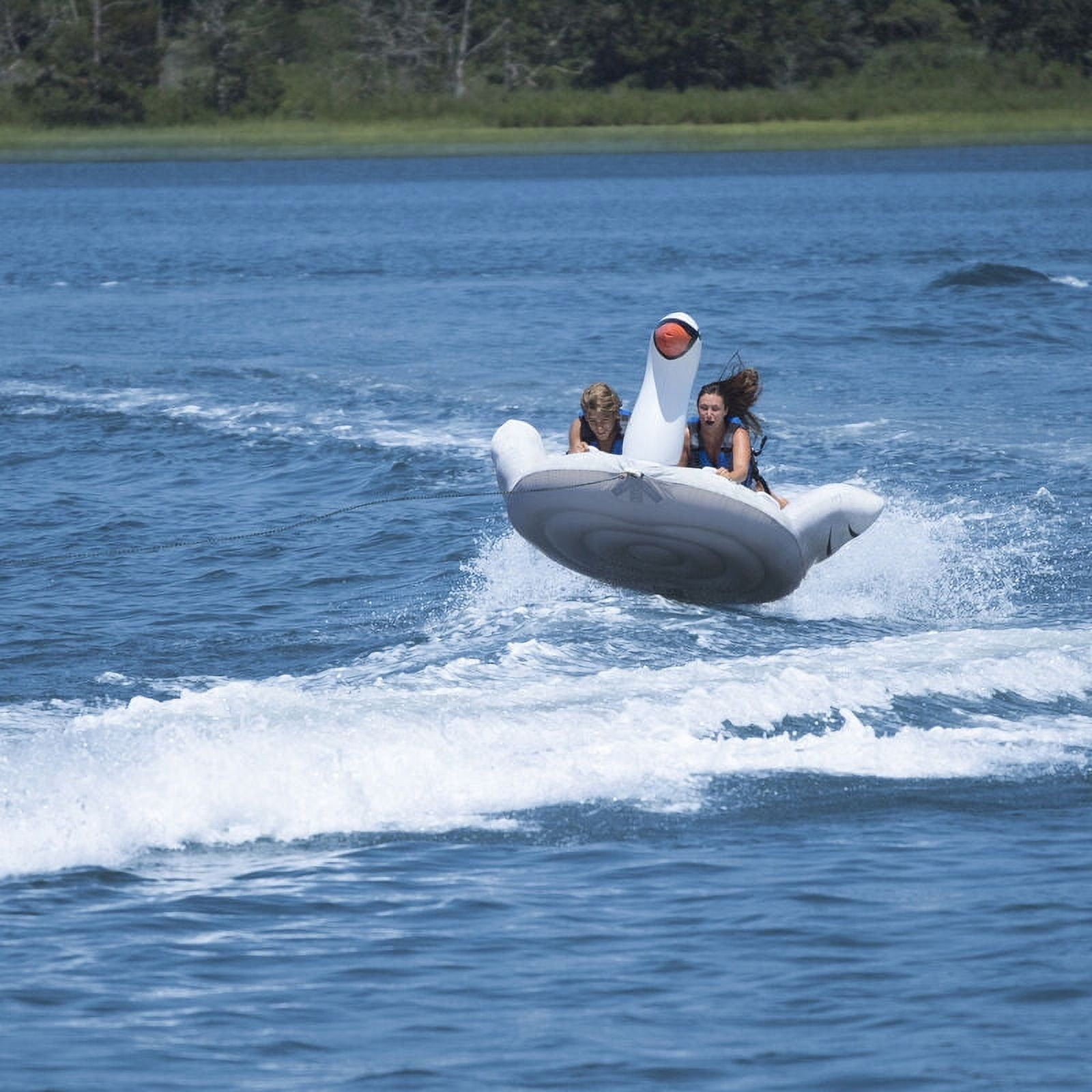 Gracefully glide over the water in style on this towable swan. Durable and comfortable, this iconic swan is made to accommodate 1-2 riders. Designed thoughtfully with a nylon cover, comfort grips and a quick connect adapter for tow rope to make your experience as seamless and fun as possible. Now you can grace your favorite calm body of water with the unique swan towable. Always wear a properly fitted life jacket, and never tow more than one tube at a time, or use tube as a personal floatation device. Always ensure tow rope is clear of all body parts prior to and during use.