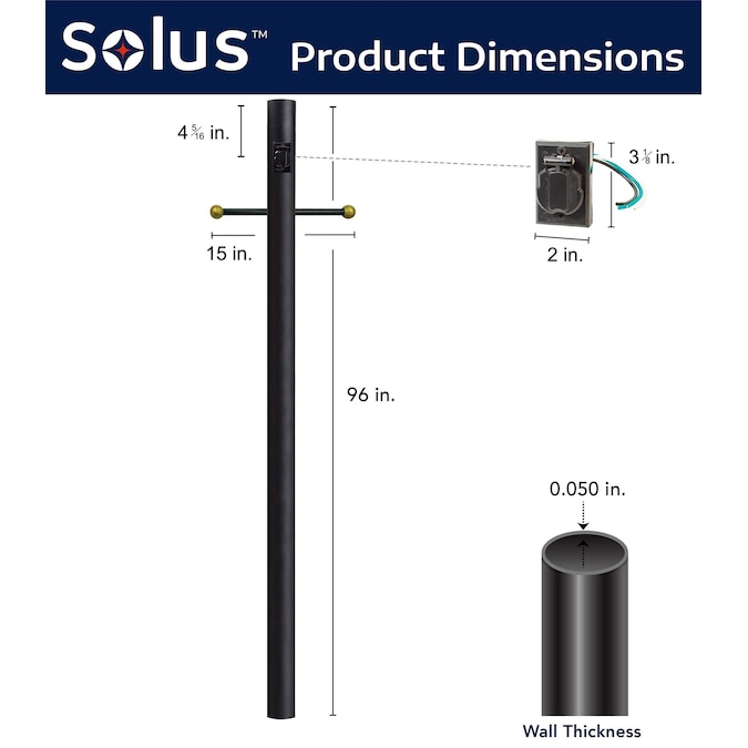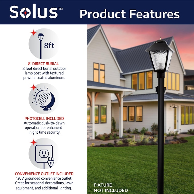 The 8′ Post features a textured powder coated aluminum and corrosion resistant body to hold up year round in all outdoor conditions. Installation is easy and simple, bury directly into the ground (suggested burial depth of 18″). The 8′ Lamp Post fits standard 3 Inch post top fixtures and includes an inlet hole for attachment.