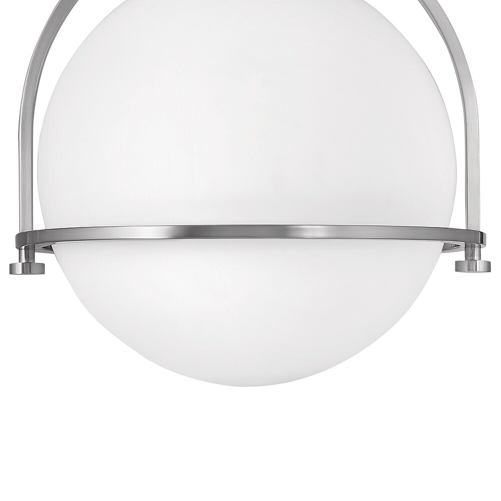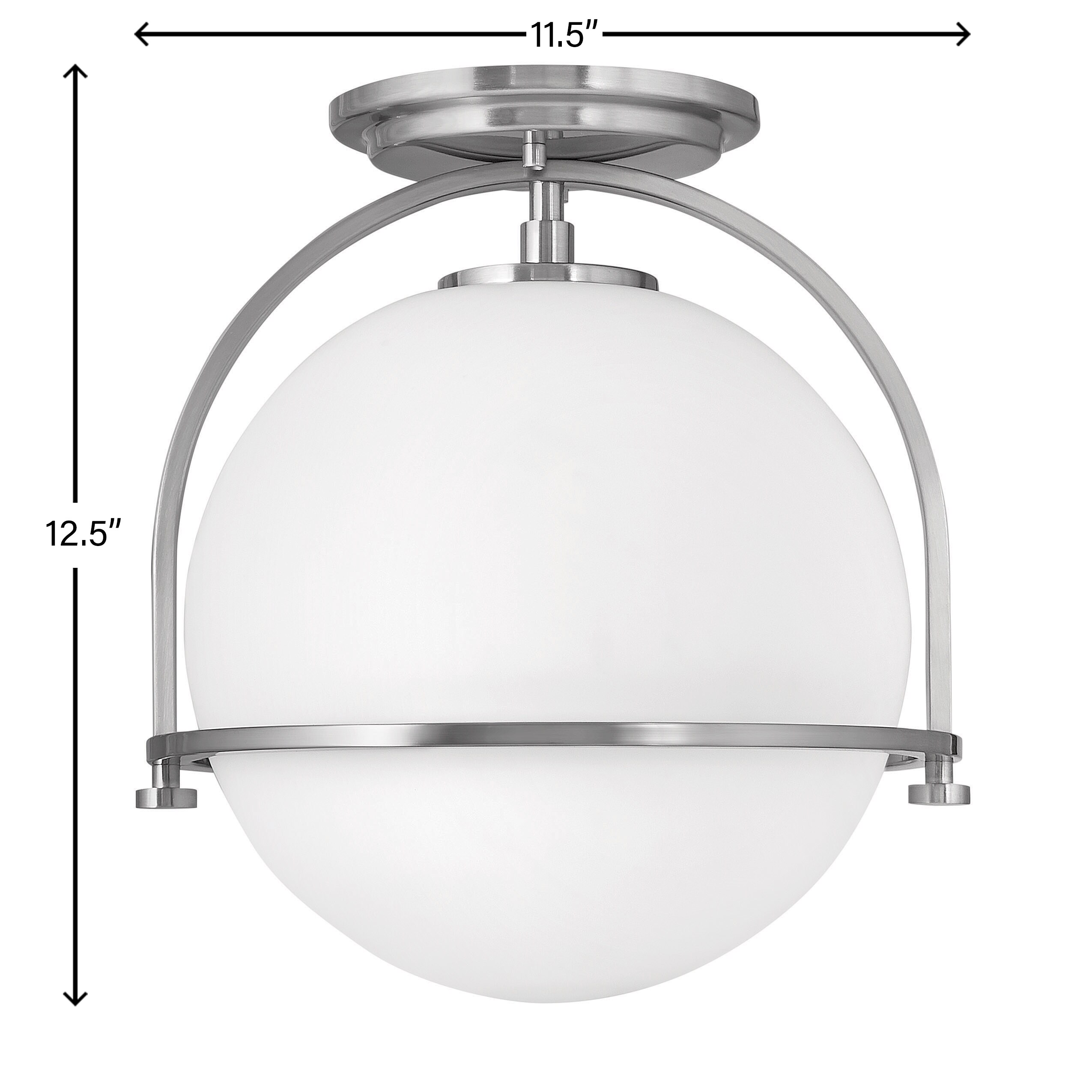 Hinkley’s Somerset Semi-Flush Mount Ceiling Light fixture fuses modern and vintage appeal. The centerpiece is a large, milky Etched Opal Glass globe, suspended from the canopy, floating inside a metal yoke and ring with decorative turned metal knobs. Illuminated by an 8w Medium LED bulb (not included), the gap between the ceiling and this chic fixture provides an abundance of ambient light while providing direct downward light and an uplit effect.