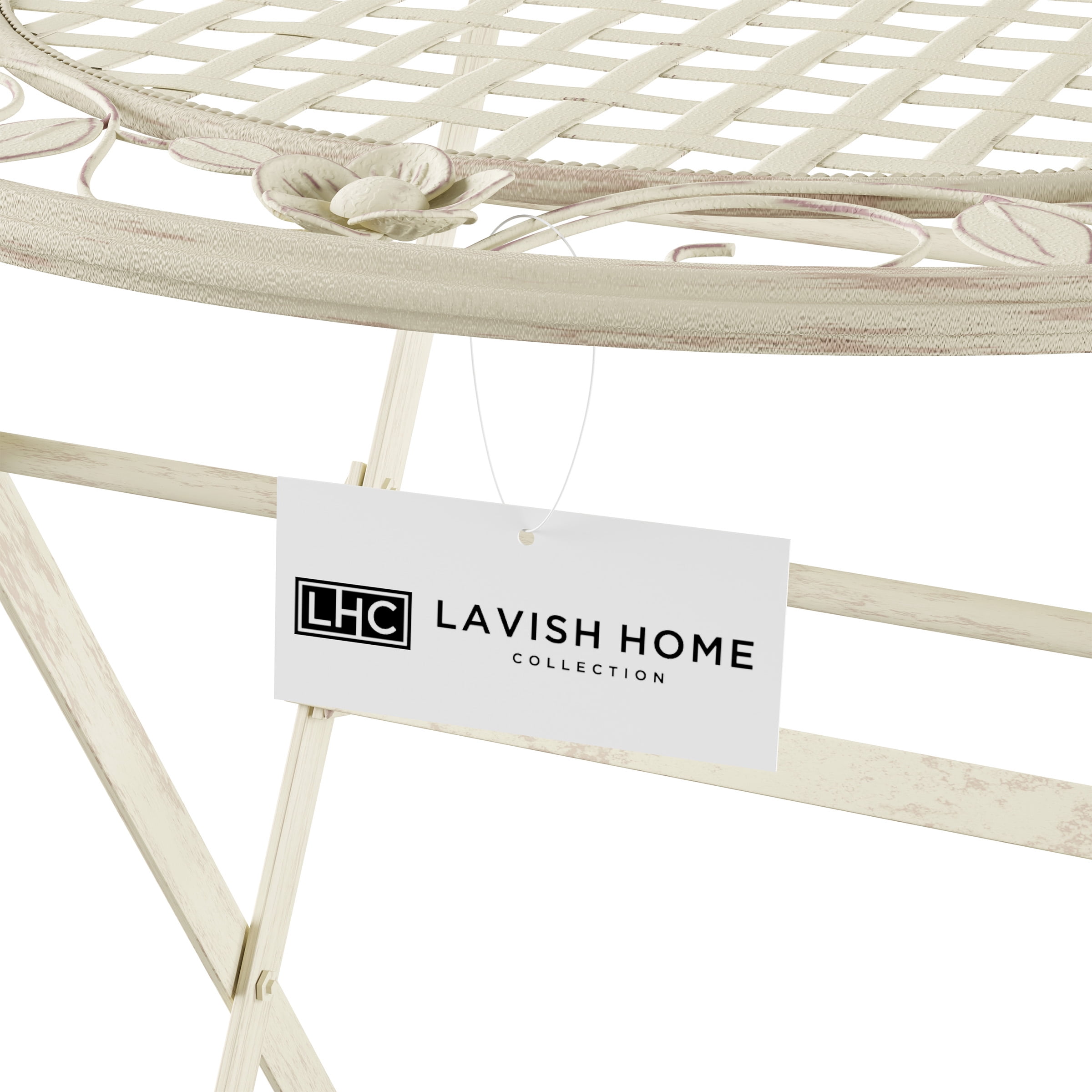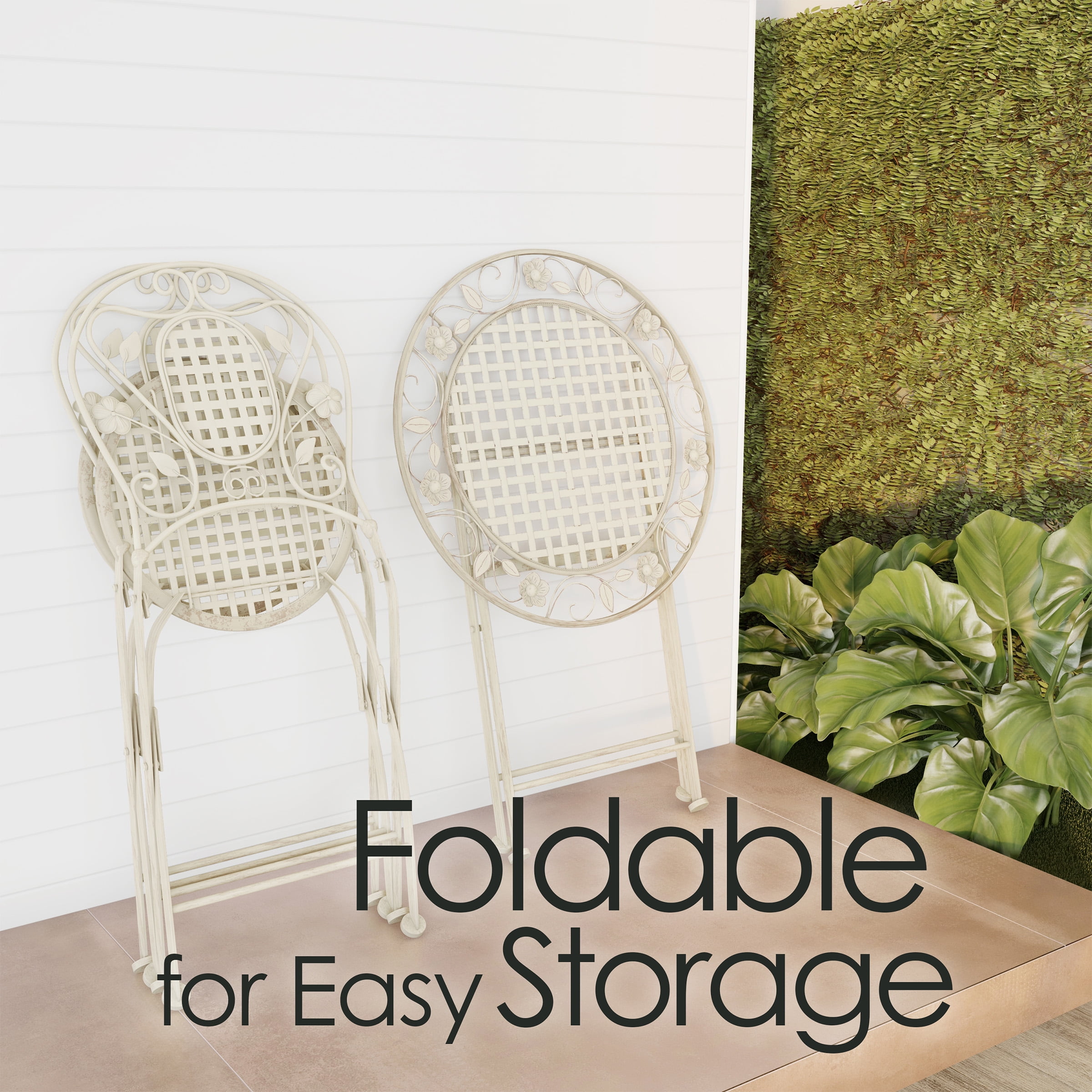 STYLISH AND FUNCTIONAL – The laser-cut lattice and leaf design and antiqued white finish lend an attractive look to this lovely bistro set that provides seating for up to two adults; it’s the perfect spot for an outdoor breakfast or evening drink INDOOR OUTDOOR – The table and round seat chair set make a fantastic addition to any indoor or outdoor area, while the powder-coated wrought iron frame ensures that it is rust, fade, chip, and crack resistant, and can stand up to the elements outside. FOLDABLE – The bistro set can be conveniently folded up for quick and easy storage during off-seasons or when it’s not in use. These furniture pieces are durable yet lightweight enough that they can be moved from place to place with no hassle. GREAT GIFT – This charming set is a wonderful piece for sunrooms, porches, patios, balconies, or pool areas and is sure to make a fantastic gift for birthdays, holidays, housewarming, weddings, and more. Materials: Powder-coated Wrought Iron. Table Dimensions: (Diameter) 27.25″ x (H)29.5″ Chair: (Seat Diameter) 15.75″ x (H) 37″ Weight: Table – 105 lbs; Chair – 264 lbs. Includes 1 table and two chairs.
