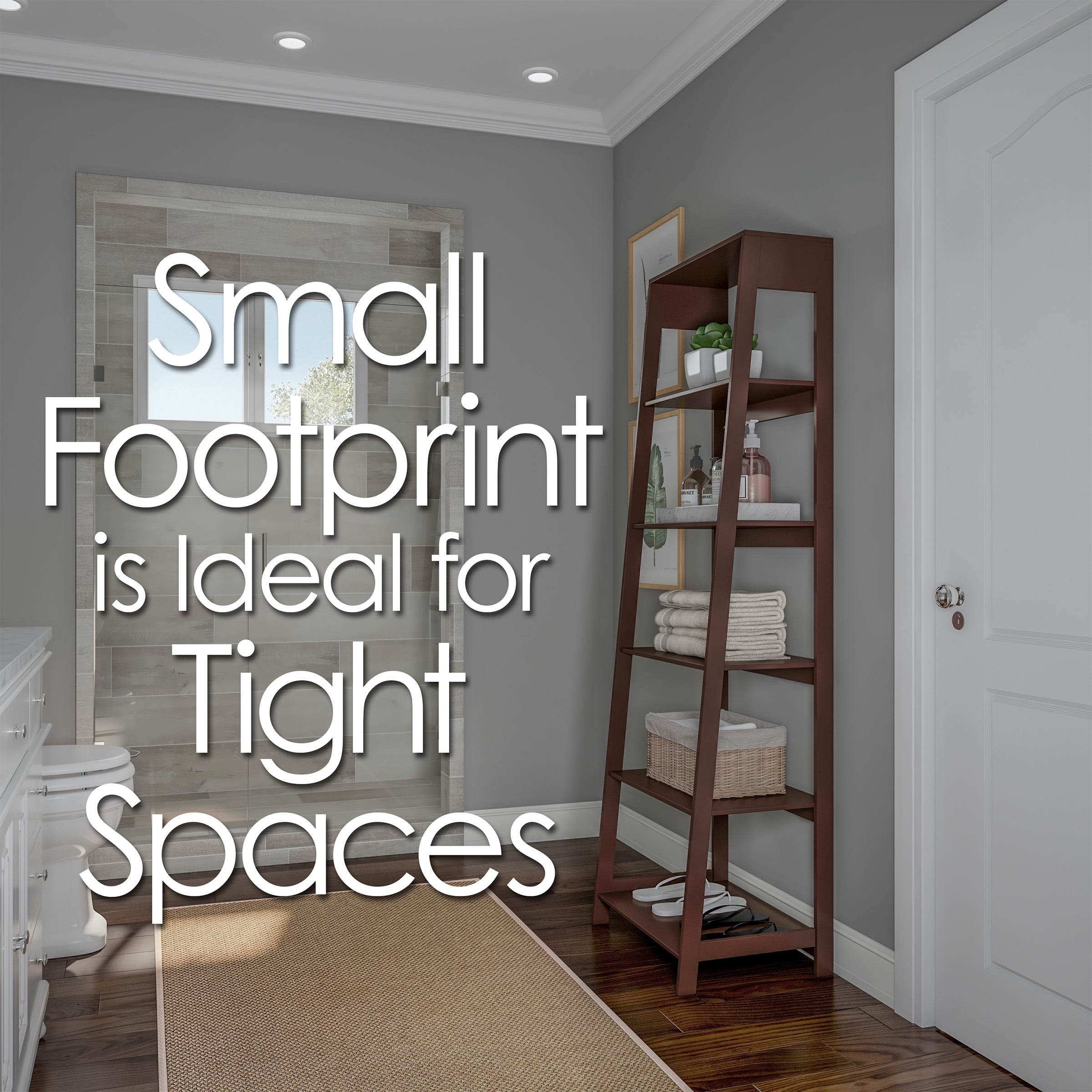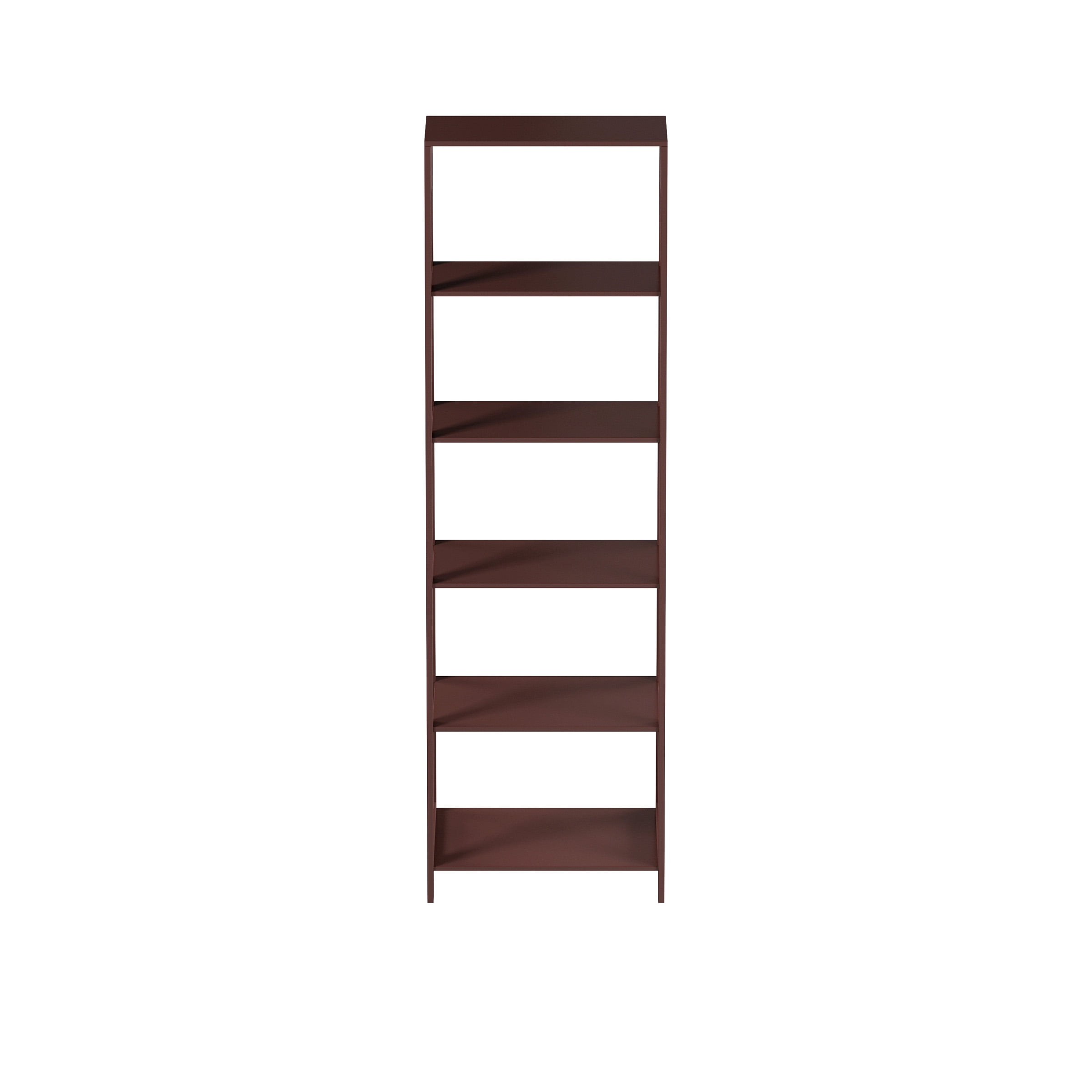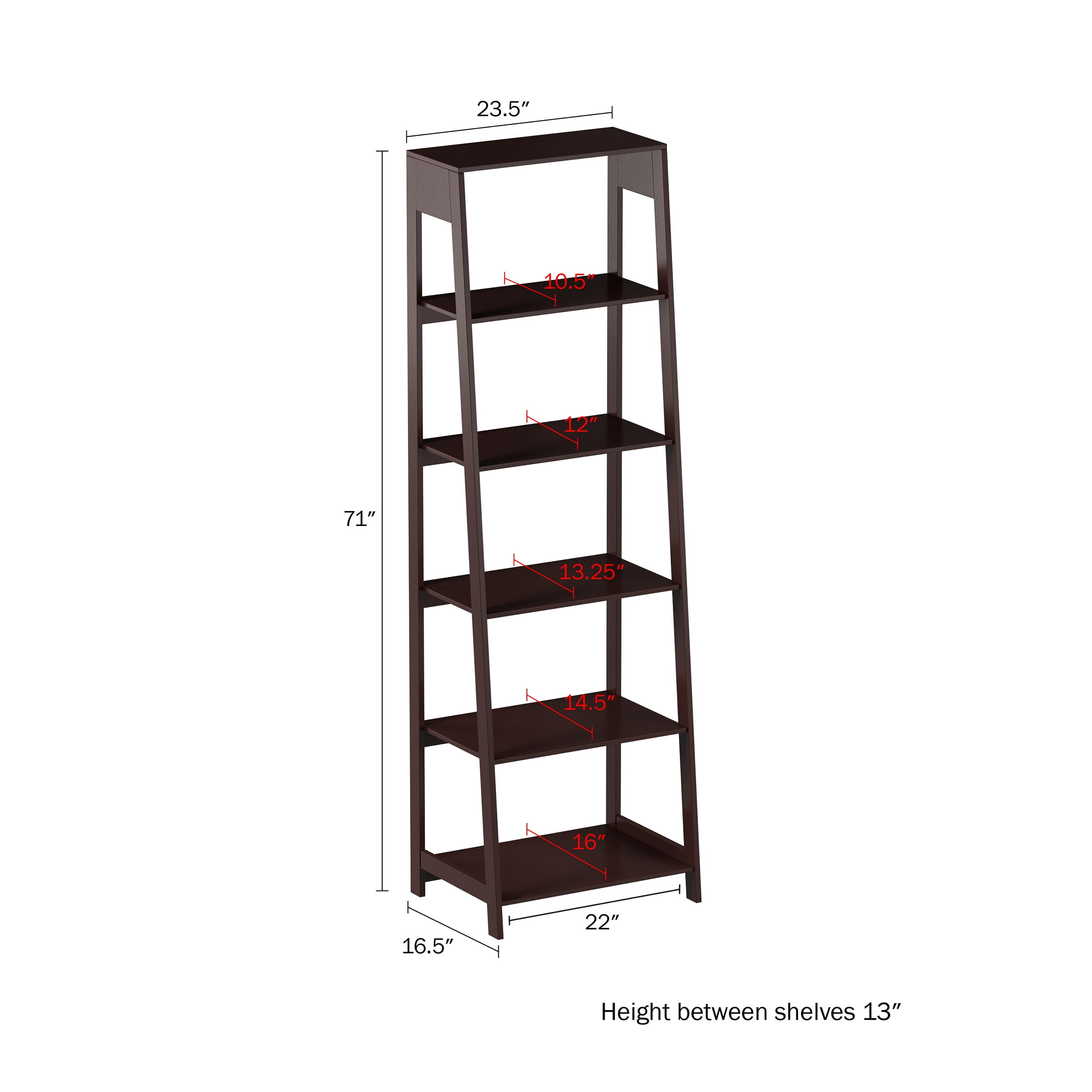 LADDER BOOKSHELF – With five shelves to display your belongings, the leaning look of this standing shelf can turn empty wall space into an attractive, purposeful focal point. 5-TIER BOOKSHELF – This home decor tall bookcase has five levels of shelves with 13-inches between each 22-inch-long shelf for displaying decorative items in an appealing manner. FREESTANDING – The small bookshelf features a straight back for added stability when placed against a wall and a descending angled design that maximizes storage while saving space. ATTRACTIVE AND STURDY – These manufactured wooden shelves have rims around each shelf and include anti-tipping hardware, creating a sturdy platform to display small decor. MATERIALS – Painted MDF Wood. DIMENSIONS – (L) 23.5″ x (W) 16.5″ x (H) 71″; Shelf Length: 22″; Distance Between Shelves: 13″. COLOR – Brown.