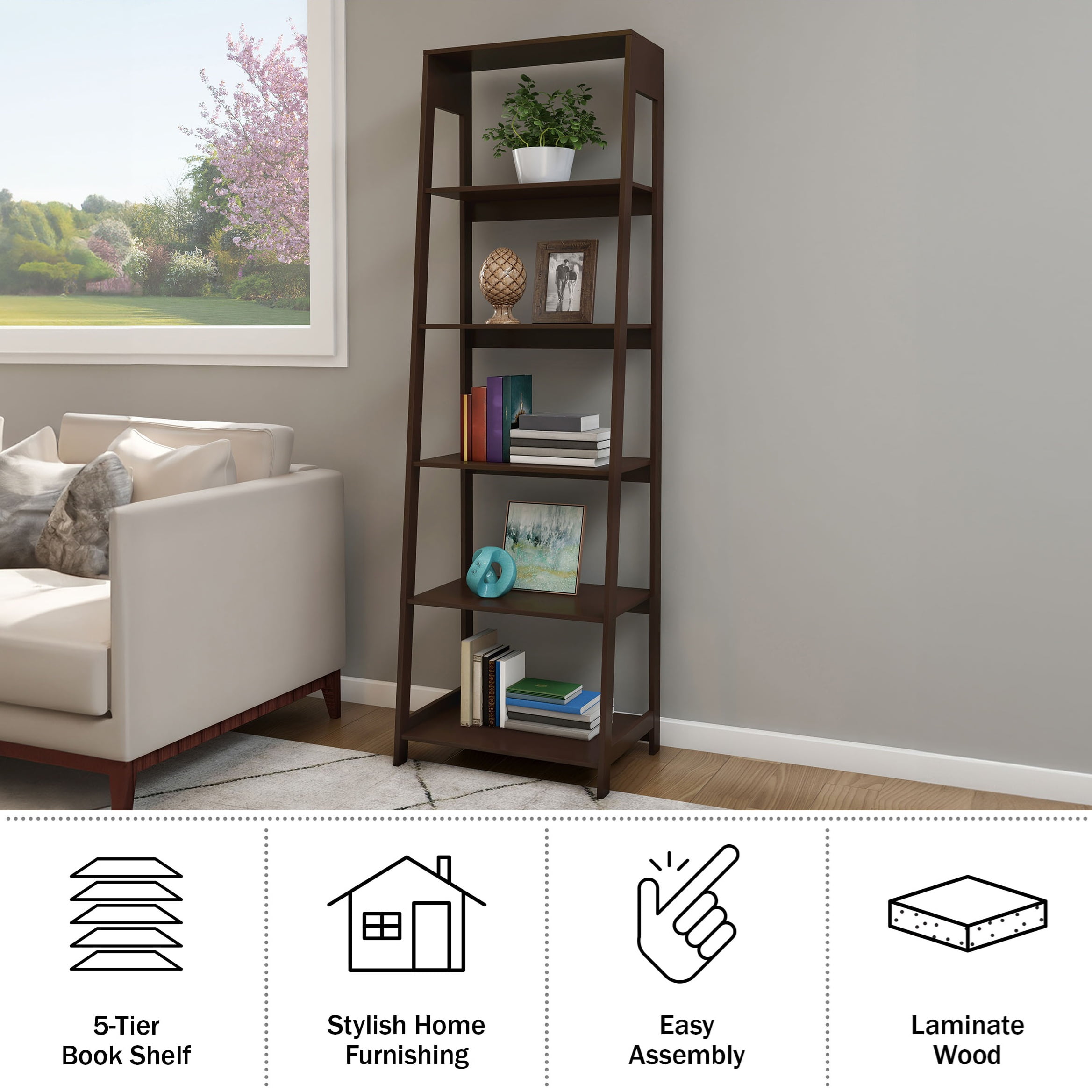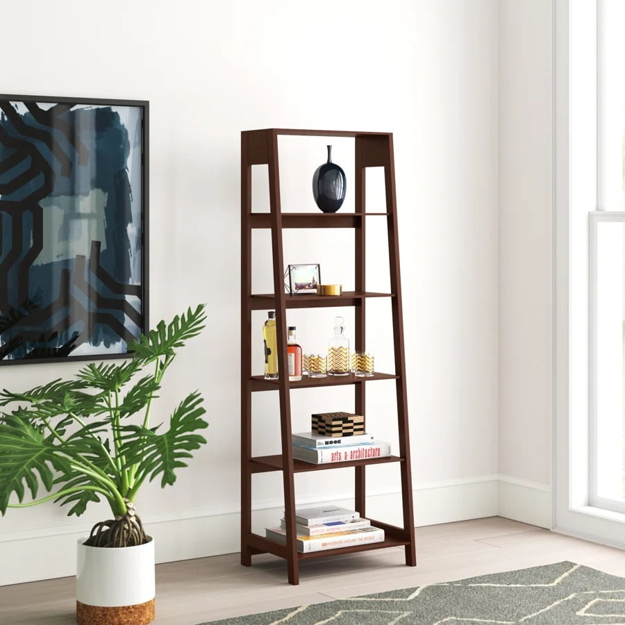 Lavish Home 5-Tier Ladder Bookshelf, Leaning Decorative Shelves for Display – Wood Shelf for Living Room, Bathroom, and Kitchen Storage, Dark Brown