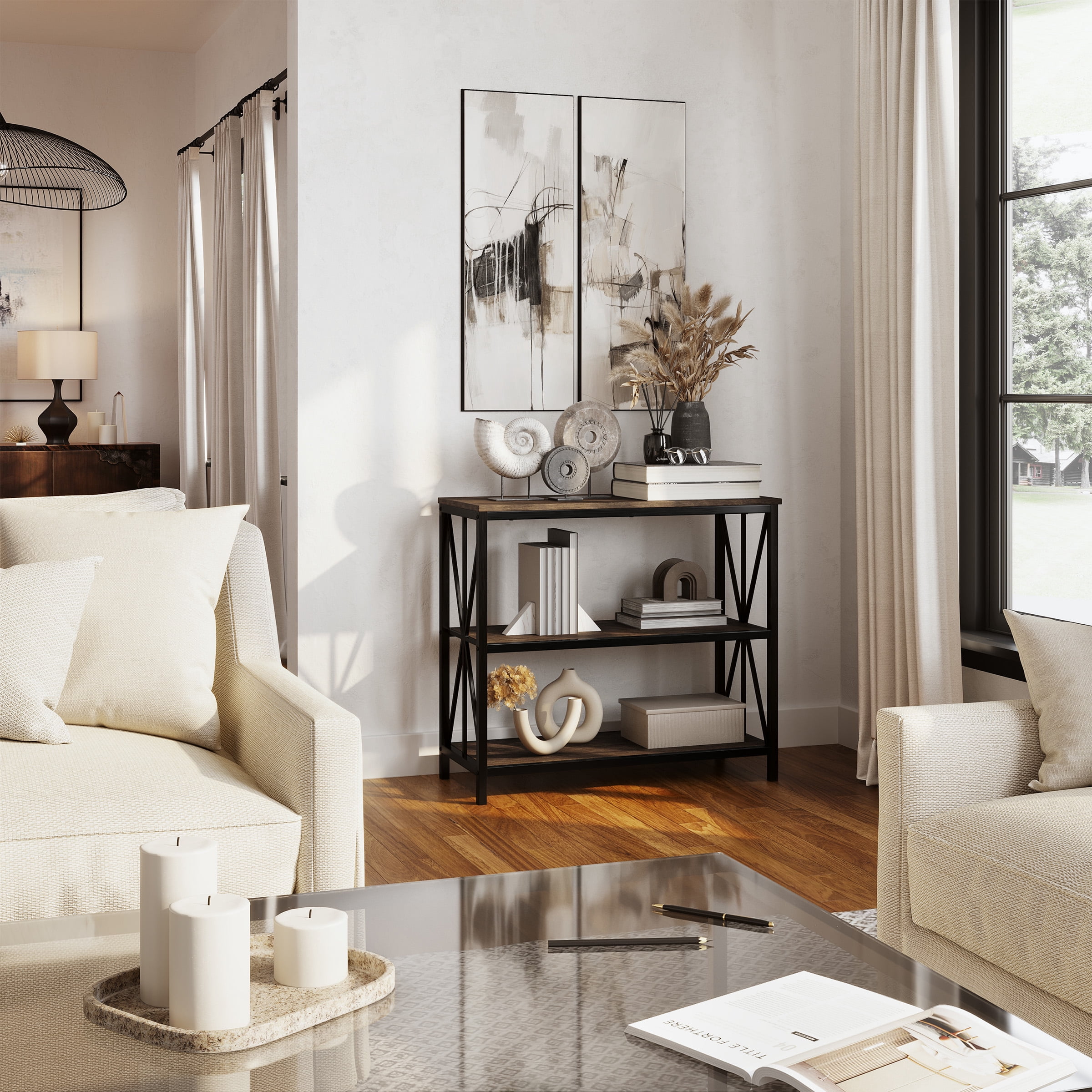 DISPLAY SHELF: Plenty of room for displaying books and picture frames, the shelves have 12 or 13 inches between them for an open look that maximizes limited floor space. VERSATILE USE: The bookshelf has a stable frame so it can stand on its own and will be a perfect addition to a living room, bathroom, bedroom, kitchen, or any area of the home. INDUSTRIAL STYLE: The Etagere style bookcase features a powder-coated steel frame painted in black and laminate-covered shelves with a barn wood look that will complement any decor. QUALITY MATERIALS: After a quick assembly, this sturdy industrial bookshelf consists of MDF wood, solid steel framing, and anti-tipping hardware for maximum stability and safety. MATERIALS: Engineered Wood and Alloy Steel. DIMENSION: (L) 35.5″ x (W) 15″ x (H) 31.25″. COLOR: Brown Woodgrain.