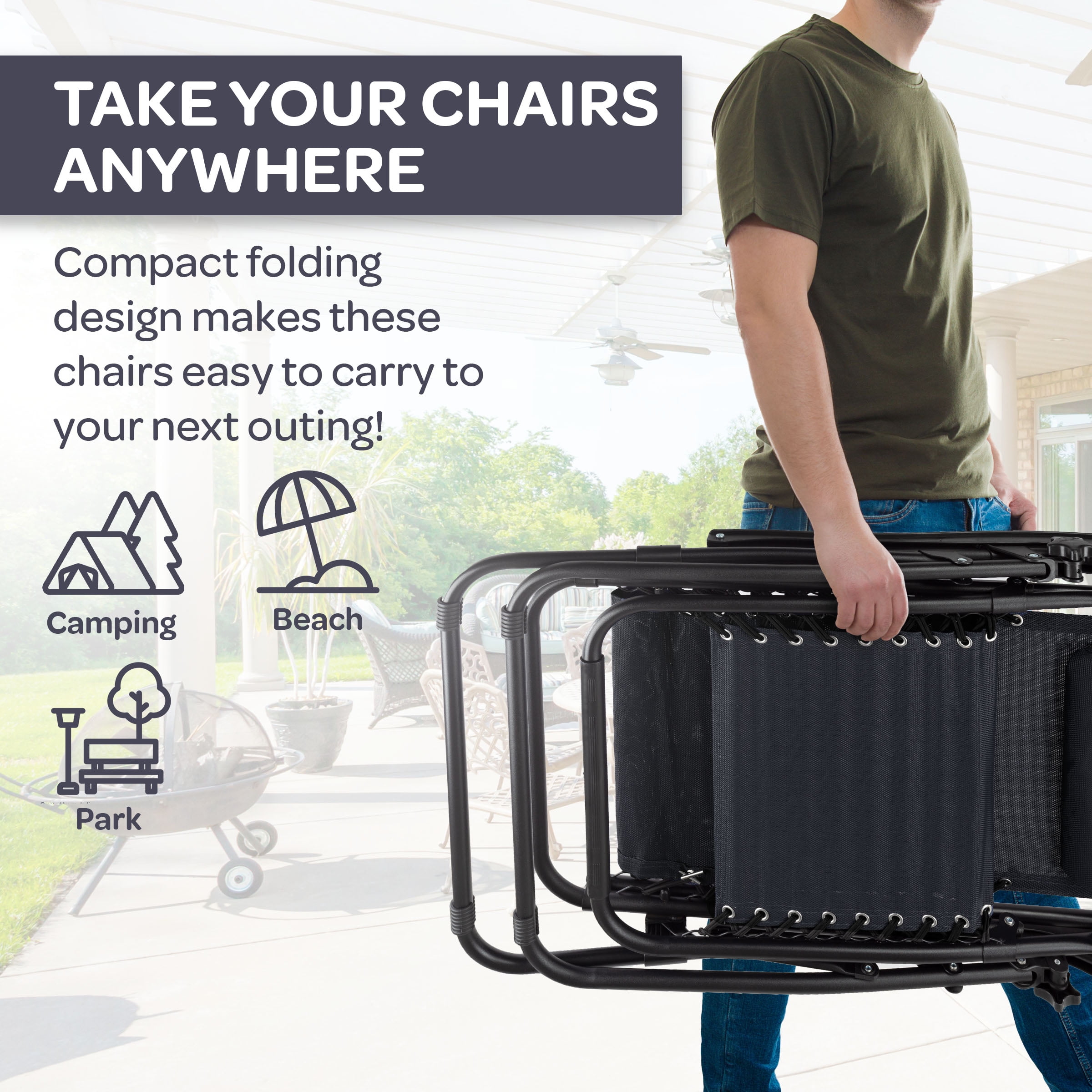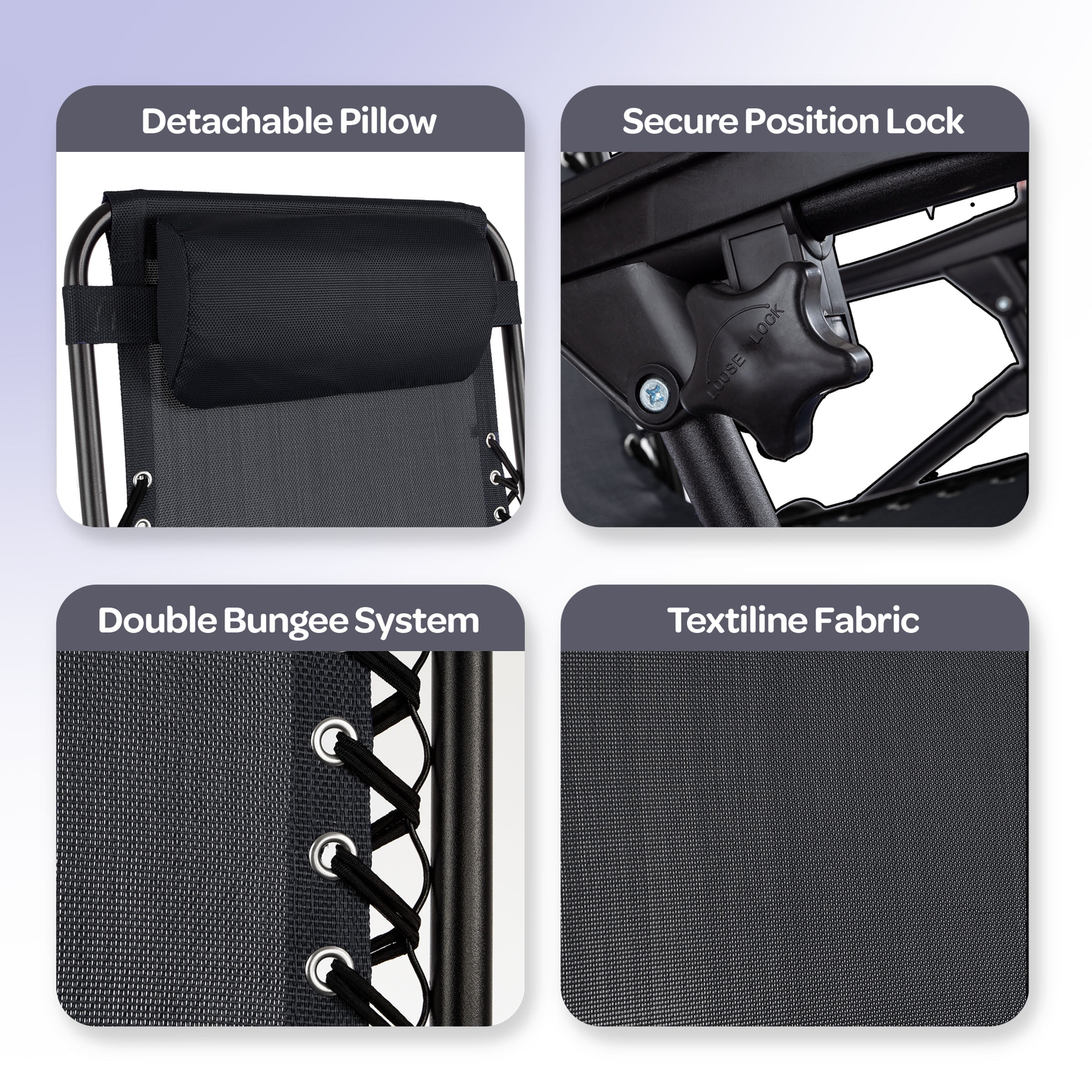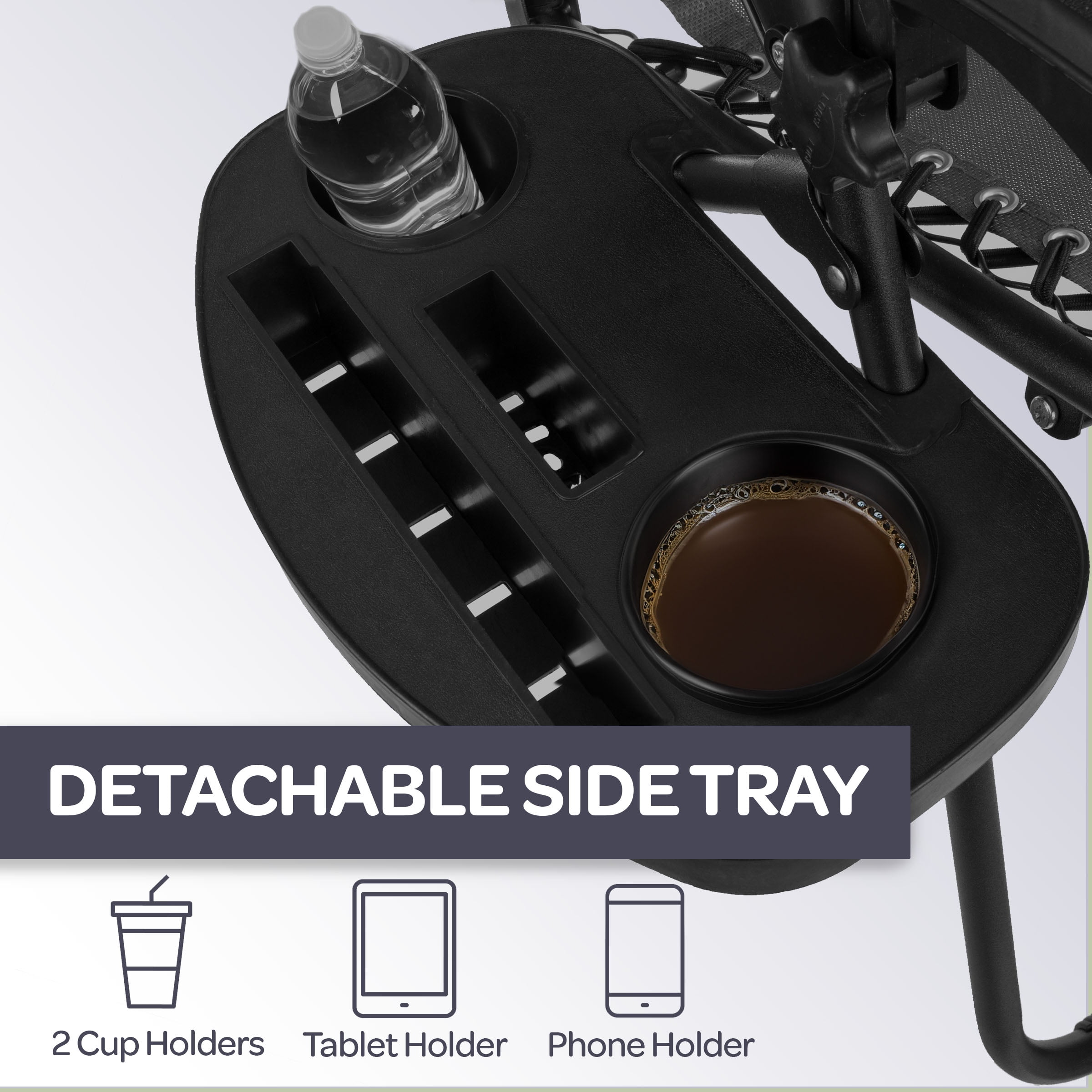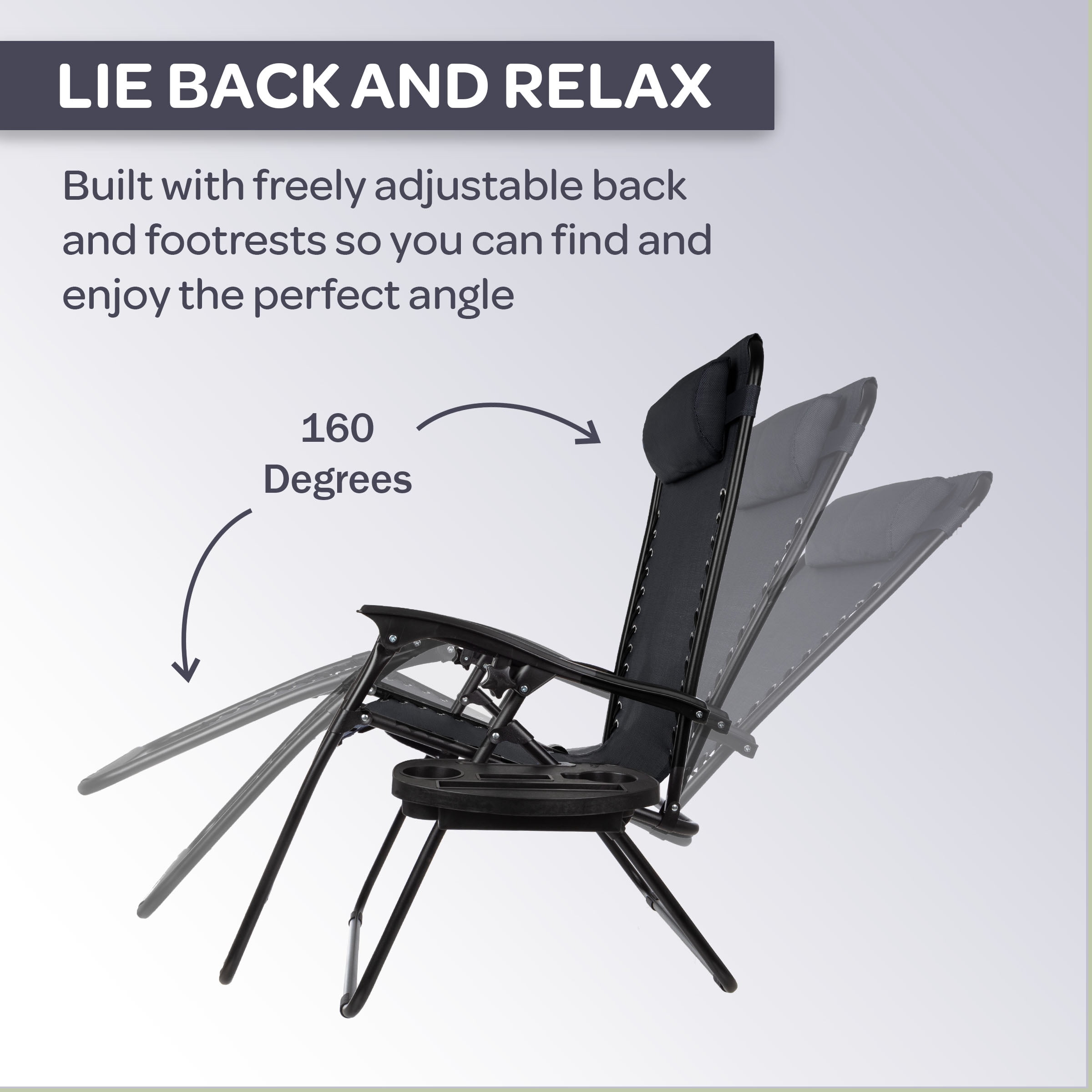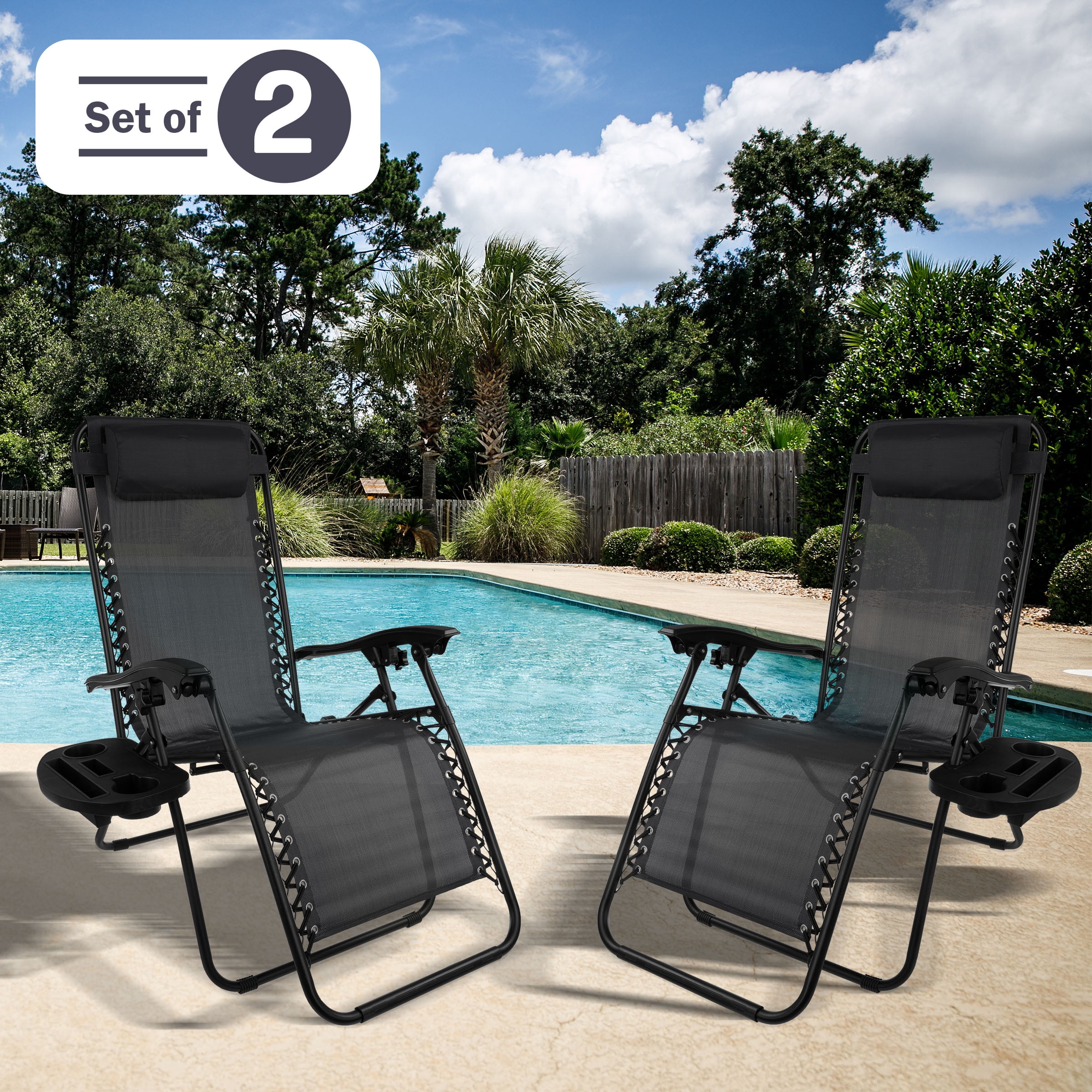 ZERO GRAVITY CHAIRS SET OF 2 – Lock in your favorite lounging position to ease pressure on your knees, neck, and spine while seated in this set of 2 patio, beach, or camping chairs. RESILIENT FABRIC – Trust in the wear-resistant Textilene fabric seats and backs of the outdoor furniture to hold up to the elements, while the mesh design makes these camping chairs breathable. STURDY FRAME – Each camp chair features a tubular steel frame with a double bungee cord design and durable fabric designed to support up to 300lbs each. EXTRA FEATURES – An adjustable padded pillow and detachable tray table are included with these lawn chairs, providing extra comfort and space for drinks, camping accessories, and electronics. MATERIALS – Powder-Coated Steel and Textilene Fabric. DIMENSIONS – Open: (L) 63.5″ x (W) 25″ x (H) 43″; Folded: (L) 25″ x (W) 5.5″ x (H) 37″; Weight Capacity: 300lbs per Lawn Chair. COLOR – Black.