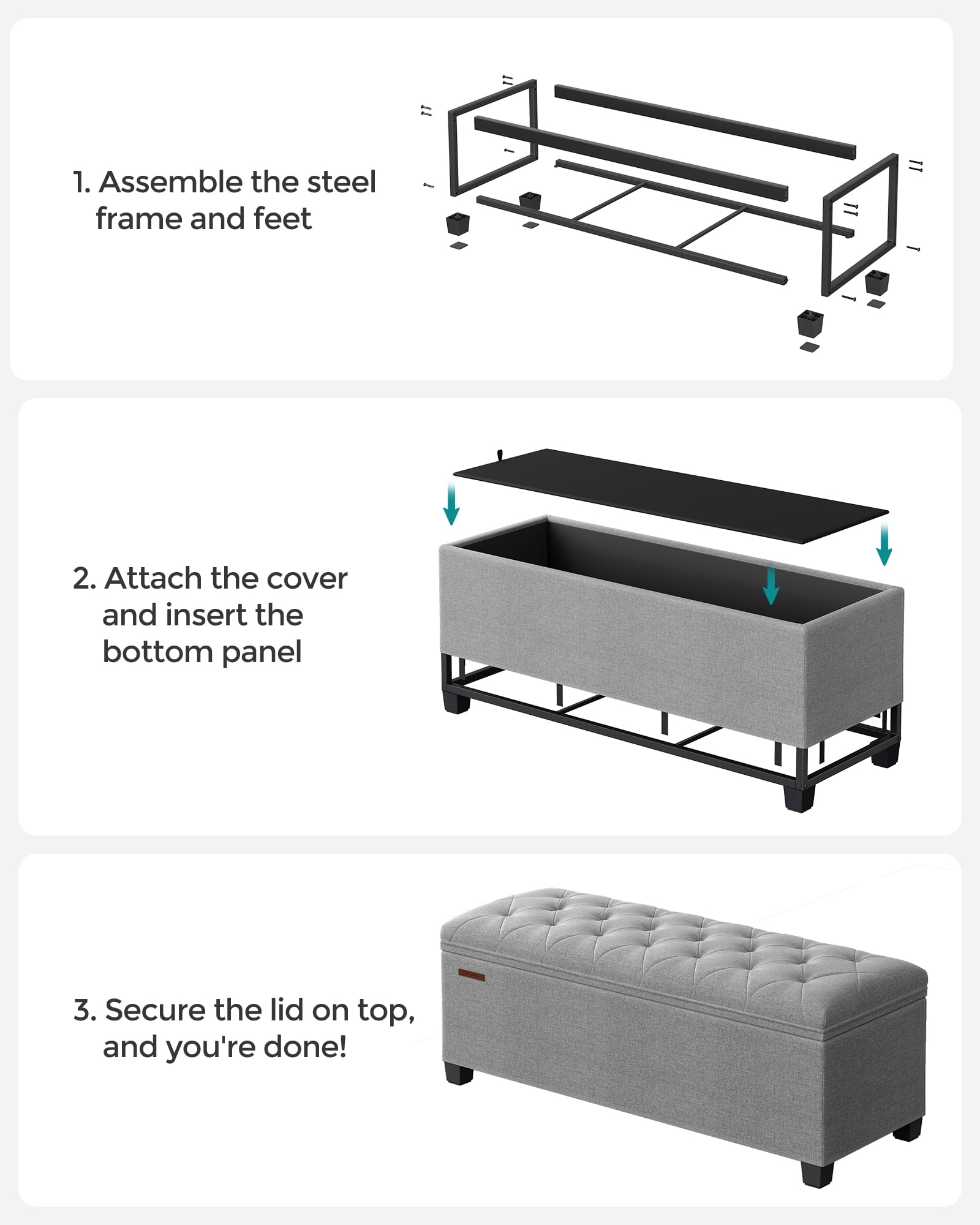 Enough Storage Space: The ottoman with storage provides enough storage space. Use the large storage ottoman to store extra throw blankets, pillows, toys, magazines, or other items, keeping them within reach but neatly out of sight. Multifunctional Using: The storage bench cube not only brings a touch of elegance to your interior, but also can be used as a sleeper sofa coffee table to spend your leisure time, it can also provide extra seating and storage space for your living room and bedroom, a comfortable rest for your tired feet, and an extra stool for your friends. Stable and Strong: Our large ottoman with storage is crafted with a robust steel frame, quality MDF top, and premium linen-look fabric. This bench with storage can hold up to 660 lbs. of weight (static load capacity). With or Without Cover: Use this storage ottoman with the fabric cover to match your elegant interior decor or without the cover to blend into the modern simple interior decor. Easy Assembly: We provide you with detailed graphic assembly instructions and spare parts. You don’t need to worry about assembly.