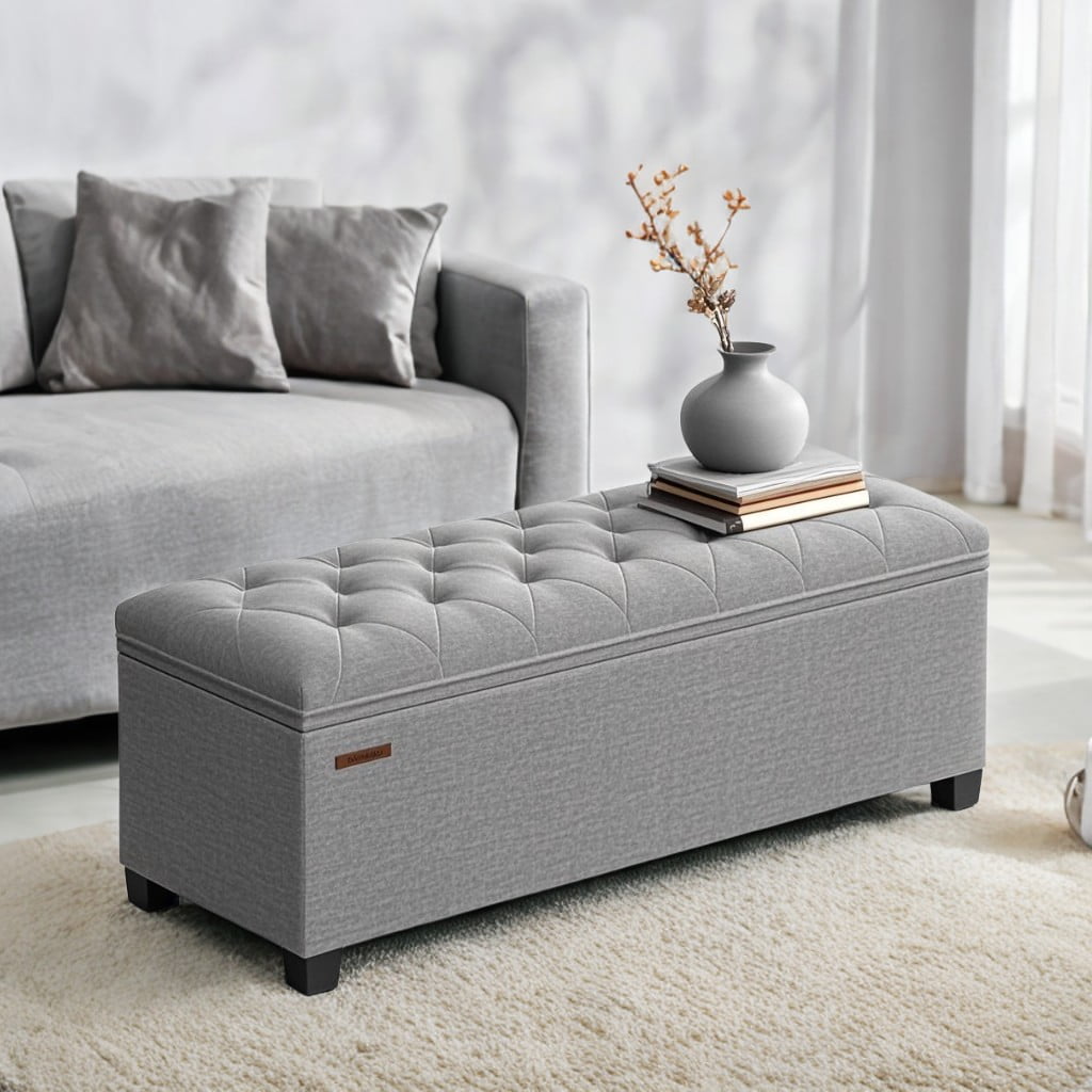 SONGMICS 43.3″ Storage Ottoman Bench Ottoman with Storage Hold up to 660lbs Bedroom Bench for Entryway Living Room Light Gray