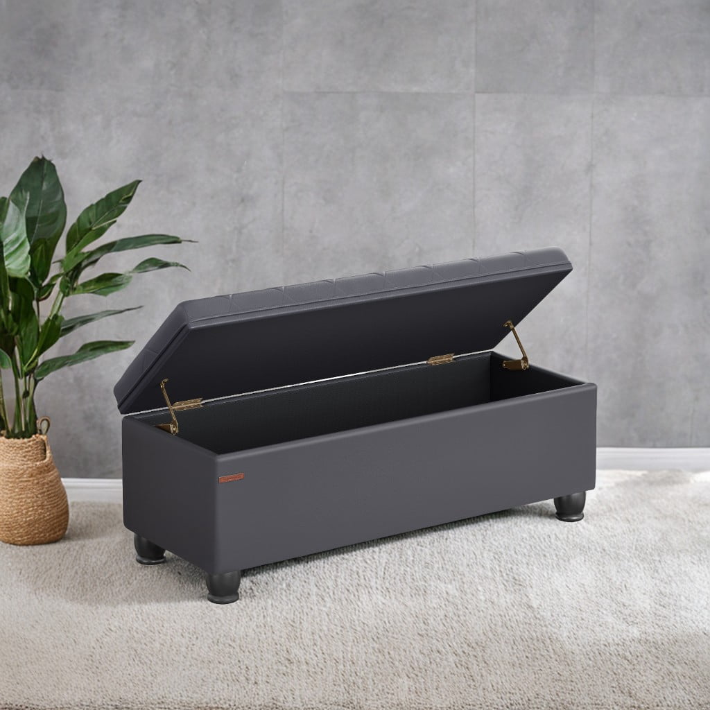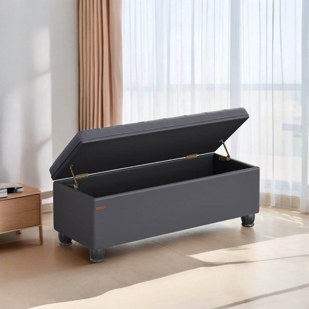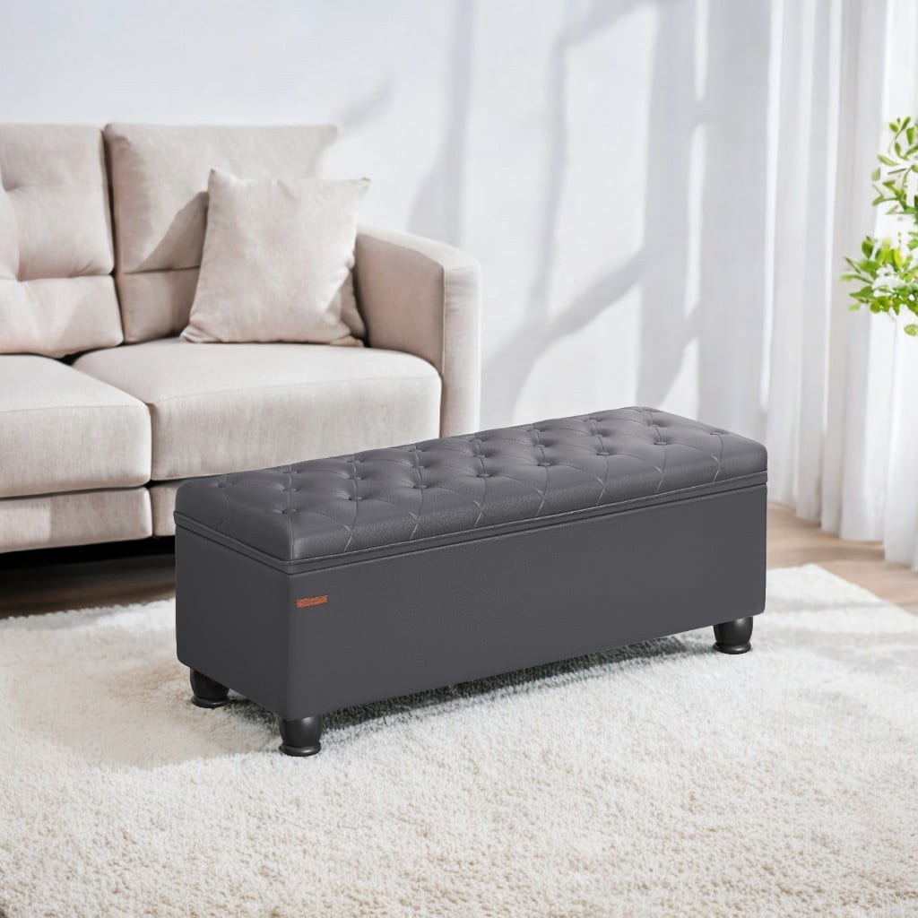 Large 46.5-inch ottoman bench with a roomy hidden compartment for blankets, pillows, or clutter. Supports up to 330 lbs, perfect for daily use as a seat or footrest. Easy-to-clean, stylish synthetic leather design complements any bedroom decor. Ideal as an end-of-bed bench, extra seating, or storage solution. Combines functionality and elegance without taking up extra space.