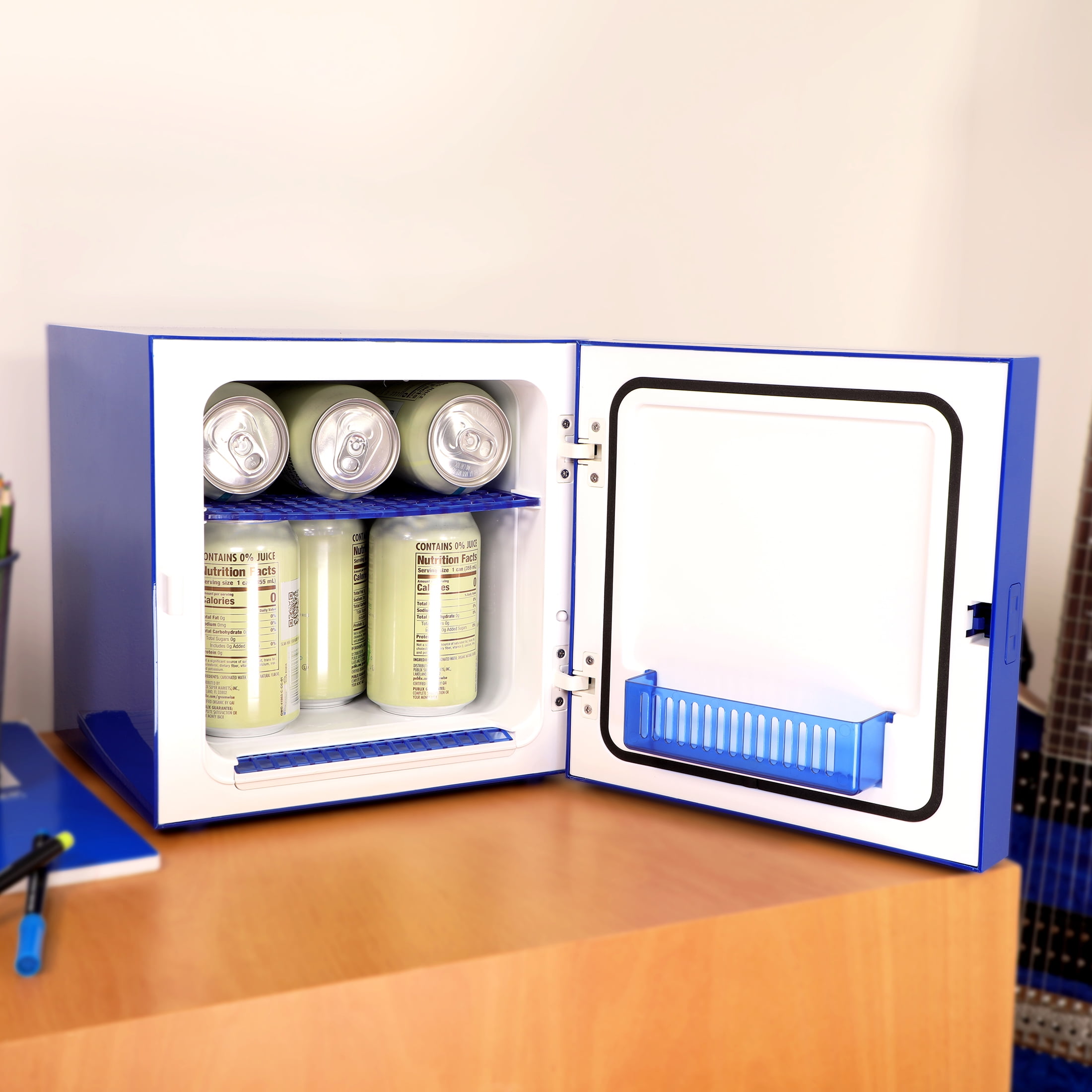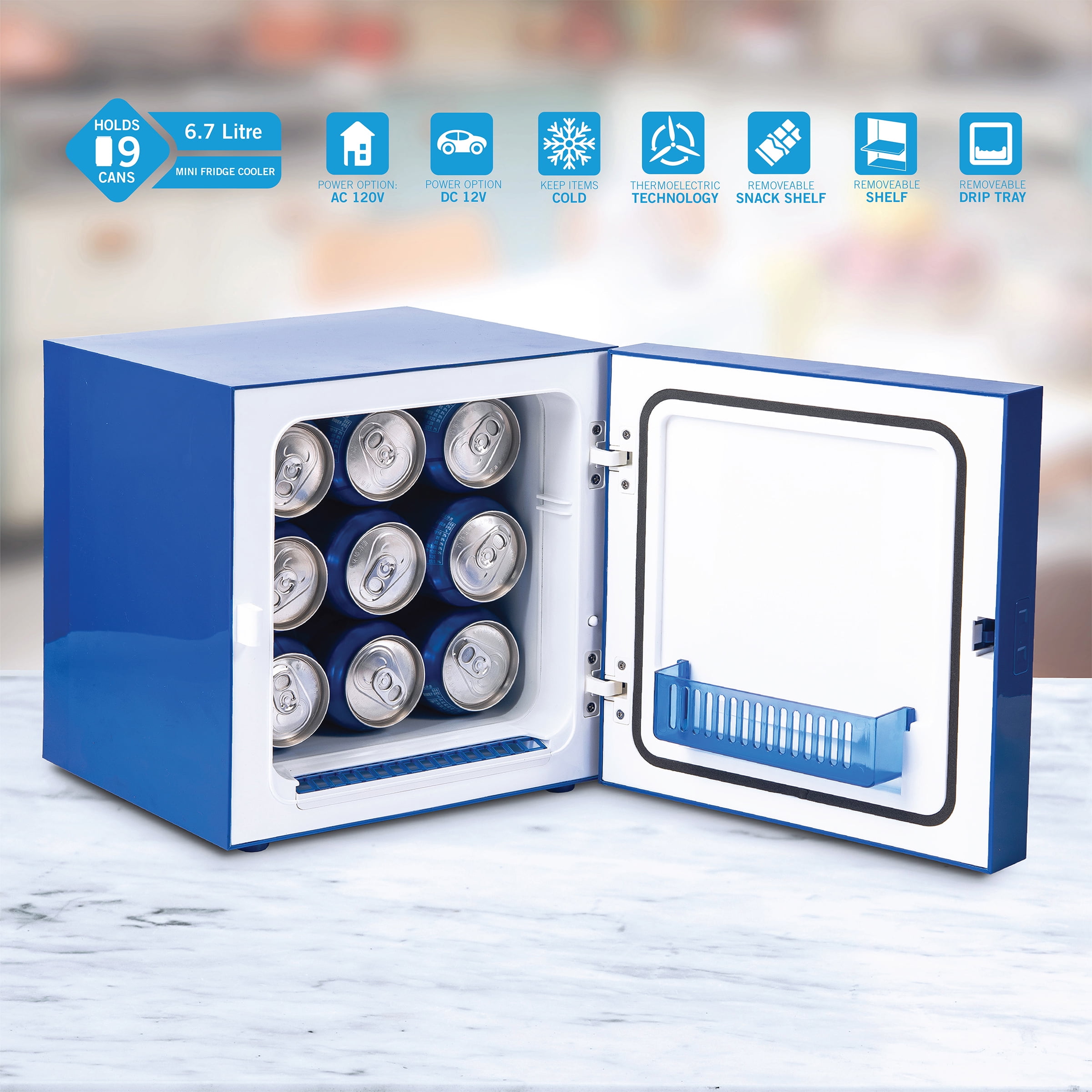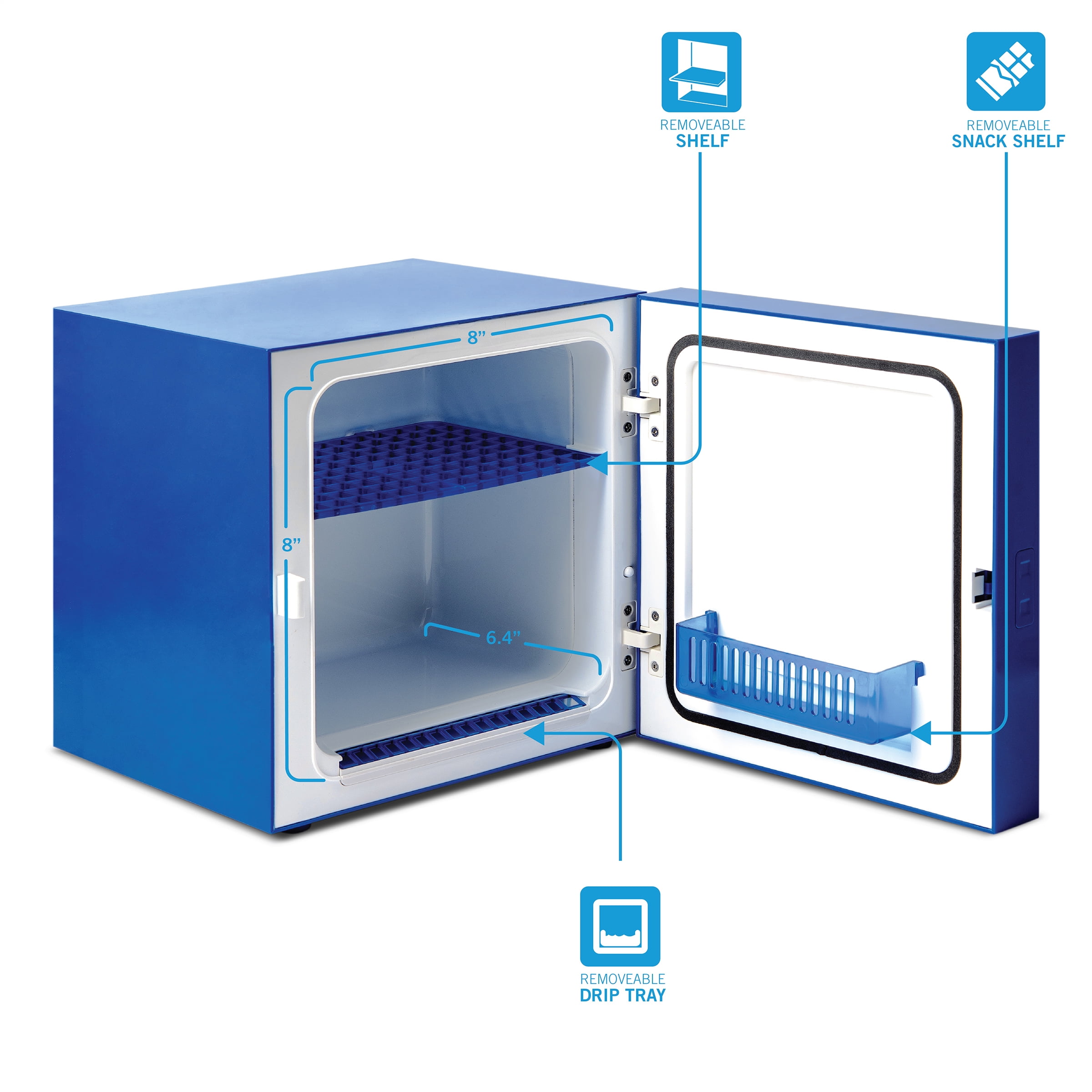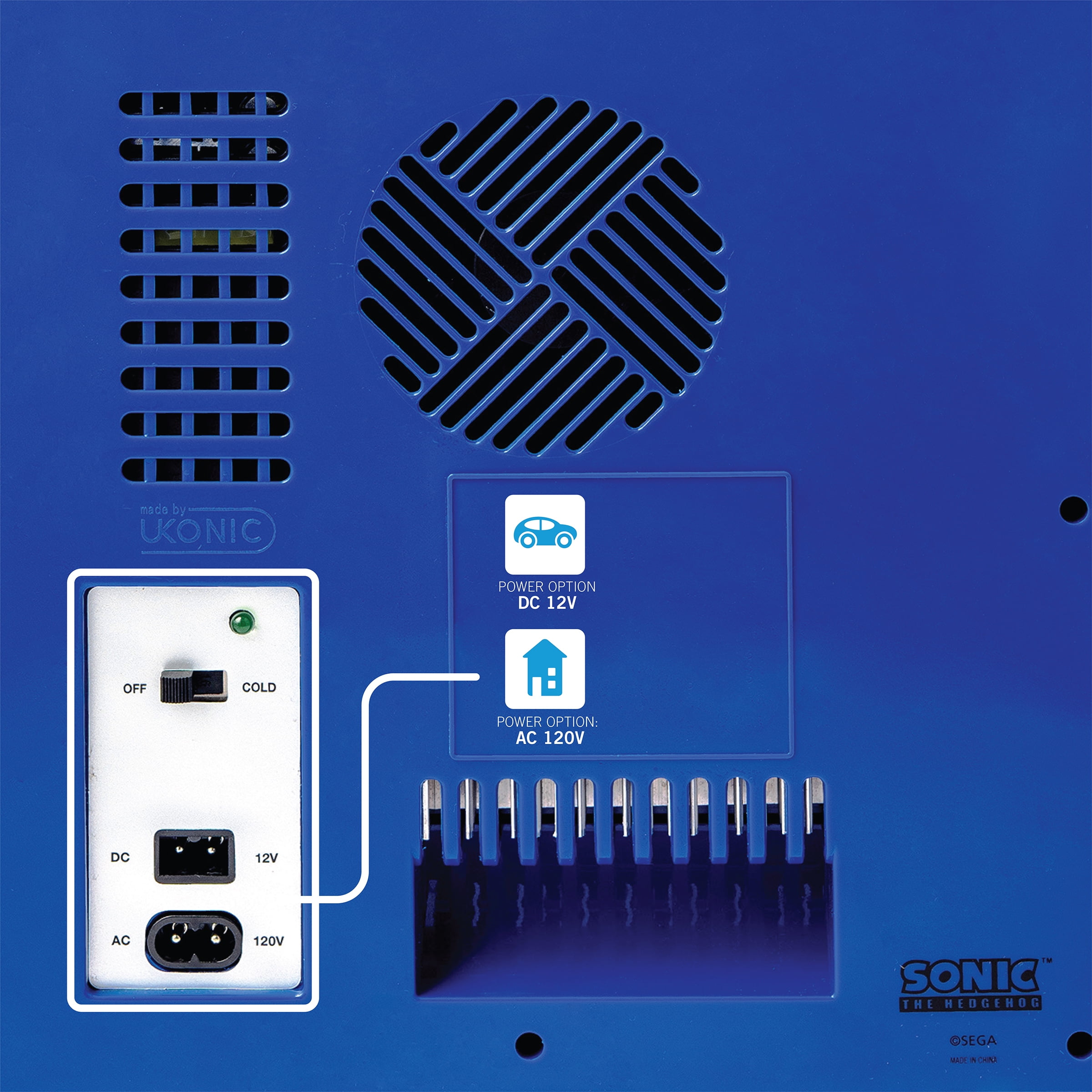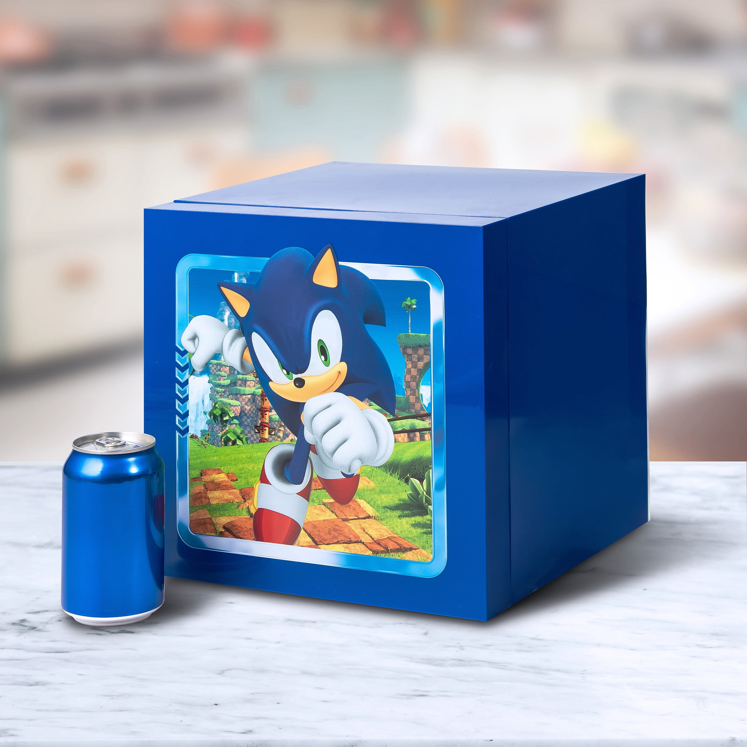 Sonic 6.7L The Hedgehog Blue Cooler Mini Fridge Classic Video Game Cool: Thermoelectric cooler with Sonic the Hedgehog on the front Compact Size Fits Anywhere: 10.4″ tall x 10″ wide x 10″ deep Stay Hydrated on the Go: Perfect for your dorm, office, gaming setup, or even your car, truck, or RV Power Up: 6.7 L capacity—holds up to 9 12 oz. soda cans Green (and Blue) Technology: Engineered with thermoelectric technology, free from CFCs and refrigerants Chill Out: Cools to 36°F below ambient temperature The Entire Package: Includes cooler, 120V AC power cord, shelf, 12V DC cable (vehicle power), removable shelf, door shelf, and instructions
