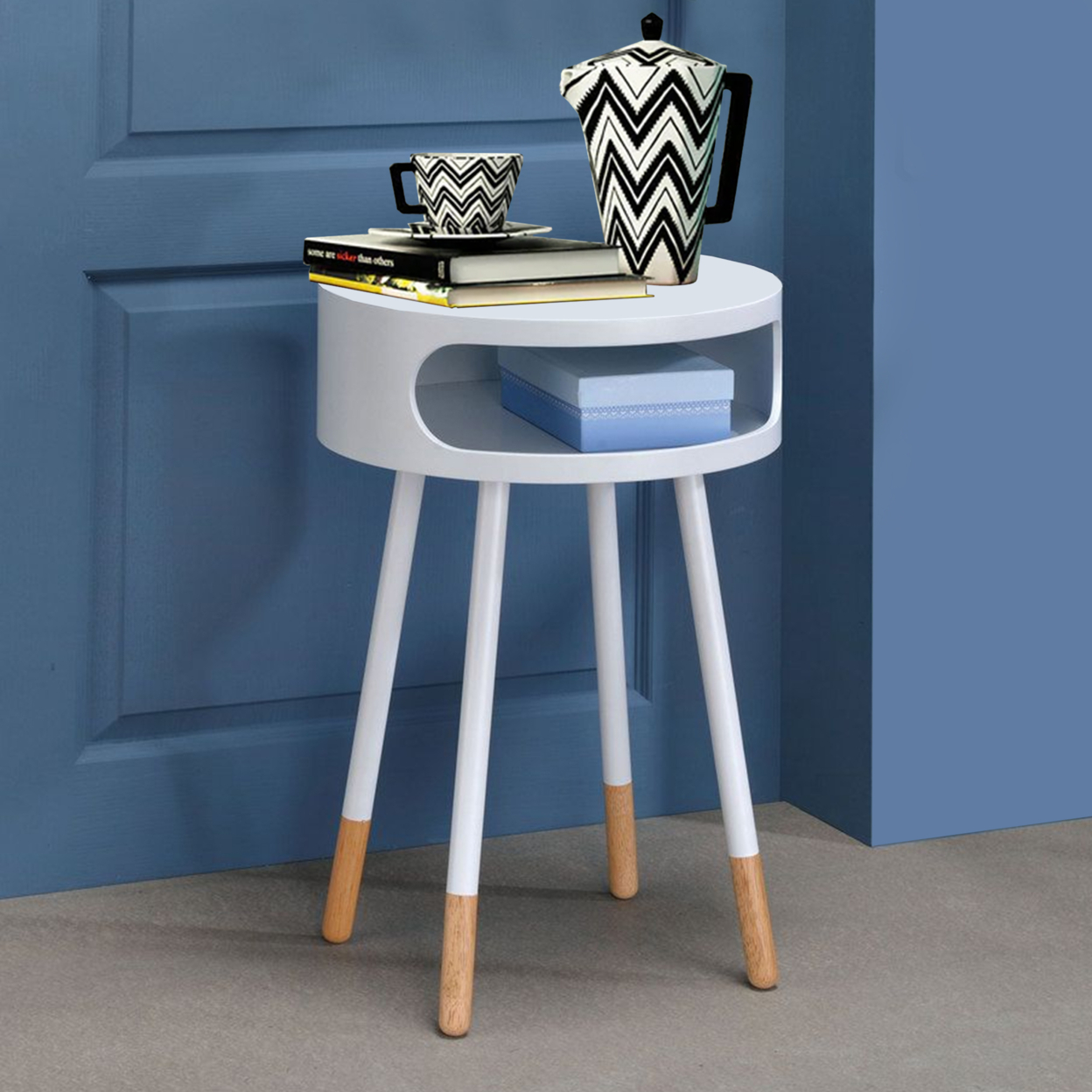 Sonria Round End Table White and Natural – Saltoro Sherpi This Sonria round end table in white offers a contemporary take on a stylish retro design ideal for your living room family room or bedroom! With its one shelf you can conveniently store remote controls or other small items in the open compartment. The natural wood featured at the base of the legs provides that extra flare to bring any room together. Some assembly required.