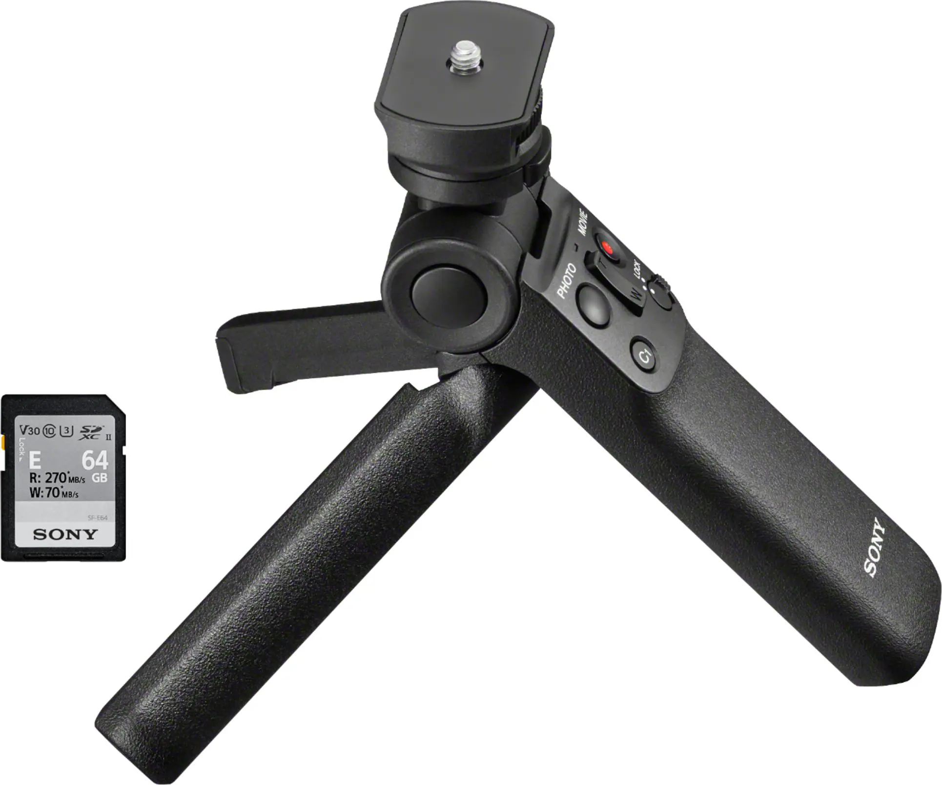Includes wireless Bluetooth grip GP-VPT2BT that conveniently converts into a small tripod and 64GB UHS-II SD card SF-E64/T1 with fast write speeds.