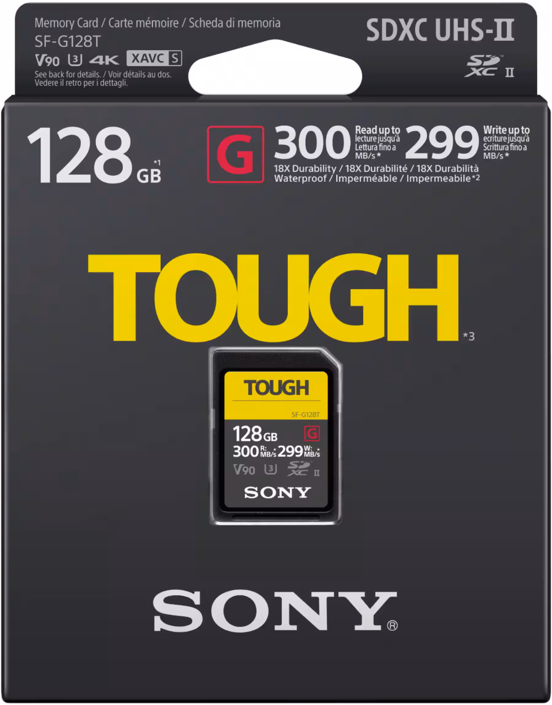 SF-G series TOUGH specification UHS-II SD memory cards, the tough and fast SD card, 18 times stronger4 than standard SD card with an ultra rugged design that is bend-proof, drop-proof to 5m, waterproof, and dustproof, and up to 300MB/sec. read, 299MB/sec. write2 speeds.